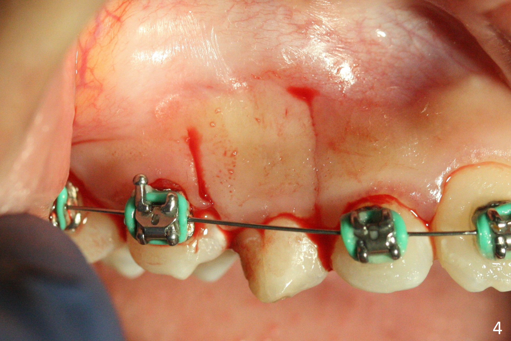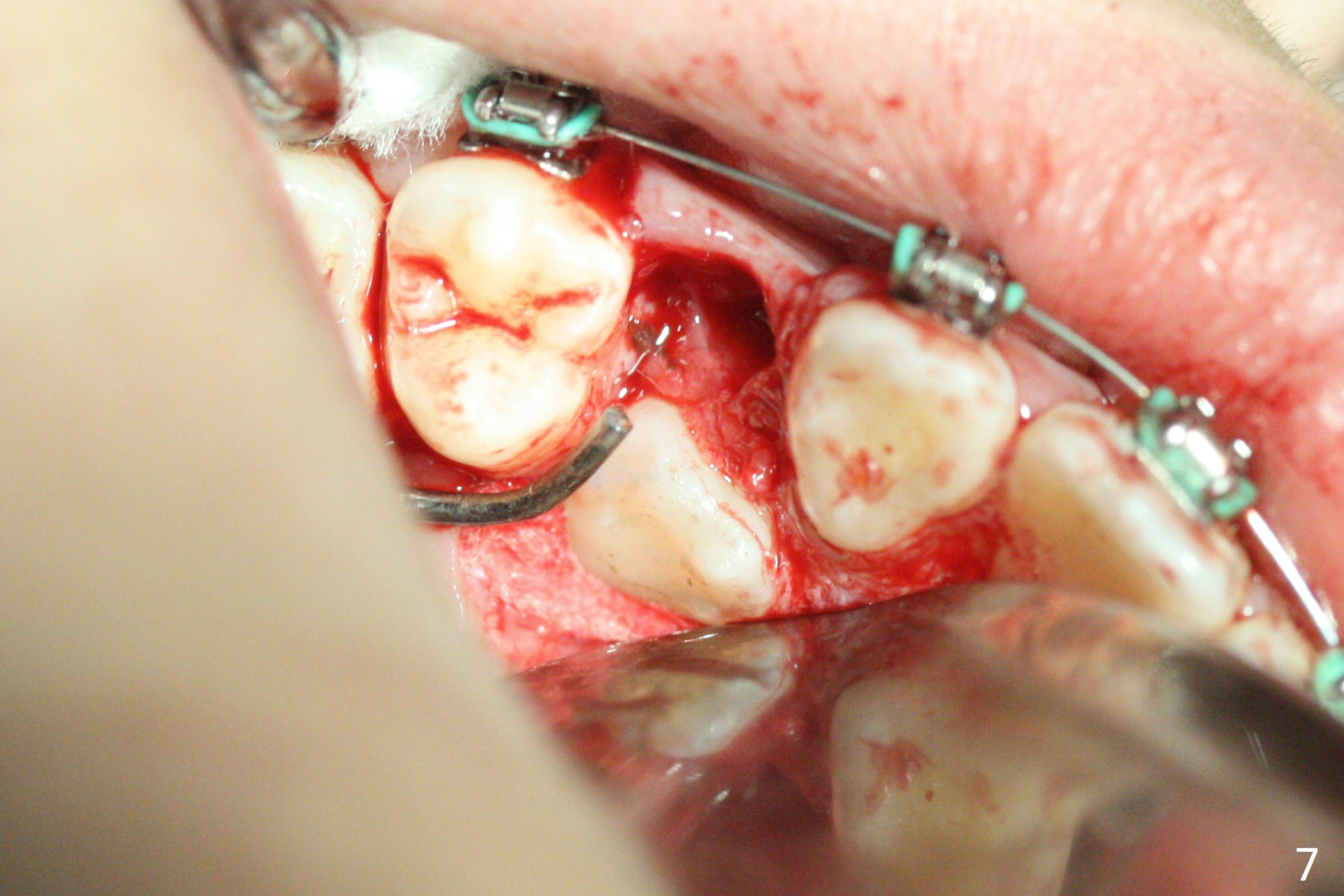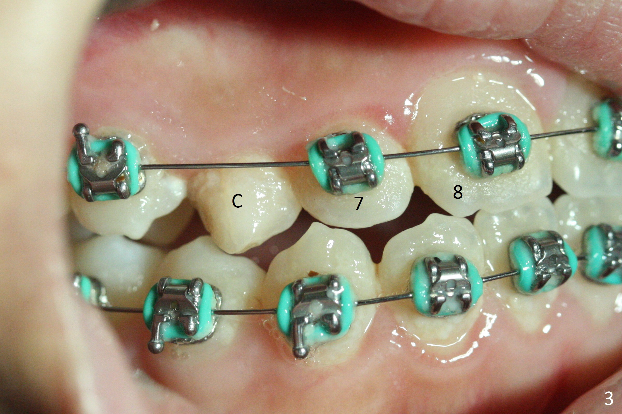 A 13-year-old woman has an impacted canine (Fig.1 (6)) and retained deciduous one (C). After initiation of orthodontics, she returns for surgical access to the impacted canine and placement of device to facilitate eruption (Fig.2,3). Incision is made buccal (Fig.4), but there is no tooth buccal (Fig.5). Extraction of the deciduous canine does not reveal the impacted one (Fig.6), but there is palatal elevation (*). Palatal access shows the impacted tooth (Fig.7) and allows placement of a retraction device (Fig.8). Careful clinical exam and CBCT are necessary diagnostic steps.