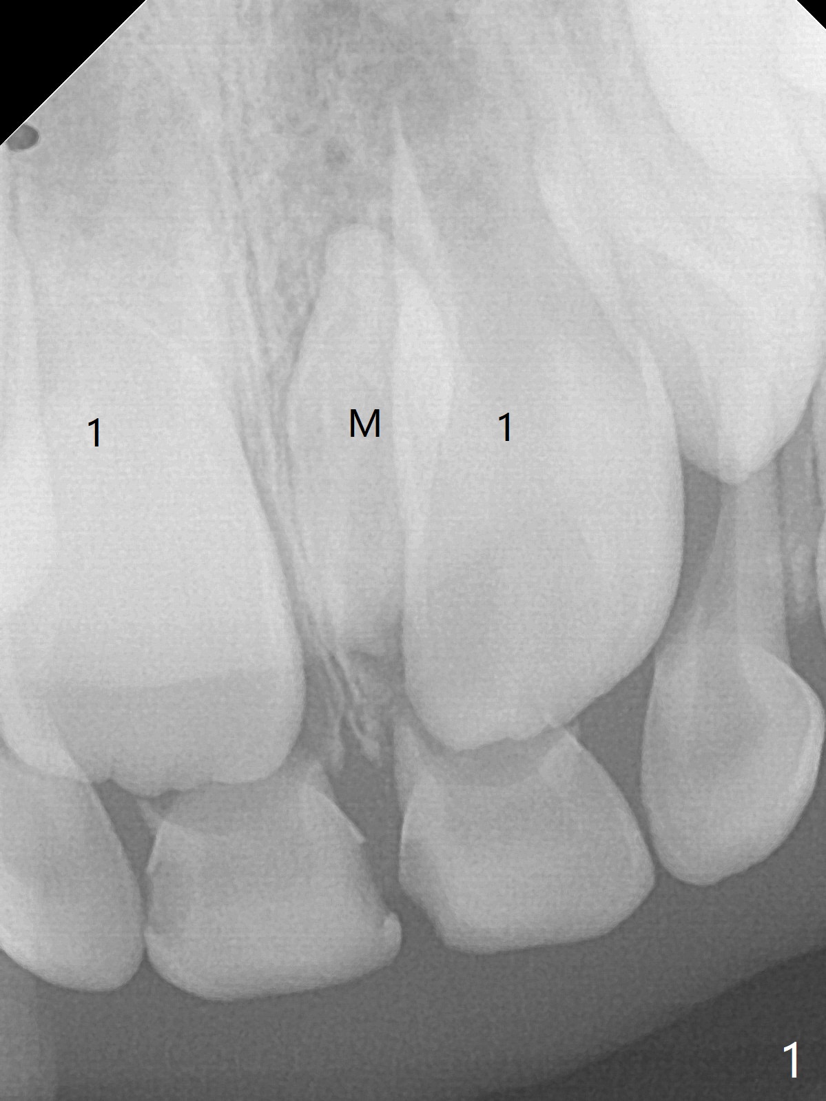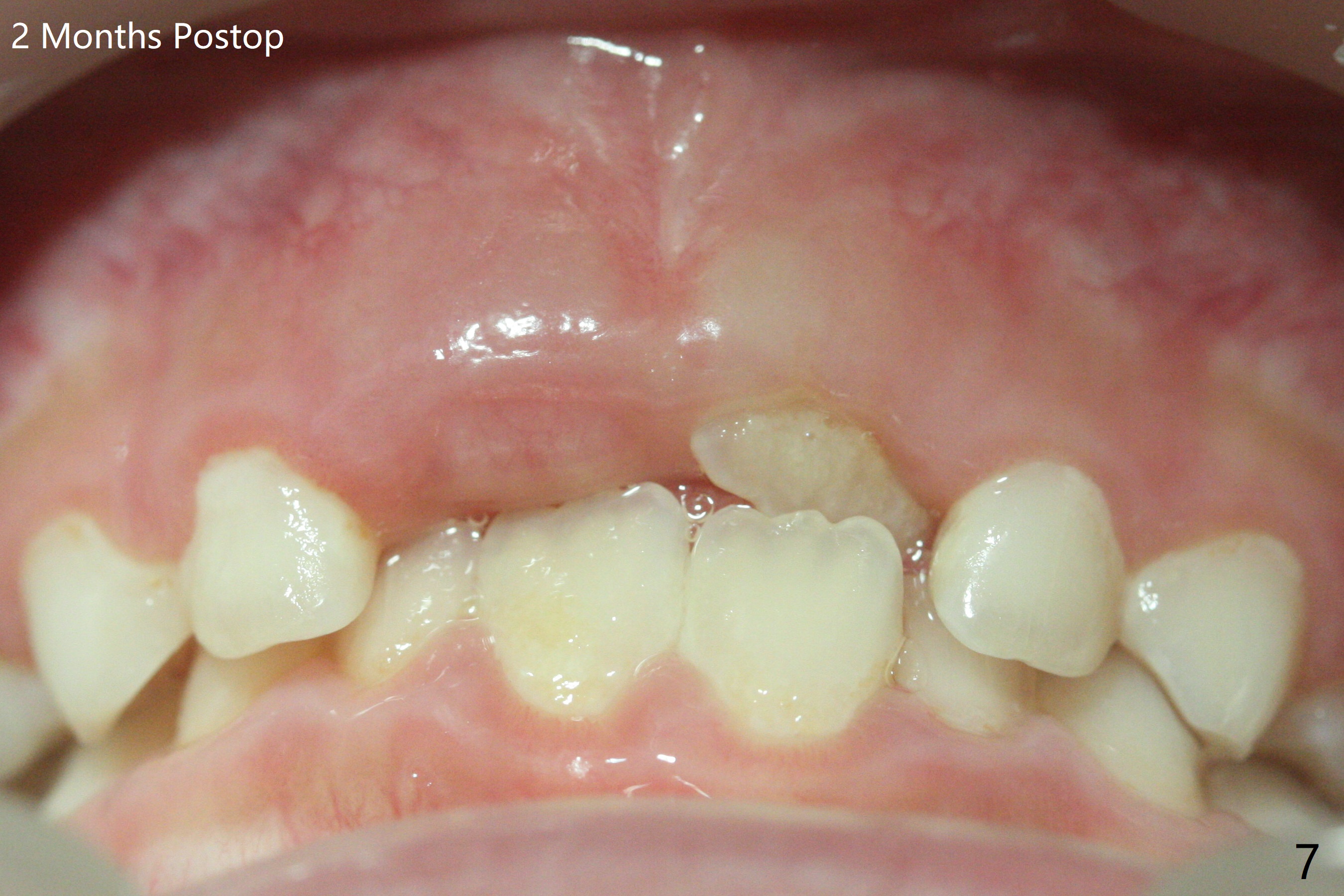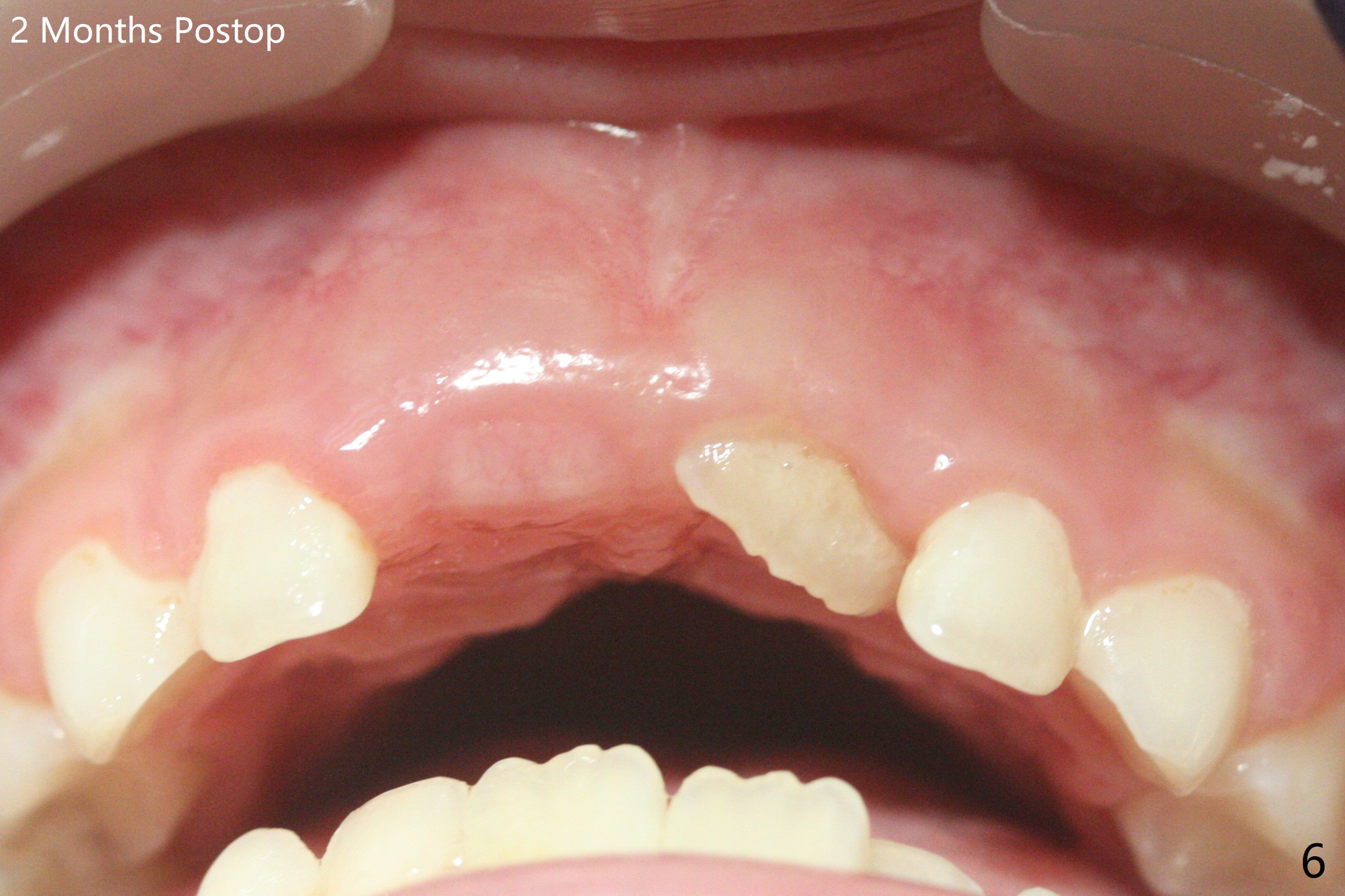 6岁11月女上乳中切牙松动许久,但不脱落,根尖片显示正中多生牙(图一:M),CT显示后者位于腭侧(图二:P)。Take preop photos to show whether the lower lateral incisors have erupted or not. If yes, remove the upperdeciduous central incisors. 一个月后病人回来时,右上乳中切牙已脱落,左上松动 ,术中后者好像影响视野而拔除,腭侧切口,暴露左上1后,拔除多生牙(图三)。 术后3个星期左上中切牙萌出,扭转,反合(图四,五)。术后六个月仍旧如此(图六,七),右上中切牙未萌出,小孩害怕促进萌出手术。准备制作活动矫正器。