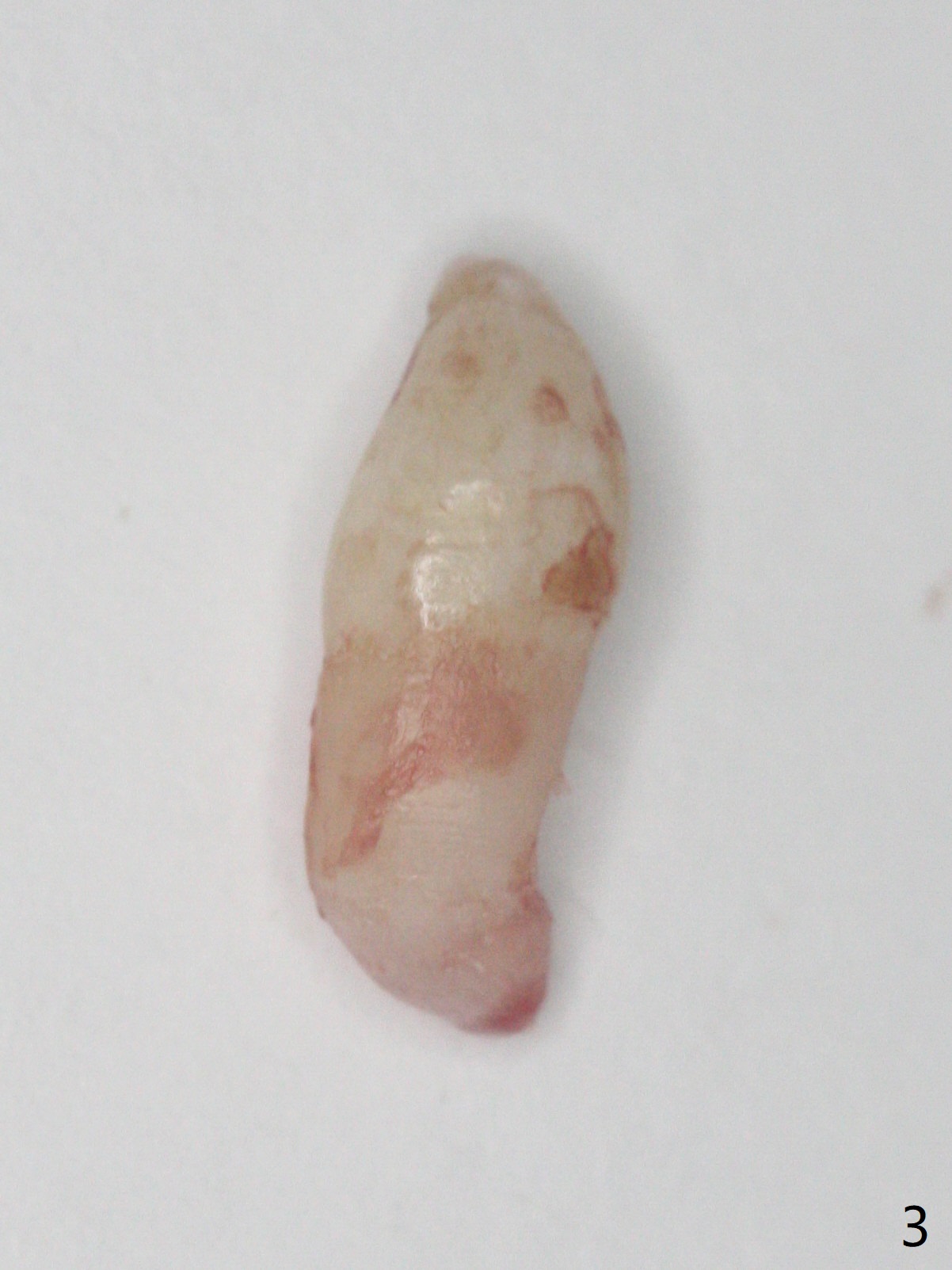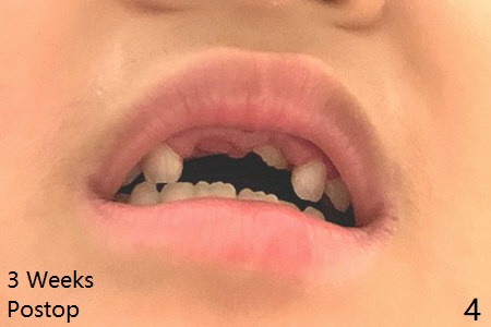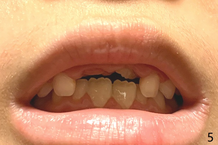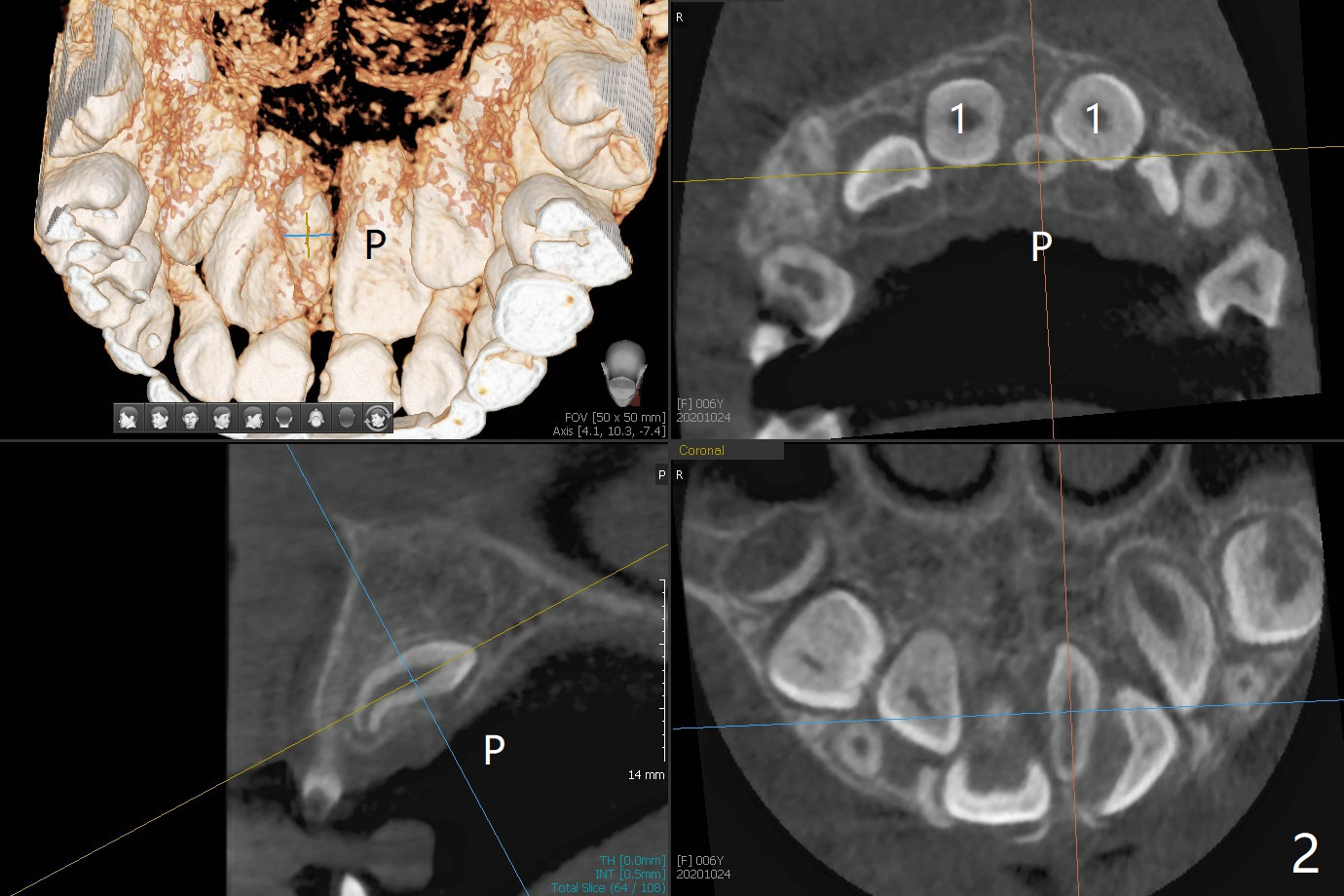 6岁11月女上乳中切牙松动许久,但不脱落,根尖片显示正中多生牙(图一:M),CT显示后者位于腭侧(图二:P)。Take preop photos to show whether the lower lateral incisors have erupted or not. If yes, remove the upperdeciduous central incisors. 一个月后病人回来时,右上乳中切牙已脱落,左上松动 ,术中后者好像影响视野而拔除,腭侧切口,暴露左上1后,拔除多生牙(图三)。 术后3个星期左上中切牙萌出,扭转,反合(图四,五)。术后六个月仍旧如此(图六,七),右上中切牙未萌出,小孩害怕促进萌出手术。准备制作活动矫正器。