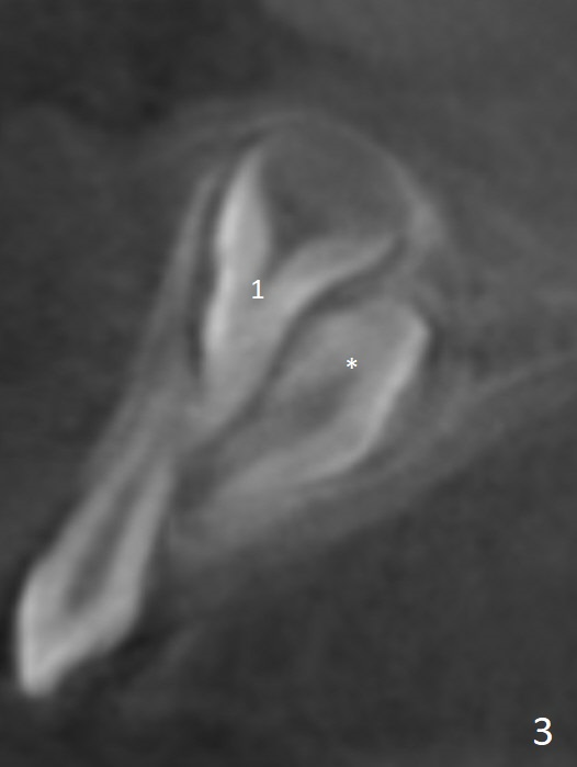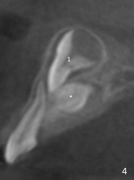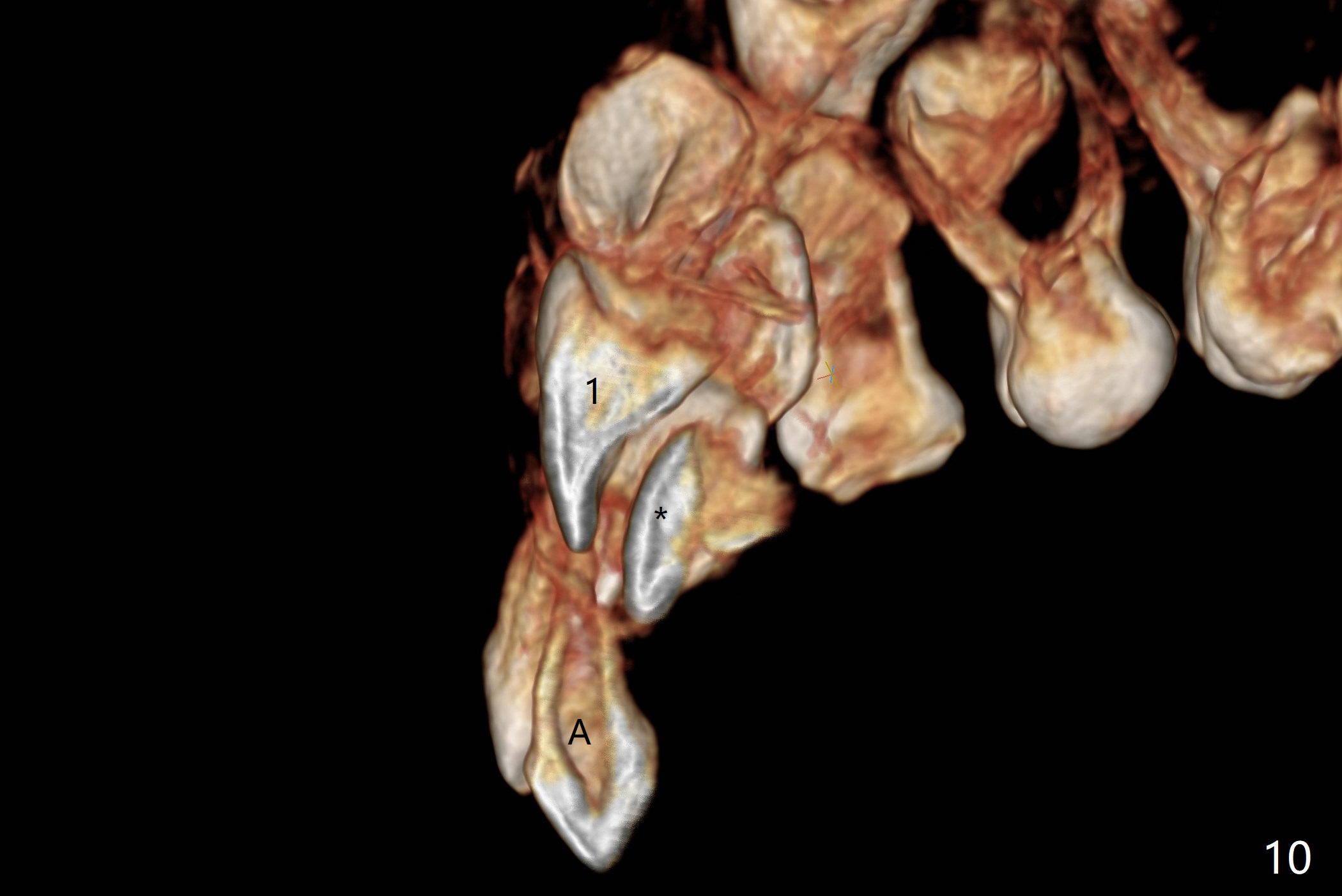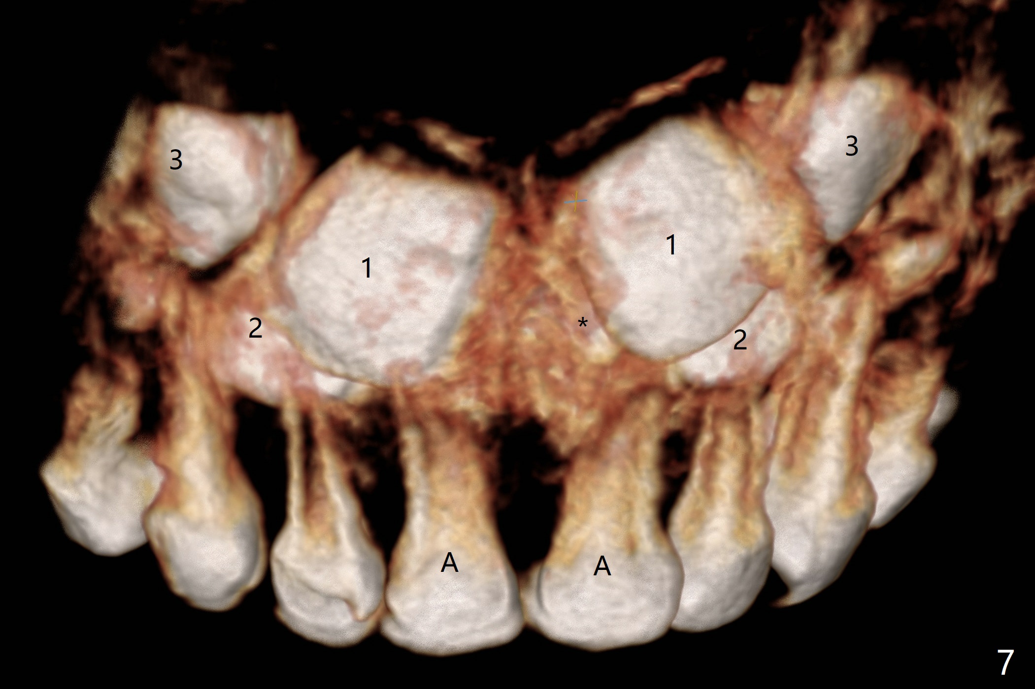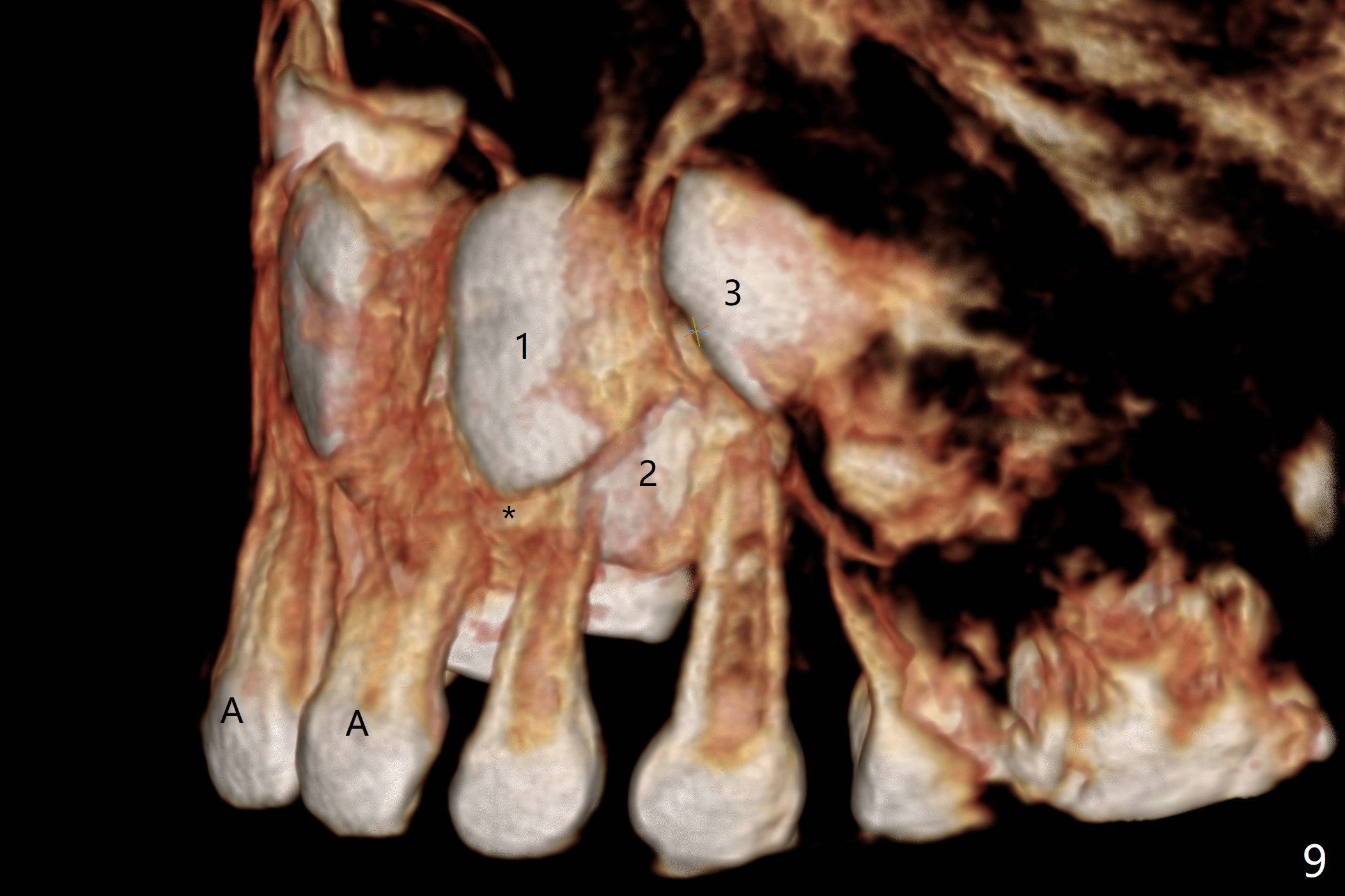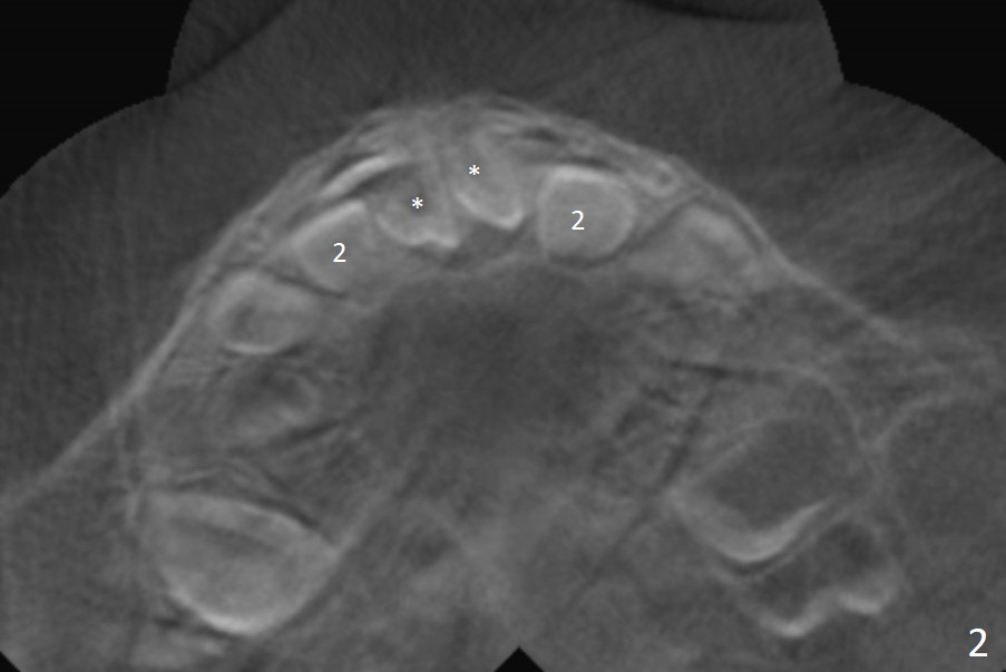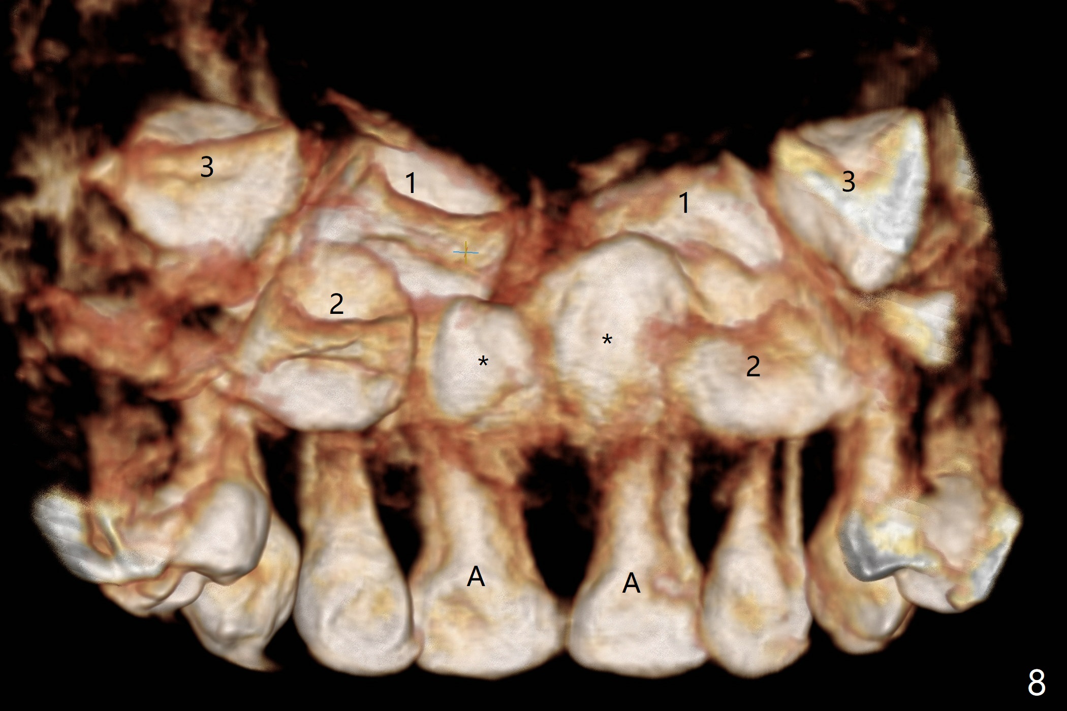 Reanalysis of 3 D images (Fig.7 (frontal view), 8 (posterior view), 9 (lateral view), 10 (lateral view with section) of CT taken 1 year 3 months earlier shows that the mesiodens (*) and the permanent lateral incisors (2) are palatal to the permanent central incisors (1) and canines (3) and the deciduous central incisors (A). The supernumerary teeth do block the eruption of the permanent central incisors (Fig.10).