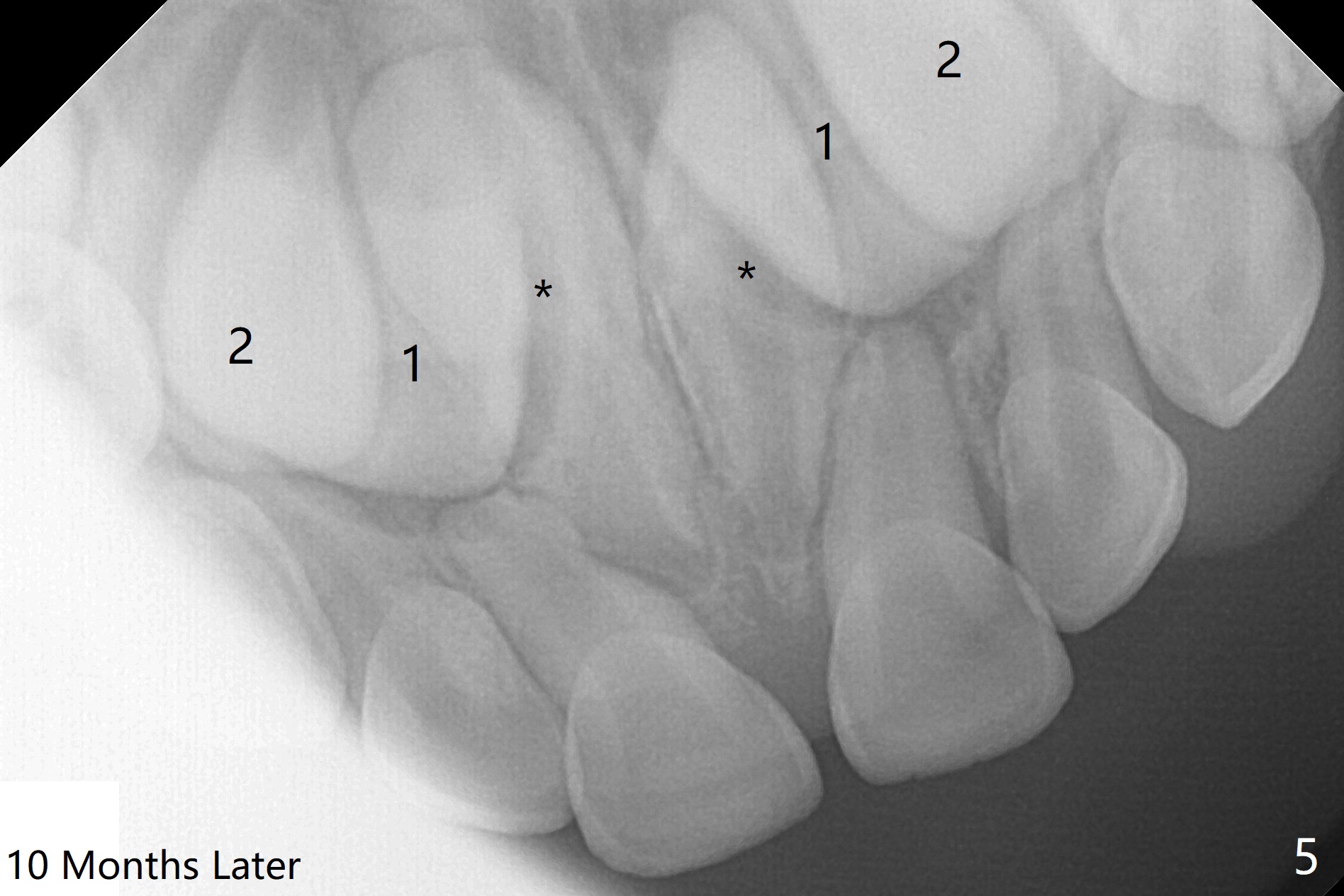 PA is taken 10 months later (Fig.5). The roots of the supernumerary teeth (*) elongate, while the permanent centrals (1) have descended as the same level as the laterals (2). The divergent centrals seem not be able to cause root resorption of the deciduous ones. The parents have hesitated to accept surgical removal. This PA (Fig.6) is taken 6 months later (as compared to Fig.5). The apices of the supernumerary teeth (*) appear to have closed, while the permanent centrals (1) remain as the same level as the laterals (2). The divergent centrals seem not be able to cause root resorption of the deciduous ones. The patient is superactive.