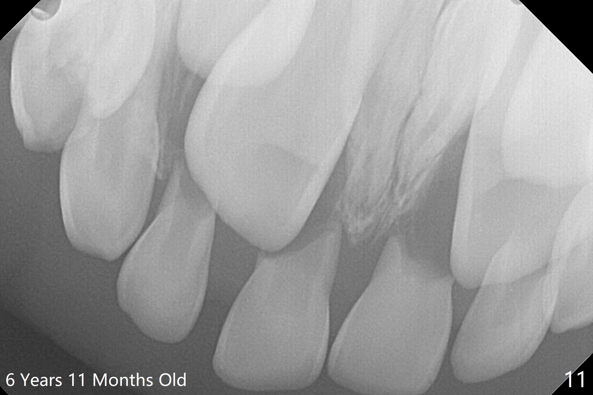 While the lower centrals are erupted and the lower laterals are erupting, the upper deciduous centrals are mobile 6 years 11 months old. It appears that the upper centrals are divergent and causes root resorption of the decidous incisors (Fig.11).