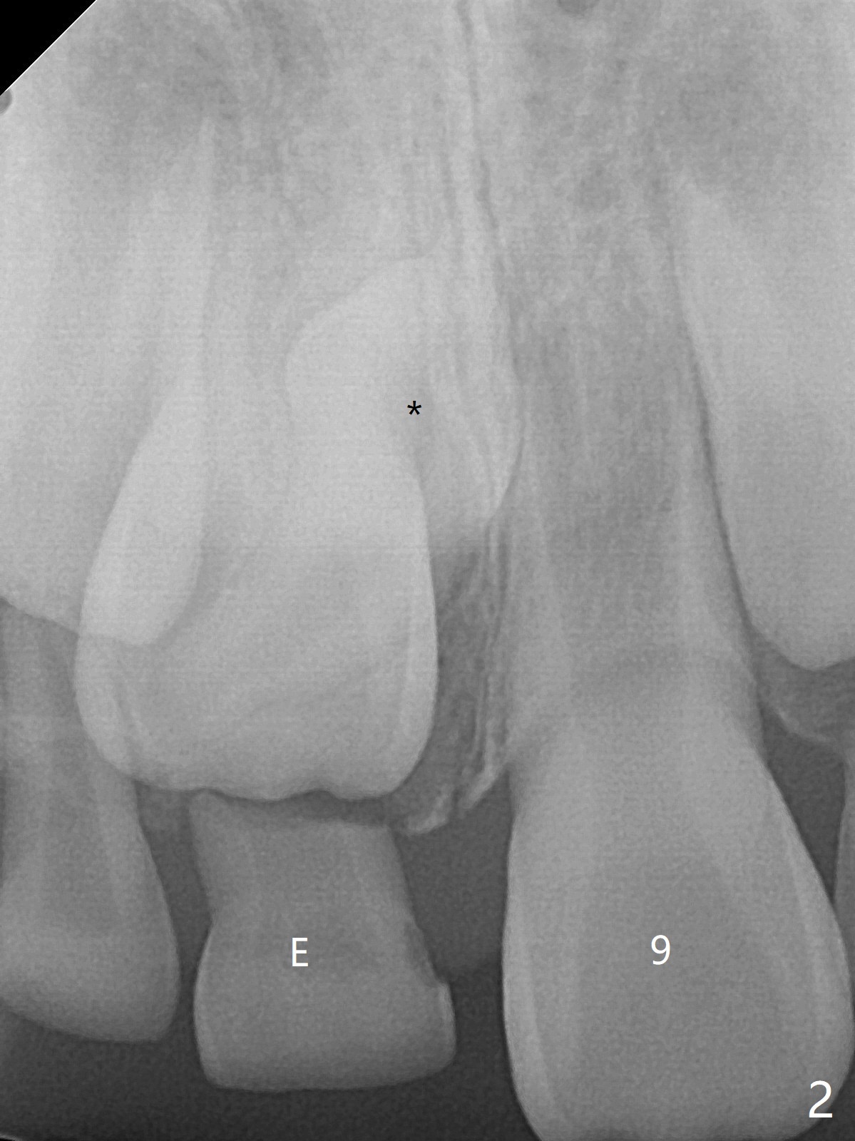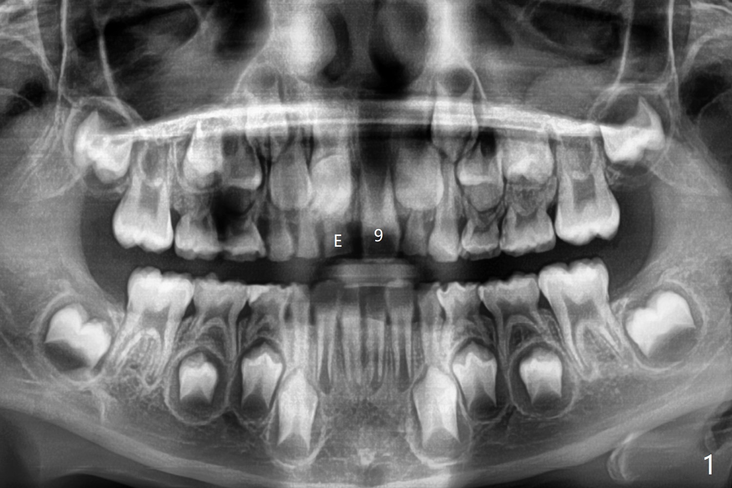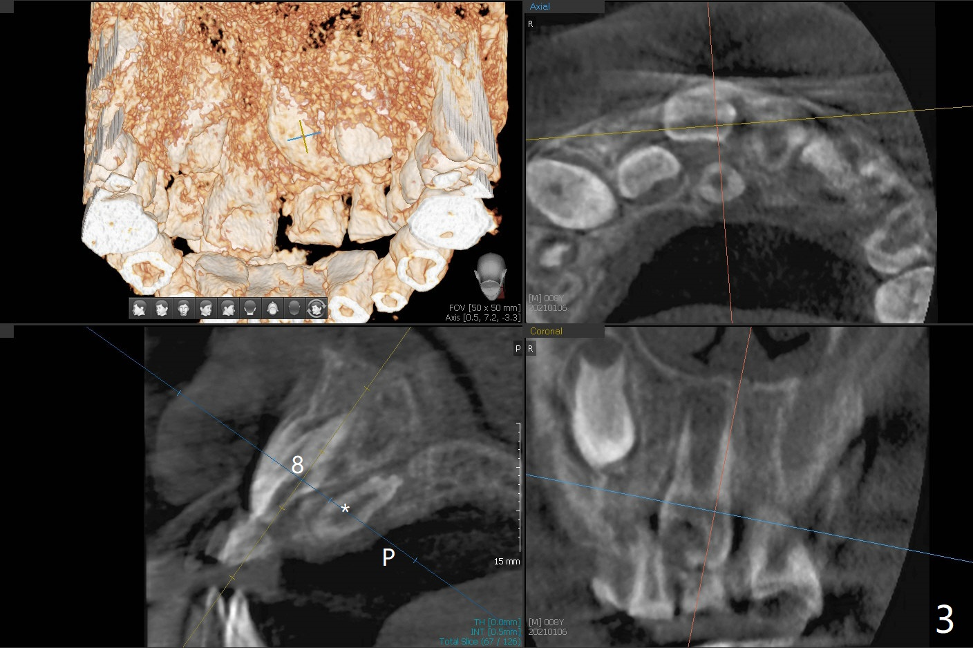 8岁男,右上乳中切牙滞留(图一,二:E),全景片,根尖片显示多生牙(图一,二:*),CT表明它位于腭侧(图三:P)。病人将今天(八岁八个月)回来拔除,腭侧牙龈缘切口应该容易暴露。