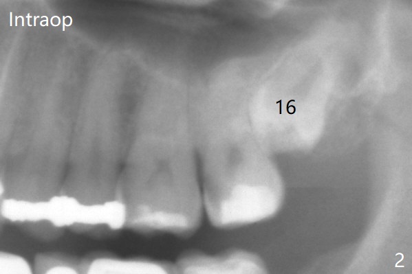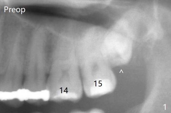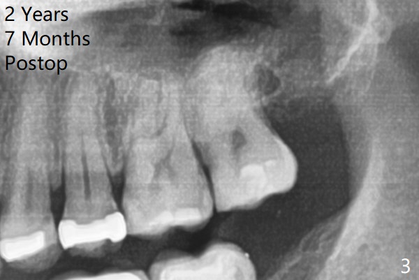 A 37-year-old man complains of food impaction between #14 and 15. Panoramic X-ray shows mesioangular impaction of #16 (Fig.1 ^), which may press #15 root to rotate the tooth so that there is a diastema between #14 and 15. When the impacted tooth is removed, it looks like a microdontia. Intraop X-ray reveals a normal sized 3rd molar in situ (Fig.2: 16). Therefore the microdontia removed is a supernumerary tooth. The tooth #16 is then extracted. The diastema appears to persist 2 years 7 months postop (Fig.3), although gingival swelling and pain reduces. The follow up panoramic X-ray reveals a significant increase in PARL at #20. Return to Professionals Xin Wei, DDS, PhD, MS 1st edition 05/14/2020, last revision 05/16/2020
