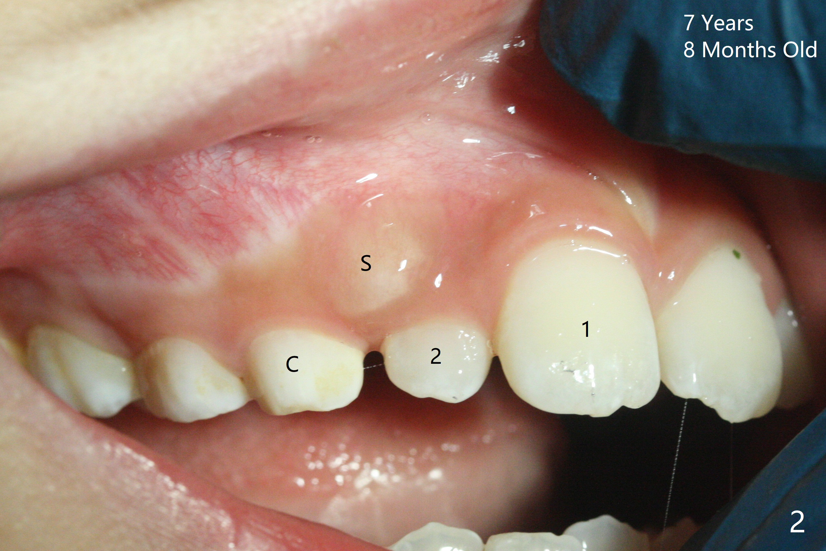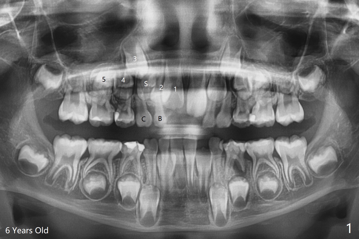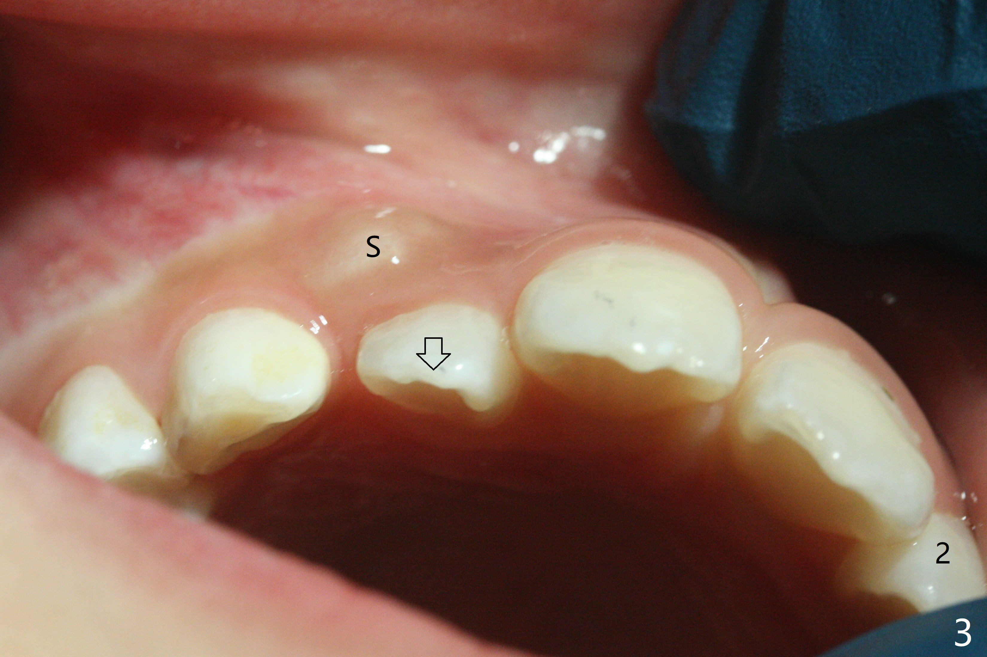 A 6-year-old woman presents to office for limited exam for caries (Fig.1). What was neglected is a super-numerary tooth (S) between UR2 and 3. One year later, the extra tooth appears to be erupting (Fig.2) and linguali-zing UR2 (Fig.3 arrow). PA shows that the extra tooth looks like a lateral (Fig.4). CT will be taken to decide which tooth needs for extrac-tion. The super-numerary tooth (S) blocks UR3 descent, as compared to that of UL3 (Fig.5). The super-numerary tooth with an abnormal cingulum (Fig.6 *) and dens in dente (Fig.6 ^) should be extracted.