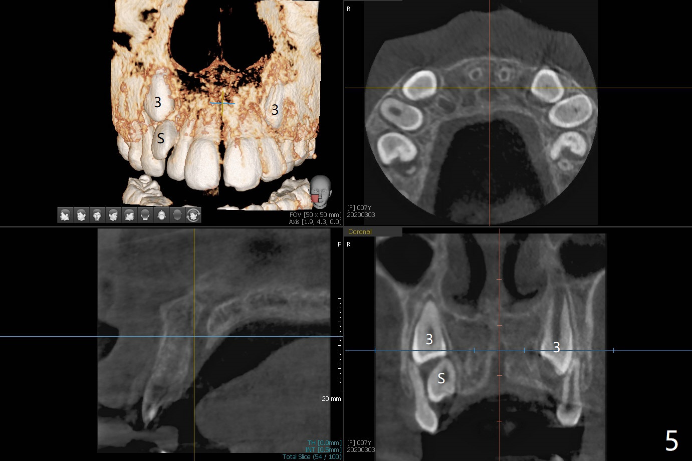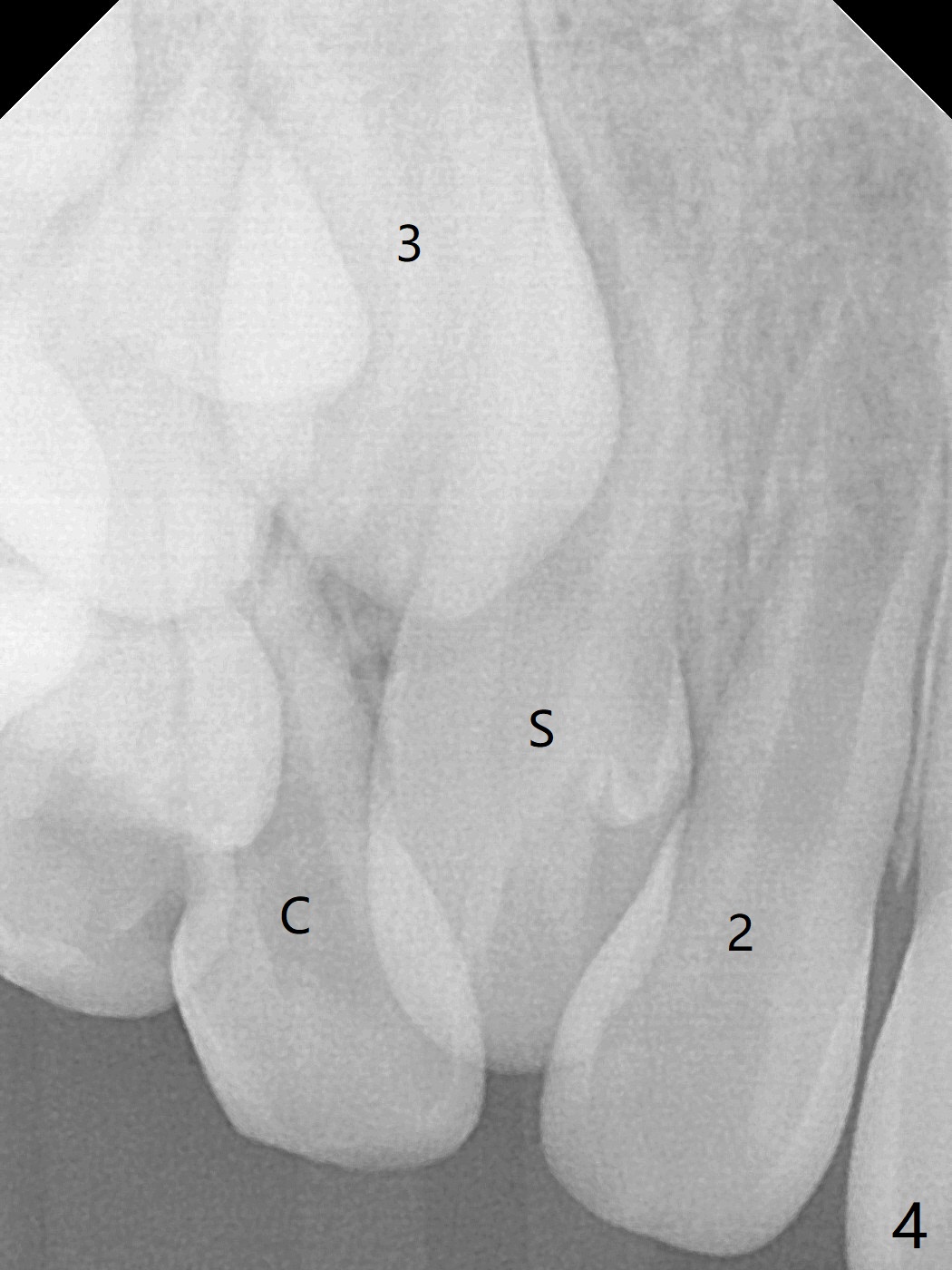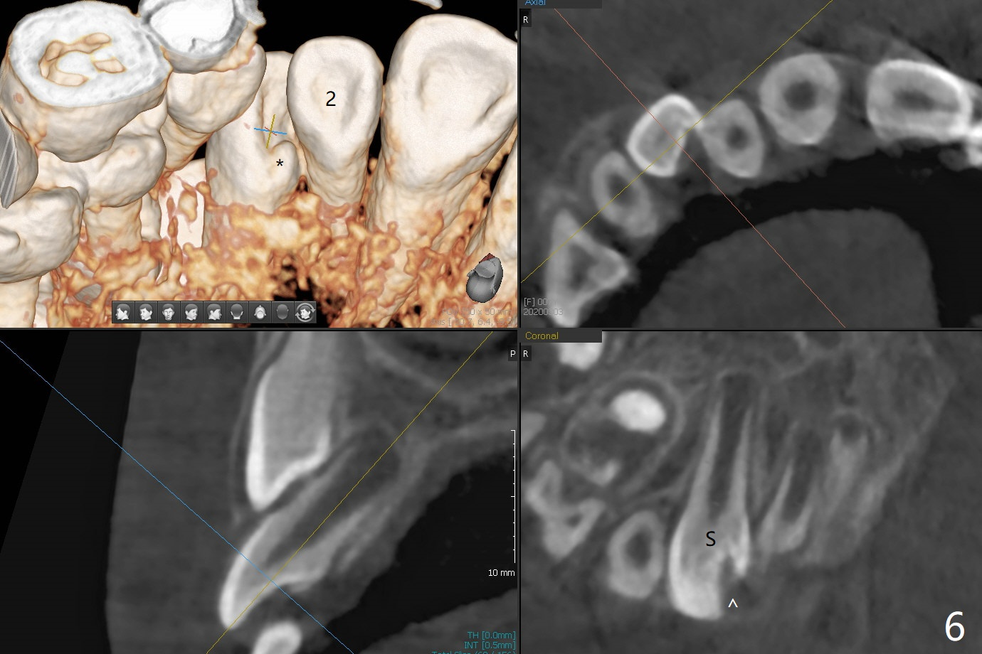 A 6-year-old woman presents to office for limited exam for caries (Fig.1). What was neglected is a super-numerary tooth (S) between UR2 and 3. One year later, the extra tooth appears to be erupting (Fig.2) and linguali-zing UR2 (Fig.3 arrow). PA shows that the extra tooth looks like a lateral (Fig.4). CT will be taken to decide which tooth needs for extrac-tion. The super-numerary tooth (S) blocks UR3 descent, as compared to that of UL3 (Fig.5). The super-numerary tooth with an abnormal cingulum (Fig.6 *) and dens in dente (Fig.6 ^) should be extracted.