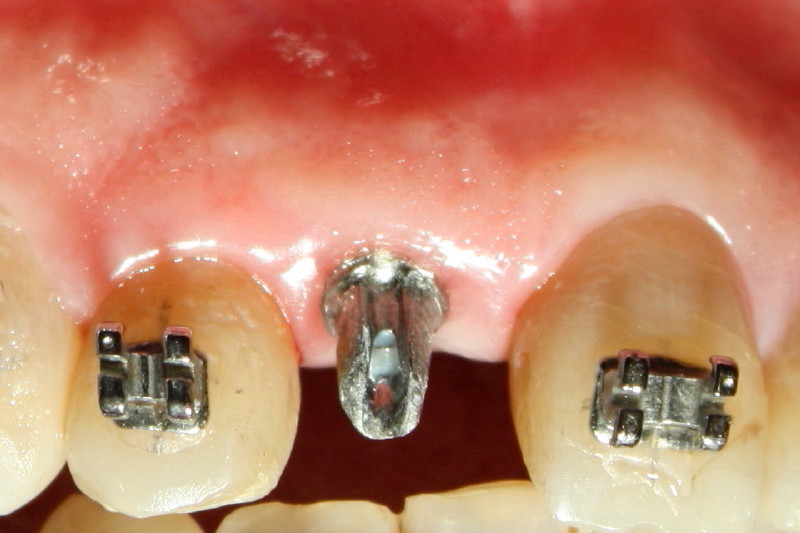 Fig.2. After crown removal, the margin of the implant is equigingival; its gingival margin is lower than that of #9. Return to main article
