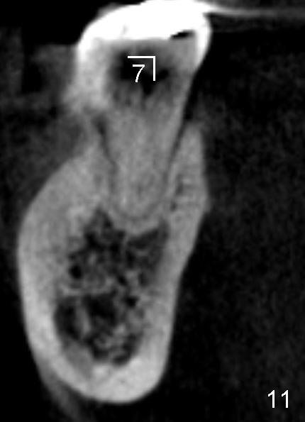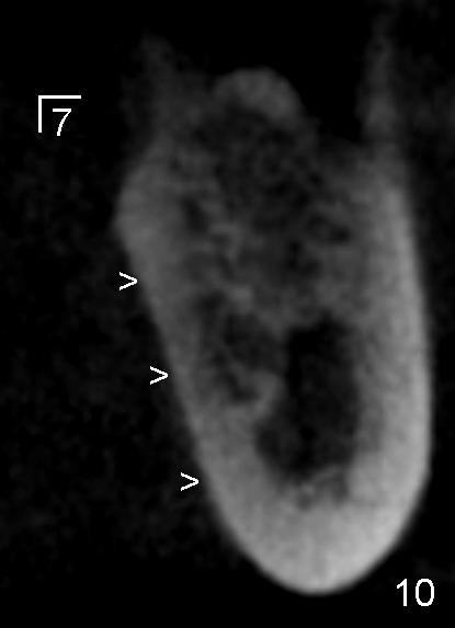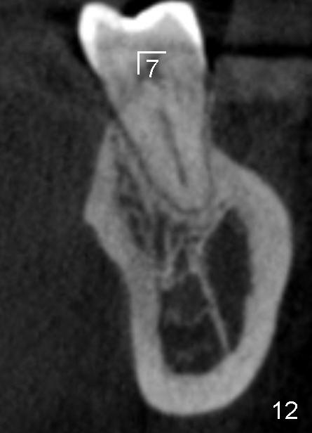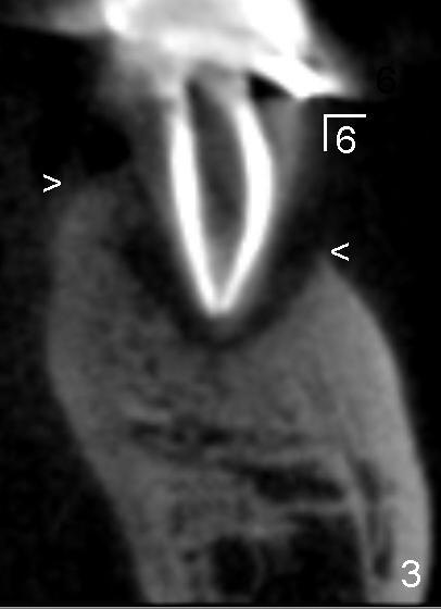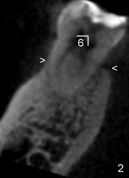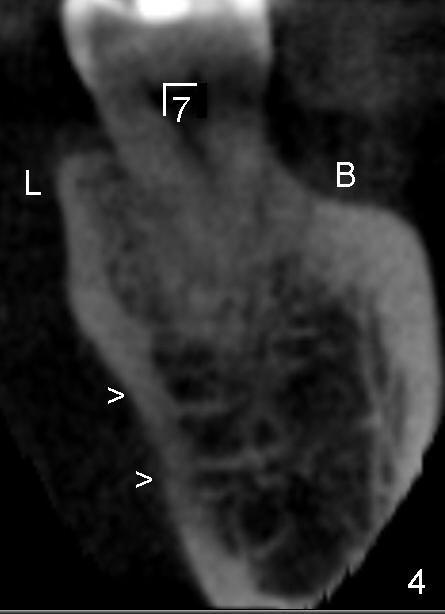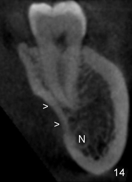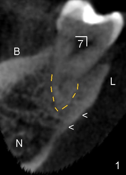 The submandibular (gland) fossa, or lingual (L) concavity (Fig.1 <), is more pronounced in the lower 2nd molar (7) that that of the first (6) (Fig.1 vs.2, 4 vs.3, the same patient). The lingual concavity may be mild (Type I, <2 mm depth, Fig.9-11), moderate (Type II, 2-3 mm, Fig.1,4, 12) and severe (Type III, >3 mm, Fig.13,14 (same patient)).
