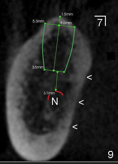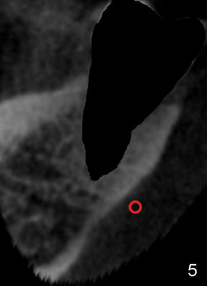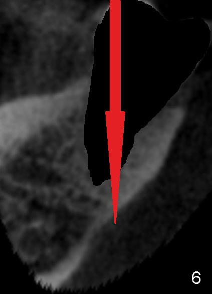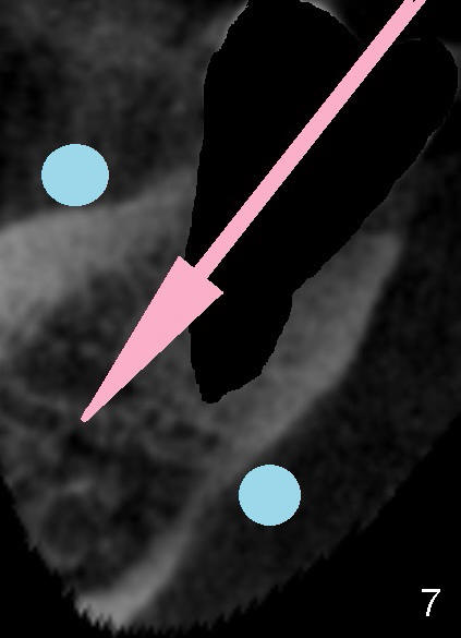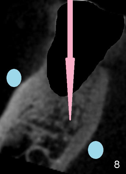 Fig.5 is an illustration, showing the socket after extraction (from Fig.1). The red circle in Fig.5 represents the lingual artery, which is the 2nd branch from the external carotid artery. When the lingual artery is severed by an overdrilling bur, it shrinks toward the external carotid artery. Hemostasis is difficult to achieve without emergency surgery. Failure to recognize the proximity of the lingual concavity may lead to perforation of the lingual plate while osteotomy is forming (Fig.6 red arrow) and potentially damage the lingual artery in the submandibular fossa. Although CBCT is essential for recognition of this special anatomy, a surgical technique is the most critical step to avoid the injury. That is to use two fingers (Fig.7 blue circles) to hold the buccal and lingual plates as low as possible and let the tactile sense guide you and keep the osteotomy in the middle of the ridge (pink arrow). One of the fingers may sense the vibration before perforation of the lingual plate. Use a long explorer to probe the osteotomy site after each bur. A surgical stent is also helpful. If an immediate implant is placed, the osteotomy should be initiated in the buccal wall of the socket of the 2nd molar (Fig.7). For the 1st molar of this case, the osteotomy is to be placed slightly lingual (Fig.8 (an illustration from Fig.2) pink arrow), since the buccal bone is lower than the lingual (Fig.2 <) and especially on the affected side (root fracture) (Fig.3).