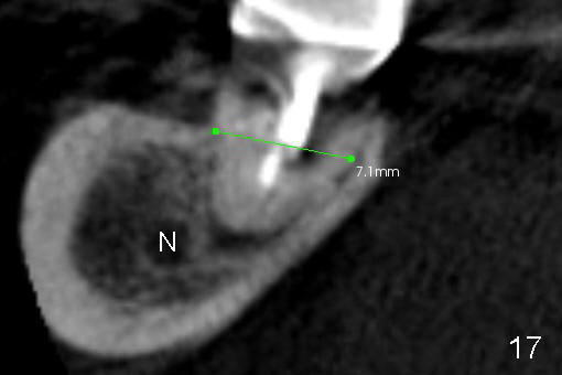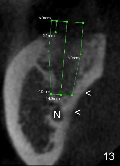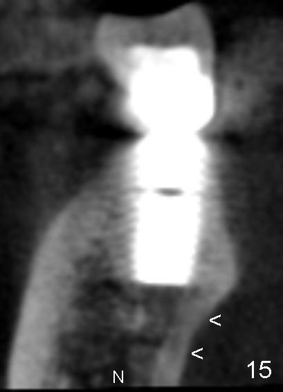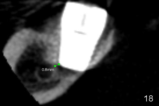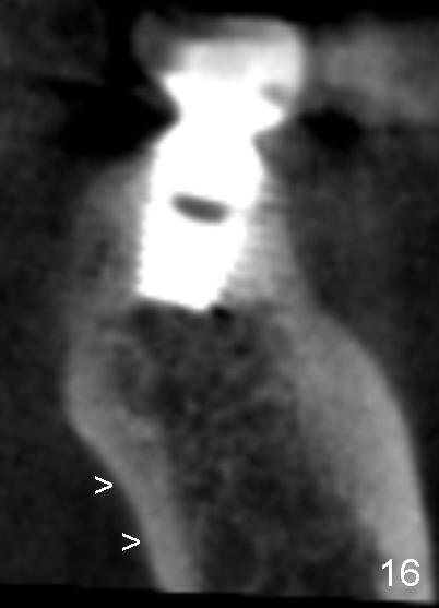 In addition, it is important to control the depth of the osteotomy. For freshly healed socket and immediately post-extraction socket, it should be safe to place a 11 mm long bone-level (Fig.15,16) or 14 mm gingival level (Fig.13,18) implant or less. For the same length, it appears safer to use a tapered implant (Fig.9,13,18) than cylindrical one (Fig.15,16).