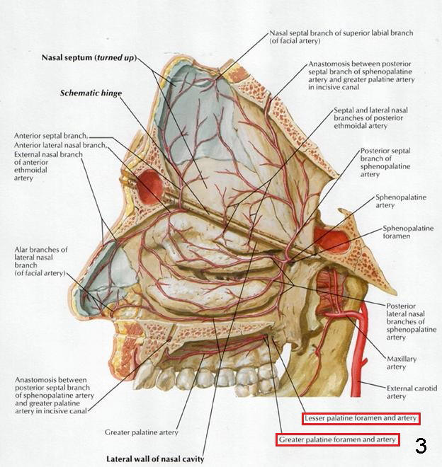 腭降动脉到口腔分为腭大和腭小动脉(Greater and Lesser palatine,图三)。上前牙上部是鼻腔,那里血运丰富,上前牙植牙可以提高鼻底,但不能穿破鼻腔粘膜(出血,感染)。术前测量骨质高度。