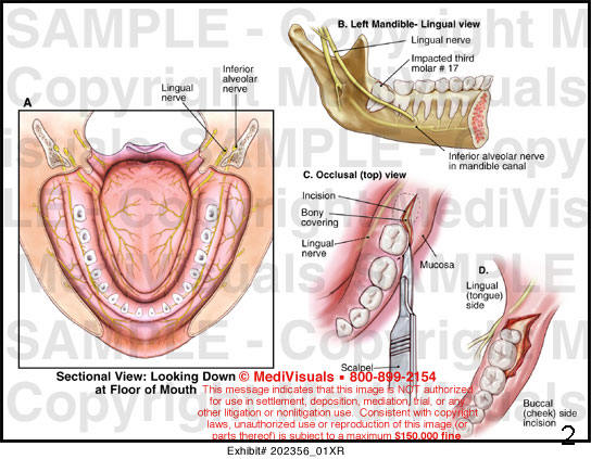 由于舌神经紧靠下颌智齿舌侧,拔除后者切口应该局限在颊侧(图二:C),将舌侧粘骨膜瓣推向舌侧,保护舌神经(图二:D)。