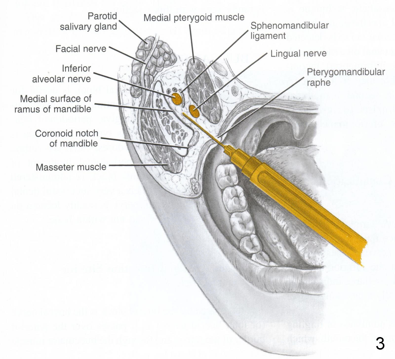 升支后缘是腮腺(图三:Parotid salivary gland)和面神经(Facial nerve),下齿槽神经阻滞(zuzhi)麻醉针头必须碰到升支内侧壁。