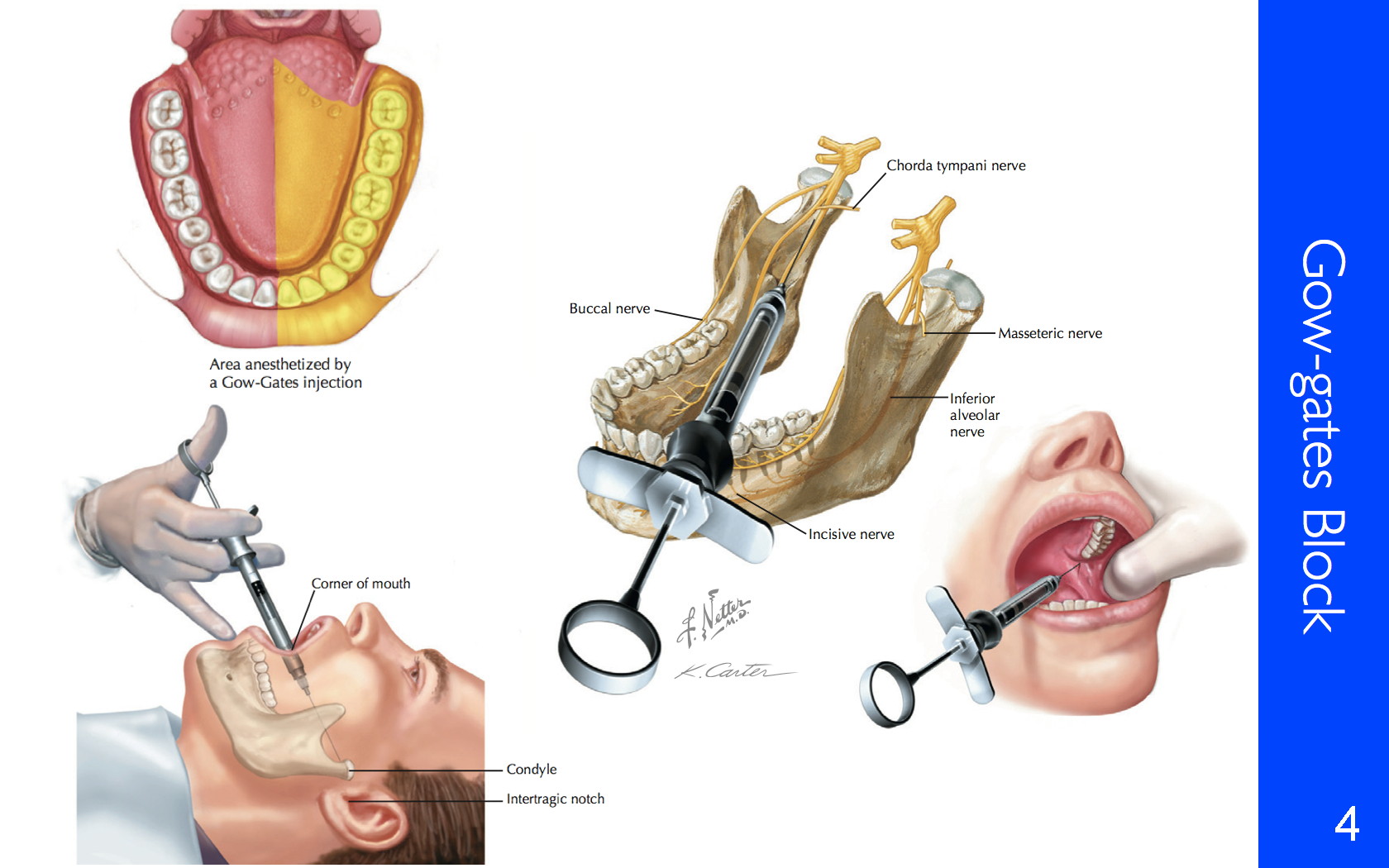 偶尔下齿槽神经阻滞麻醉不全,可能因为下颌神经其它分支(例如耳颞神经,没有显示)在更高的位置分出,也支配下颌牙齿,所以我们应该在高处阻滞下颌神经(称为Gow-Gates Injection,图四)。下面是下齿槽神经阻滞麻醉录像。其实下颌植牙时,最好不要做下齿槽神经阻滞麻醉。