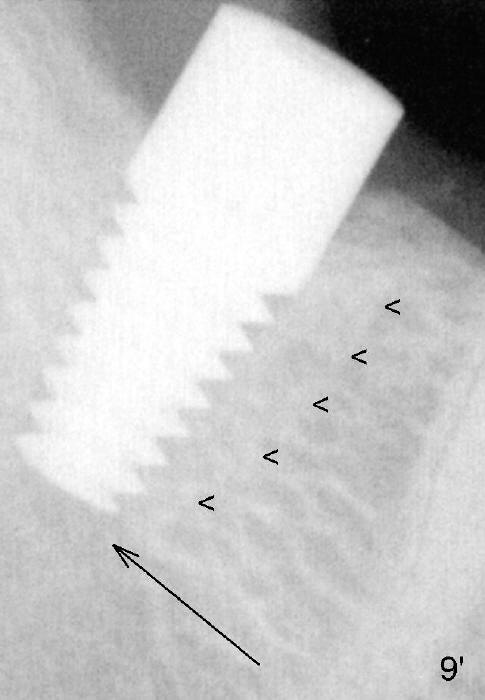 Fig.9: Two and a half months post implantation. The mesial lamina dura (Fig.9': arrowheads) is disappearing, while the bone density immediately next to the implant increases probably due to extension of trabecules across the lamina dura (long arrow).