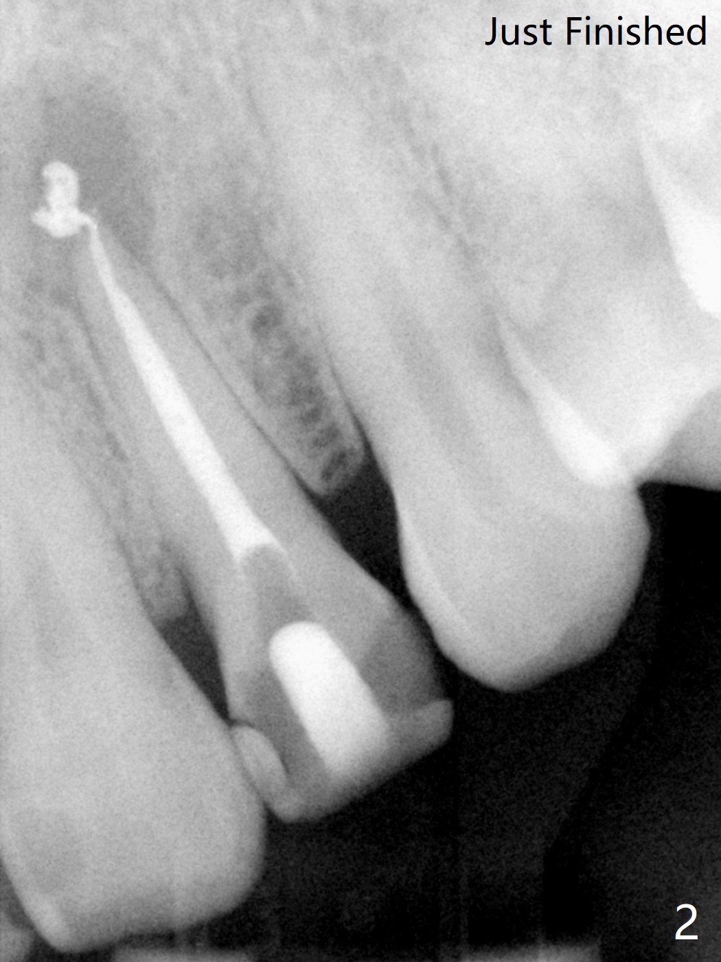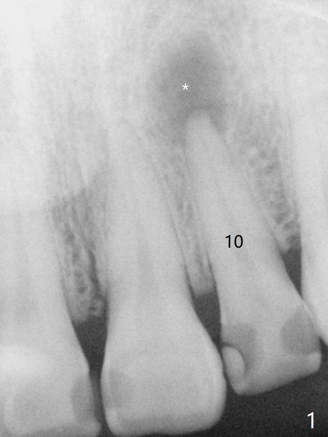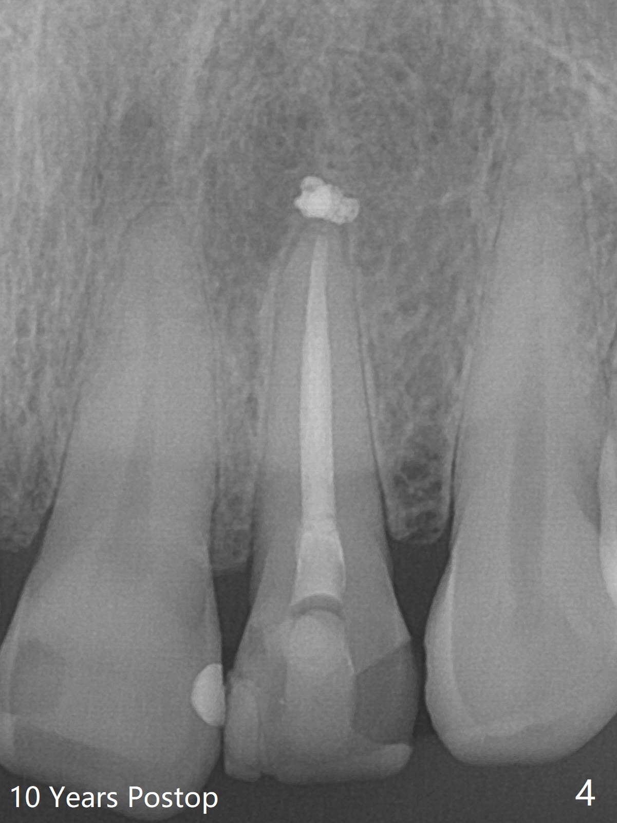 A 47-year-old woman with multiple restoration has PARL at #10 (Fig.1 *). RCT is done with paste leakage (Fig.2). PARL reduces and disappears 2.5 and nearly 10 years postop (Fig.3,4).