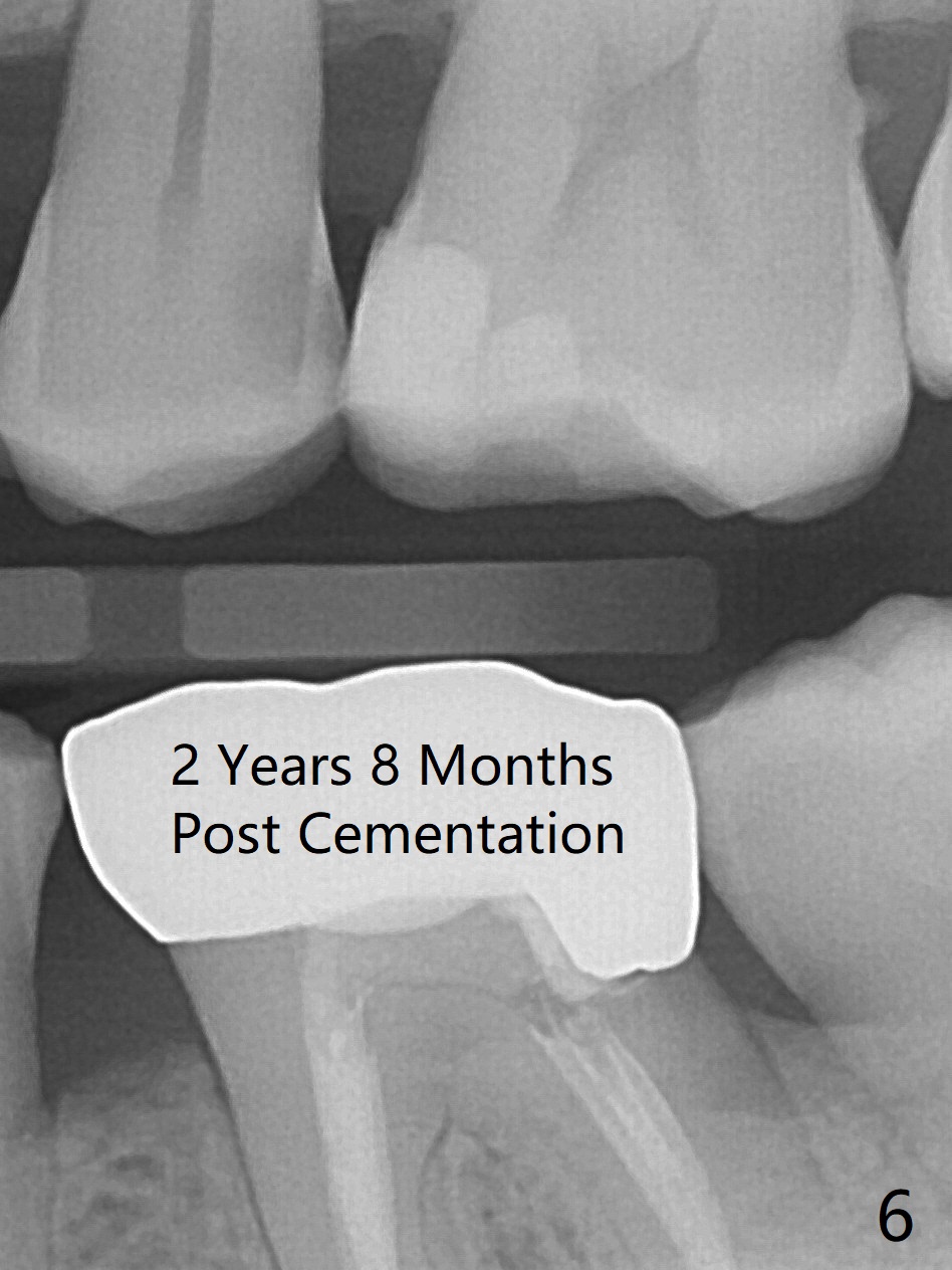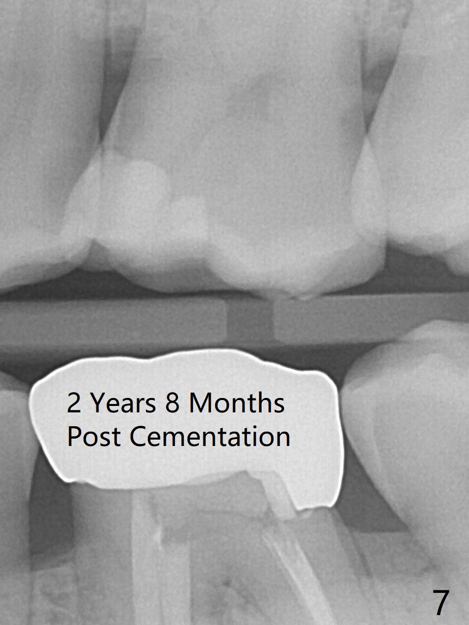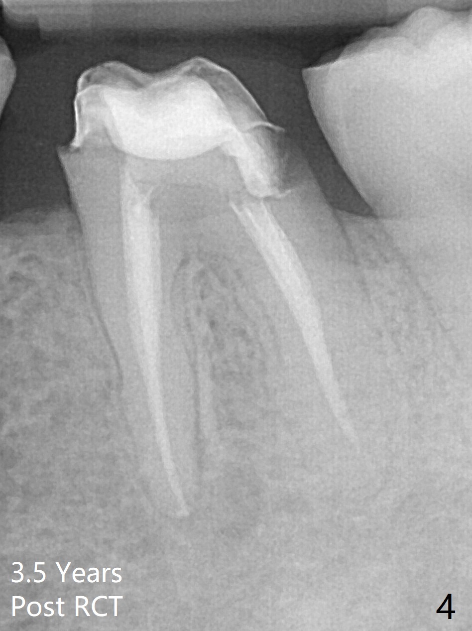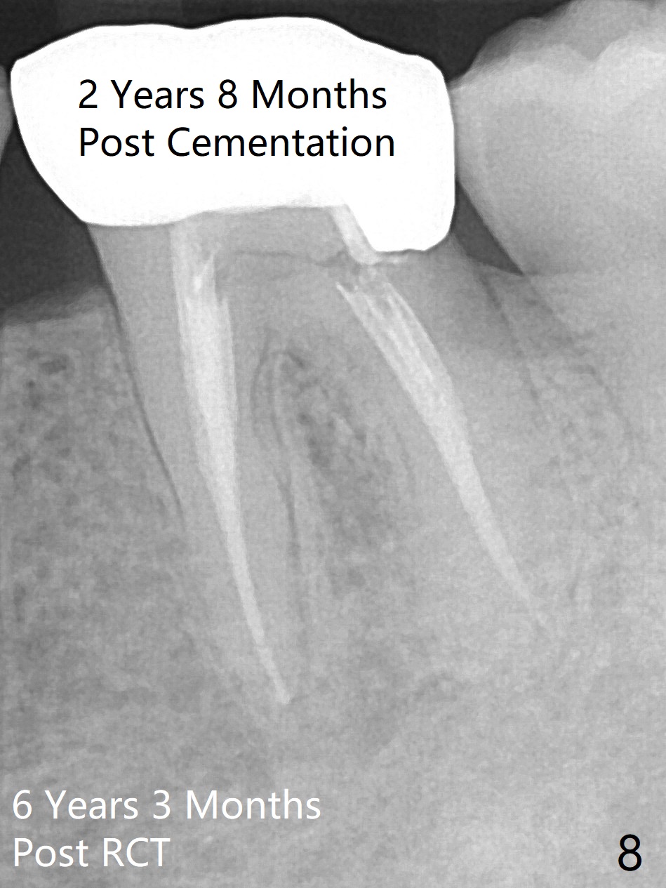 A 29-year-old man has chronic apical perio-dontitis at #19 (Fig.1) for 5 years before RCT with apical buccal swelling (Fig.2). Three days post RCT a fistula develops (Fig.3); curettage is performed. Crown is prepared 3.5 years later (Fig.4). Bitewing is taken immediately before cementation (Fig.5). There is no leakage 2 years 8 months post cementation (Fig.6,7) or periapical radiolucency 6 years 3 months post RCT (Fig.8). Return to Professionals Xin Wei, DDS, PhD, MS 1st edition 11/27/2019, last revision 11/28/2019