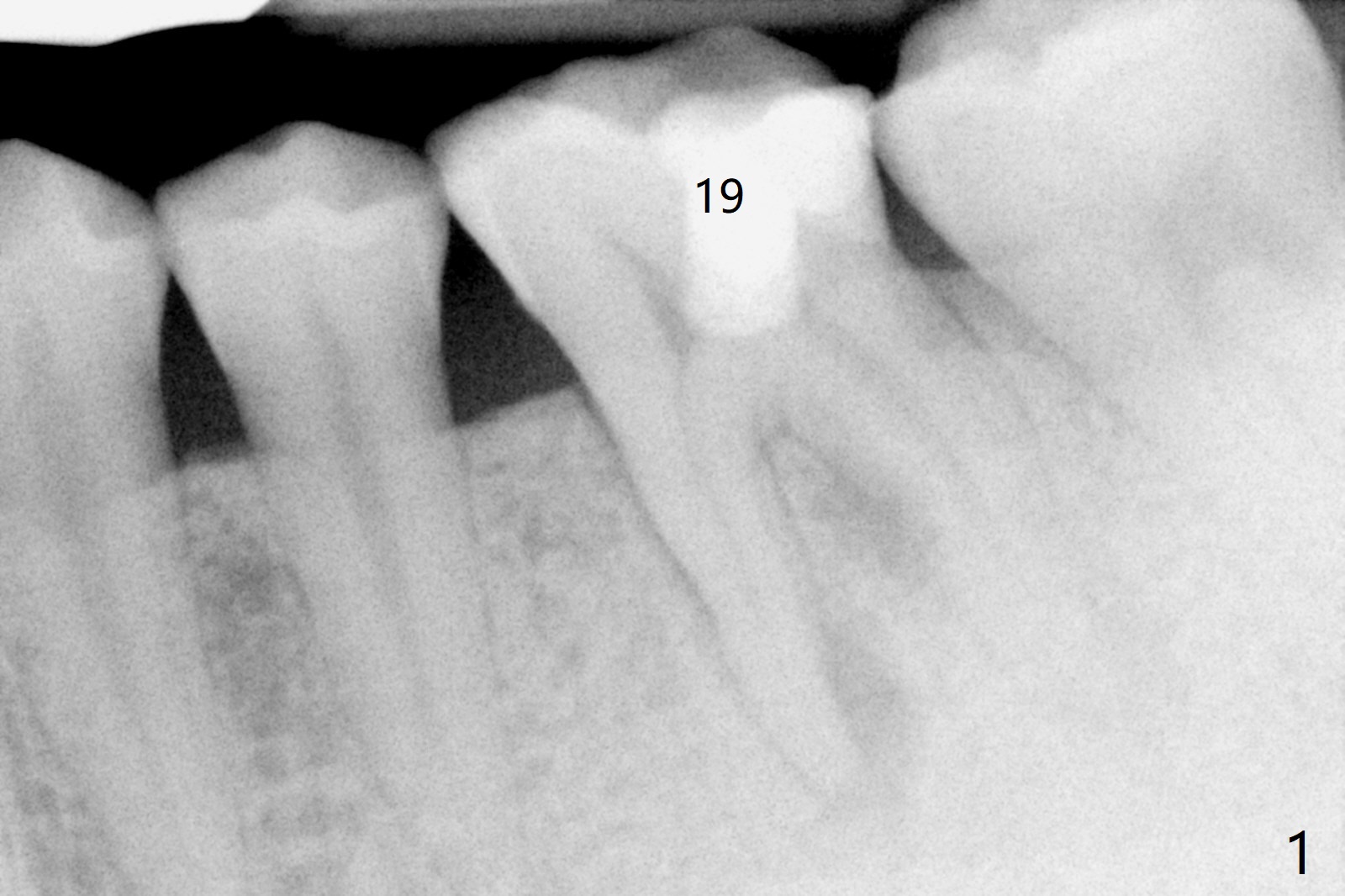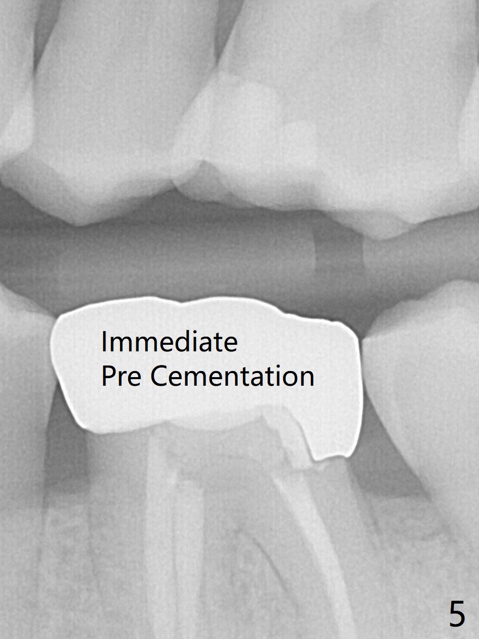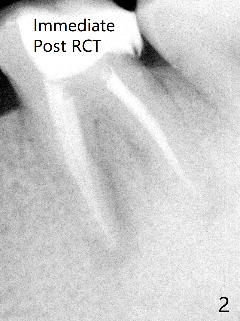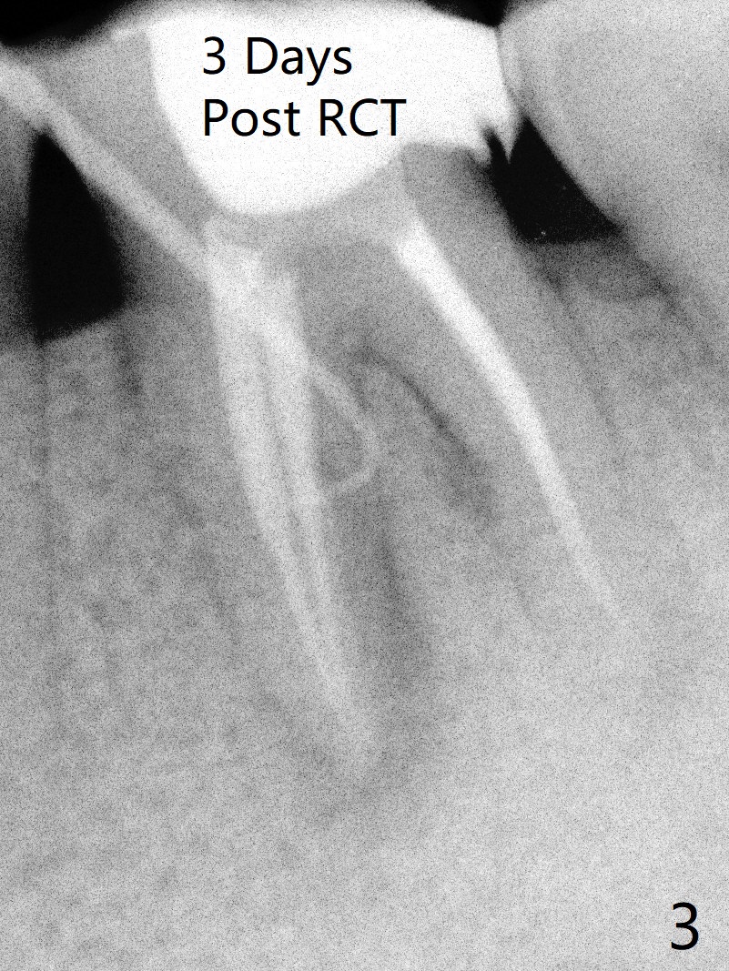 A 29-year-old man has chronic apical perio-dontitis at #19 (Fig.1) for 5 years before RCT with apical buccal swelling (Fig.2). Three days post RCT a fistula develops (Fig.3); curettage is performed. Crown is prepared 3.5 years later (Fig.4). Bitewing is taken immediately before cementation (Fig.5). There is no leakage 2 years 8 months post cementation (Fig.6,7) or periapical radiolucency 6 years 3 months post RCT (Fig.8). Return to Professionals Xin Wei, DDS, PhD, MS 1st edition 11/27/2019, last revision 11/28/2019