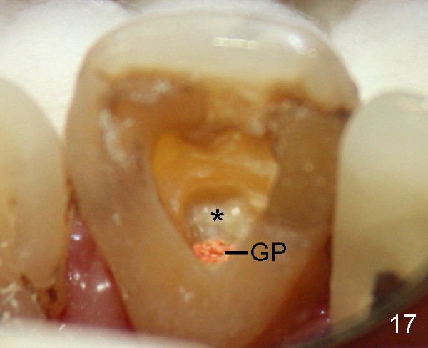 Initial access shows that the labial portion of the recessed pulpal horn (brown, < in Fig3 (occlusal view) is not fully exposed, while that the most lingual aspect of the incisal edge (between **) has been removed. Further access appears to be necessary to expose the obliterated pulpal chamber (Fig.7 <) and more of the incisal edge has been violated ( between **). With good exposure, the canal is easily found around the arrowhead (<) in Fig.7. Fig.11 shows the access after application of Gates-Glidden files. Before rotary files, the access is enlarged further both labially and lingually with diamond/carbide endo access burs (Fig.15). Traditional way to get access actually sacrifices more lingual structure (Fig.11,15 black <) than the labial one (white <) or creates a ledge (Fig.17 (mirror view) *) labial to the orifice (gutta percha (GP). Return to main article