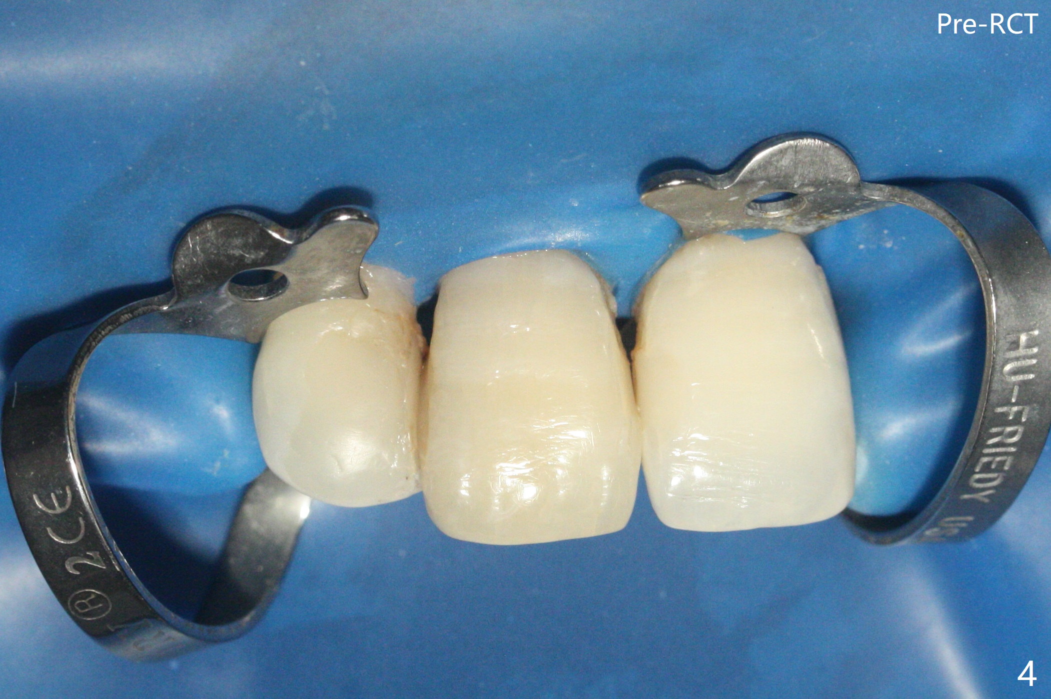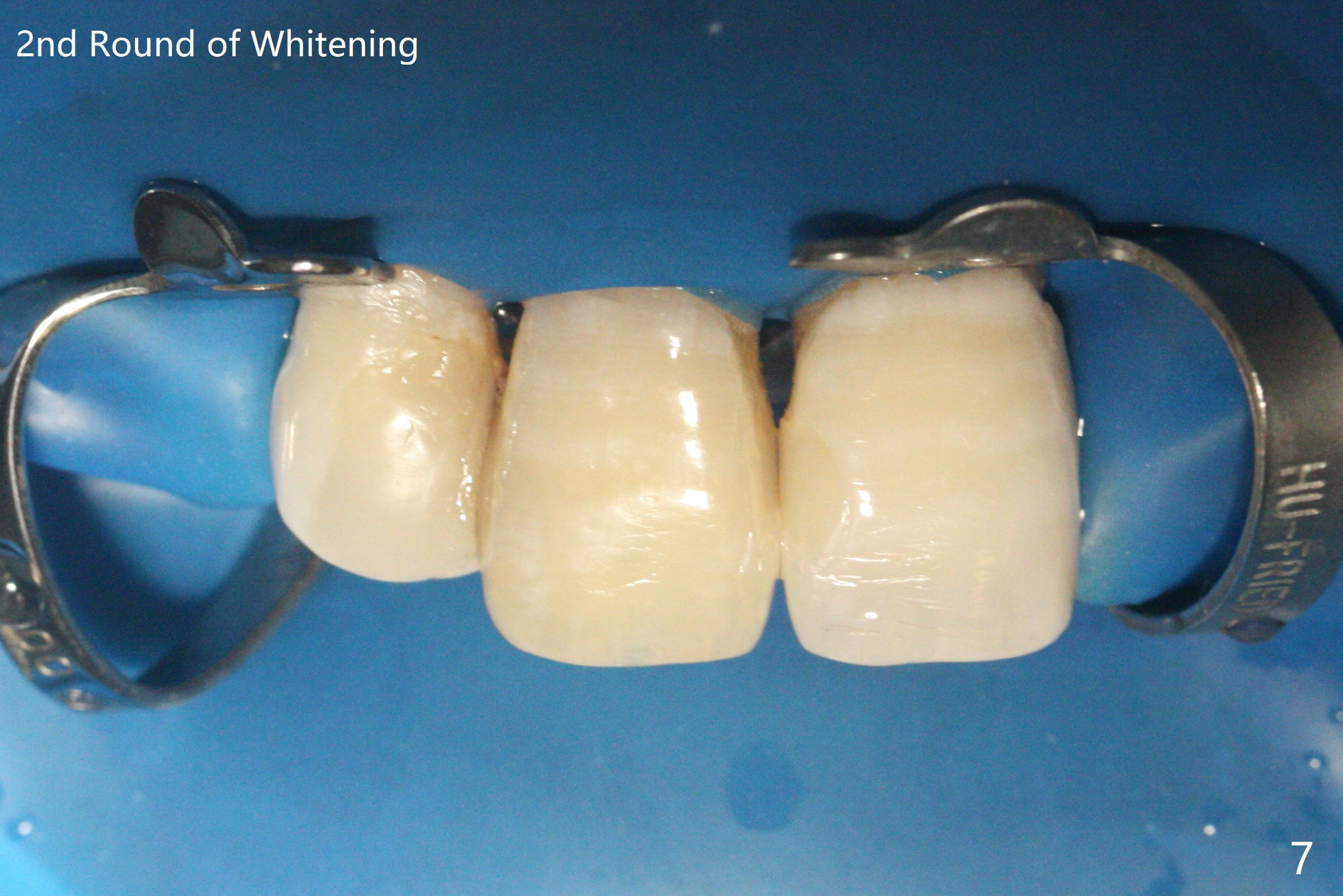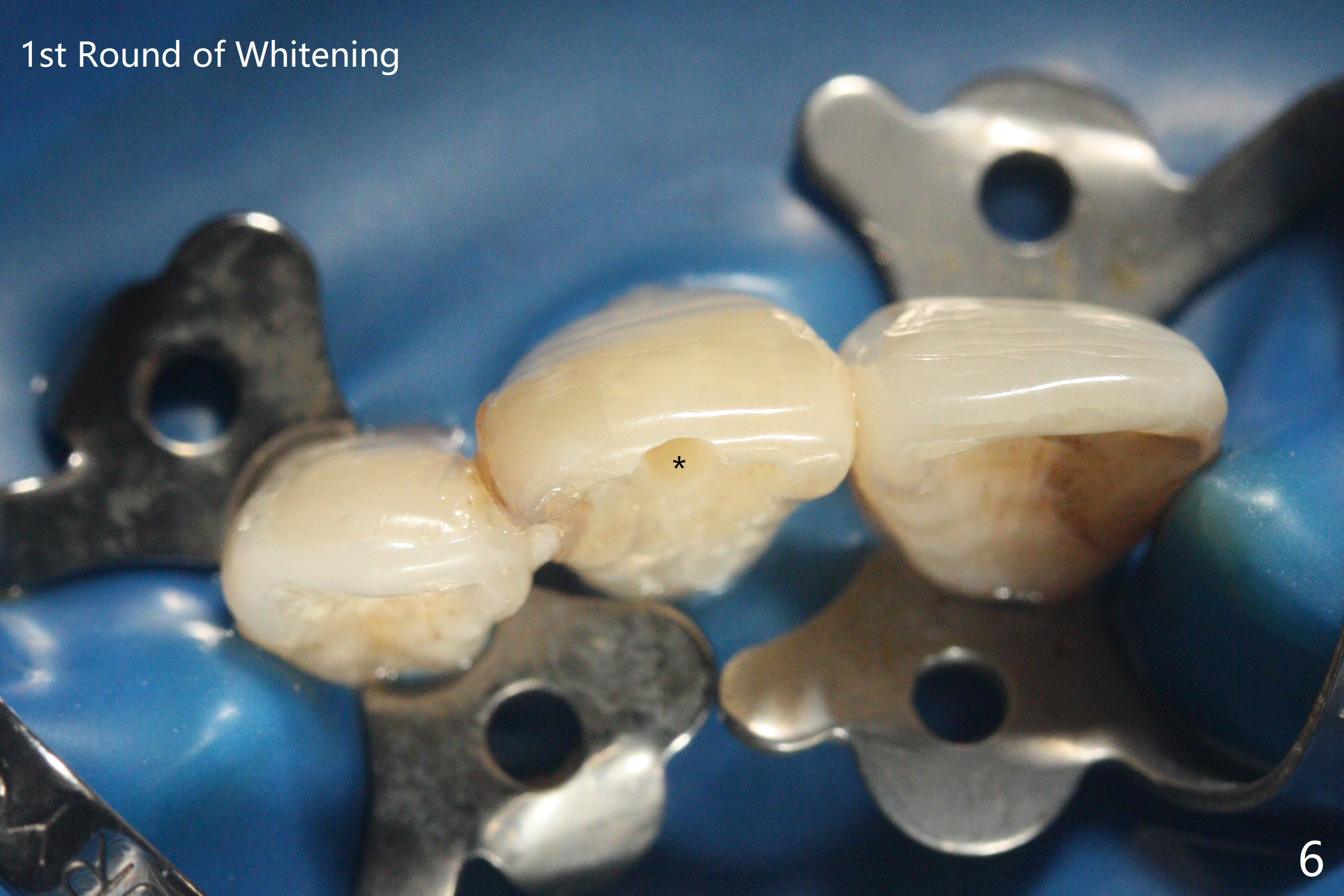 单个门牙变色往往是牙髓坏死所致,根管充填后做漂白,防止漂白泡沫跑到根尖孔之外,这种顺序可以改变吗?53岁女右上1根尖无痛性红肿(图一:^),牙冠变色(图二),牙髓测定:死髓,伴有根尖阴影(图三),中切牙需要根管治疗,什么时候漂白最好,步骤便利?根管治疗后做内漂白,必须把牙胶尖取出,釉牙骨质交界处之下,牙冠长,如这个病例,取出可能困难。我们准备尝试根管治疗当中做漂白,由于死髓牙,根管治疗可以不需要局麻,三个牙齿暴露在橡皮障之外(图四),以便术中漂白观察。根管治疗当中使用大量漂白水,好象并没有改善颜色(图五)。所以在根管口(图六)注入35%双氧水(漂白液,胶状),适当超越釉牙骨质交界处。万一双氧水气泡跑出根尖孔,我们将用生理盐水冲洗,不过这个意外没发生。双氧水也放置在患牙表面(外漂白),两次漂白后(每次20分钟),病人满意牙冠颜色改变(图七)。冲洗,擦干后,在根管中放置氢氧化钙糊剂。预约一个月后完成根管充填,如果牙冠颜色反弹,再次漂白。充填前需要多次冲洗,清除残余双氧水,后者抑制树脂固化。