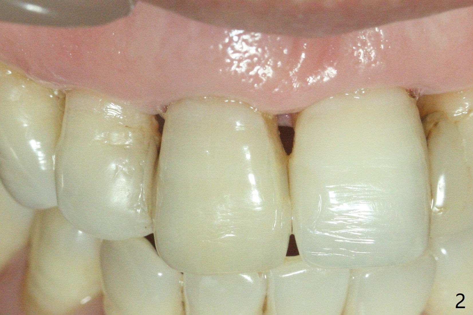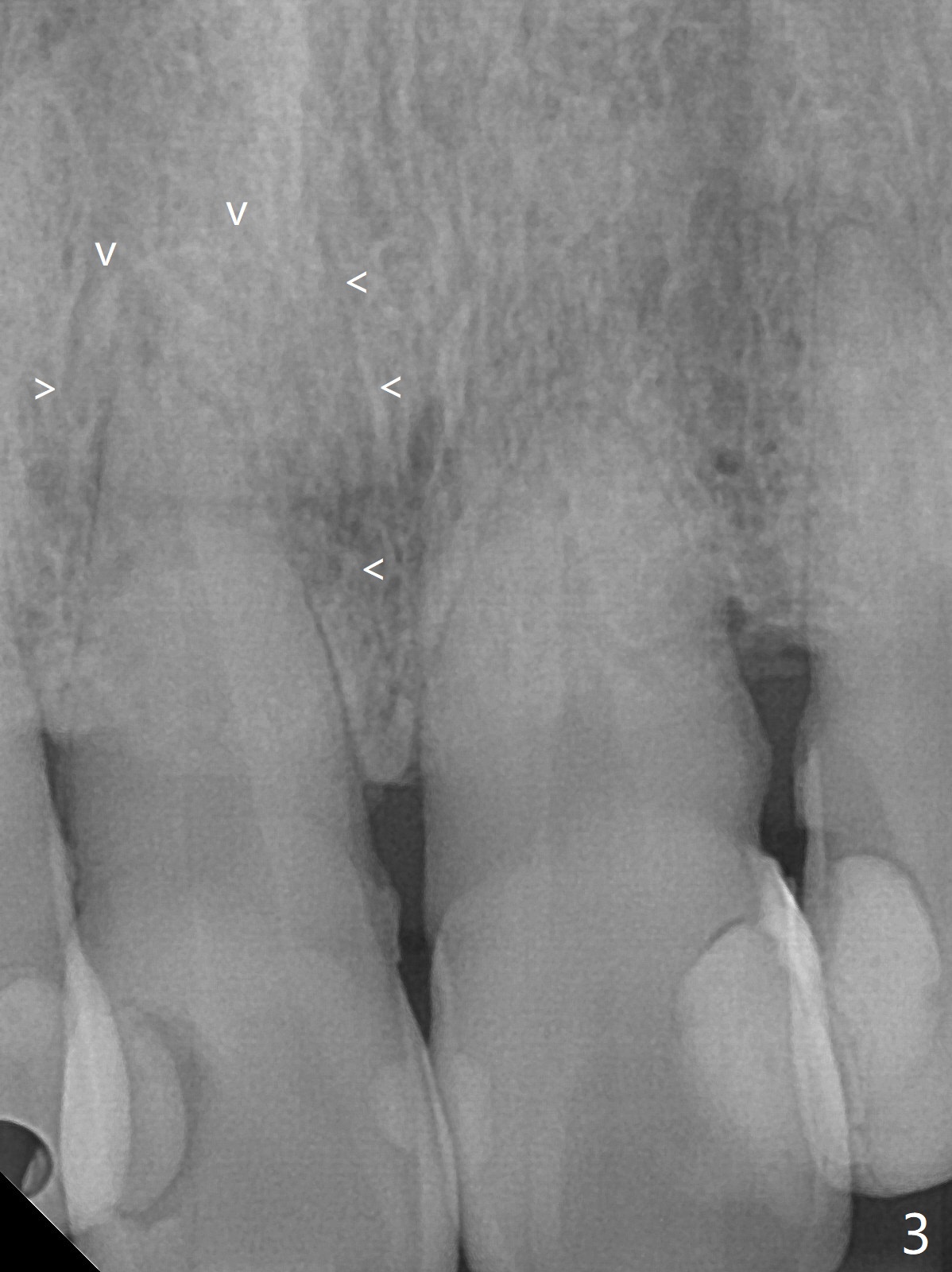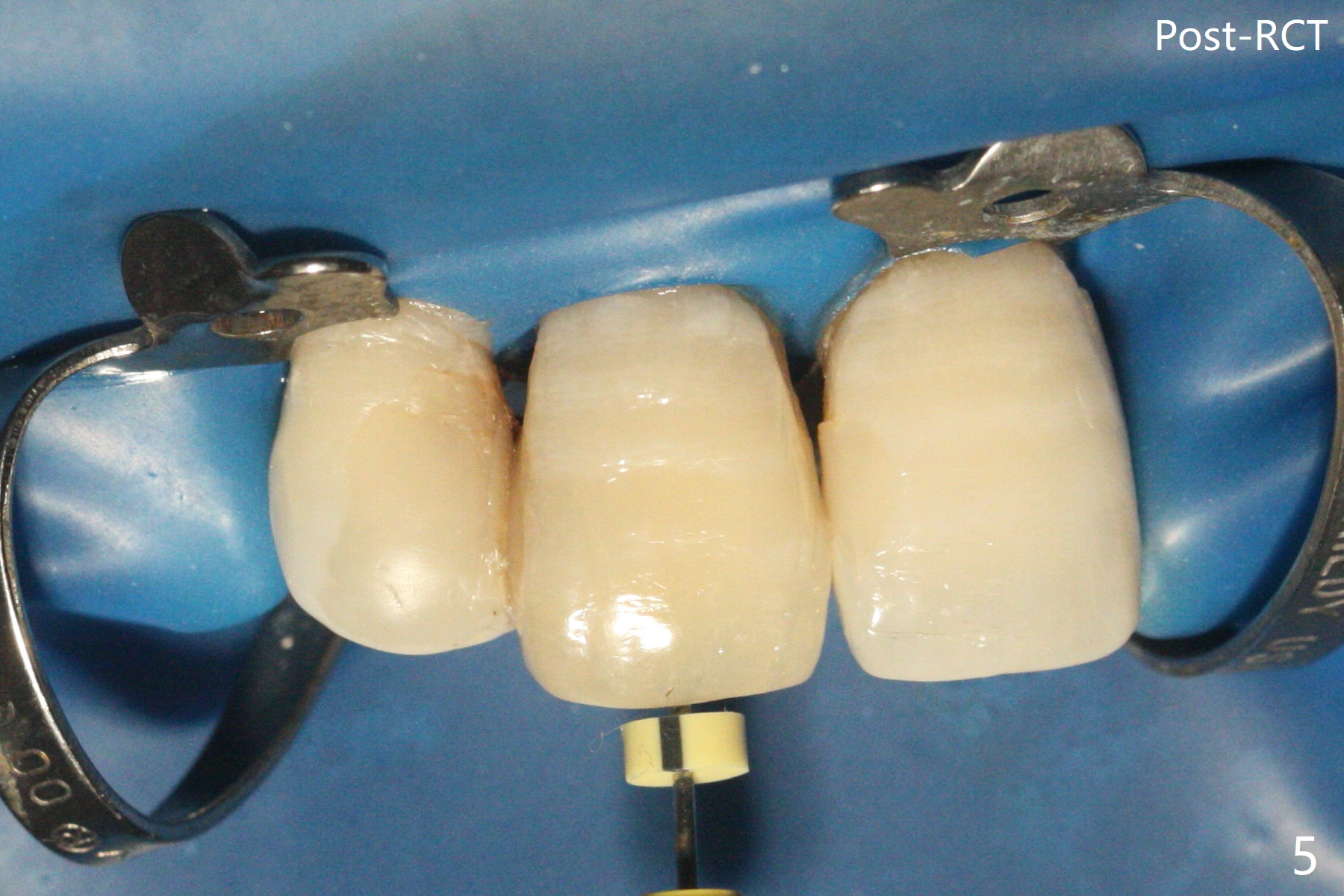单个门牙变色往往是牙髓坏死所致,根管充填后做漂白,防止漂白泡沫跑到根尖孔之外,这种顺序可以改变吗?53岁女右上1根尖无痛性红肿(图一:^),牙冠变色(图二),牙髓测定:死髓,伴有根尖阴影(图三),中切牙需要根管治疗,什么时候漂白最好,步骤便利?根管治疗后做内漂白,必须把牙胶尖取出,釉牙骨质交界处之下,牙冠长,如这个病例,取出可能困难。我们准备尝试根管治疗当中做漂白,由于死髓牙,根管治疗可以不需要局麻,三个牙齿暴露在橡皮障之外(图四),以便术中漂白观察。根管治疗当中使用大量漂白水,好象并没有改善颜色(图五)。所以在根管口(图六)注入35%双氧水(漂白液,胶状),适当超越釉牙骨质交界处。万一双氧水气泡跑出根尖孔,我们将用生理盐水冲洗,不过这个意外没发生。双氧水也放置在患牙表面(外漂白),两次漂白后(每次20分钟),病人满意牙冠颜色改变(图七)。冲洗,擦干后,在根管中放置氢氧化钙糊剂。预约一个月后完成根管充填,如果牙冠颜色反弹,再次漂白。充填前需要多次冲洗,清除残余双氧水,后者抑制树脂固化。