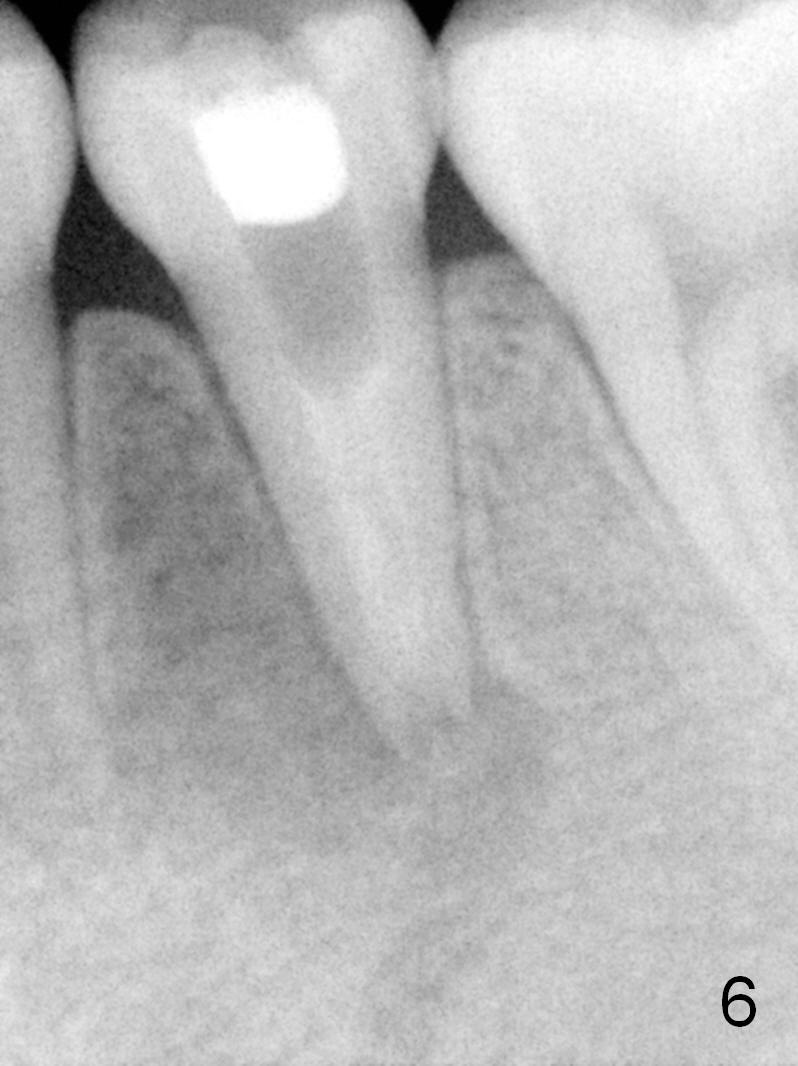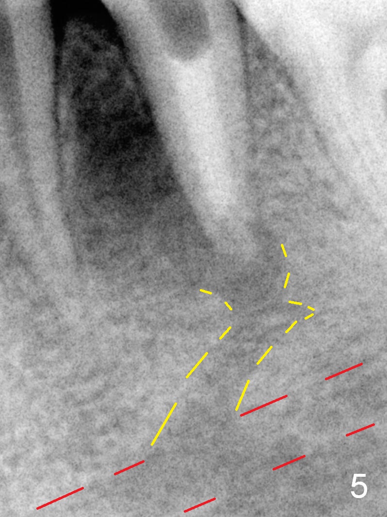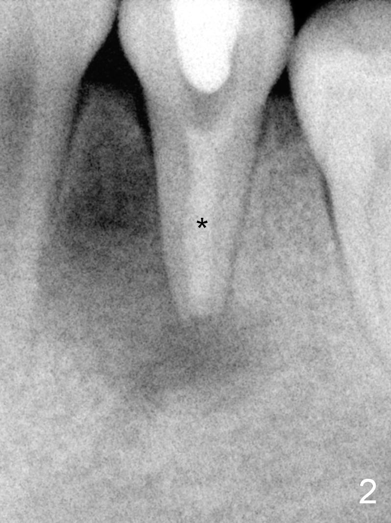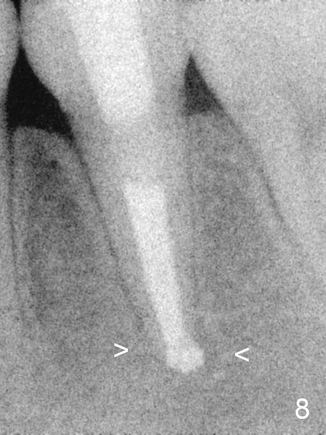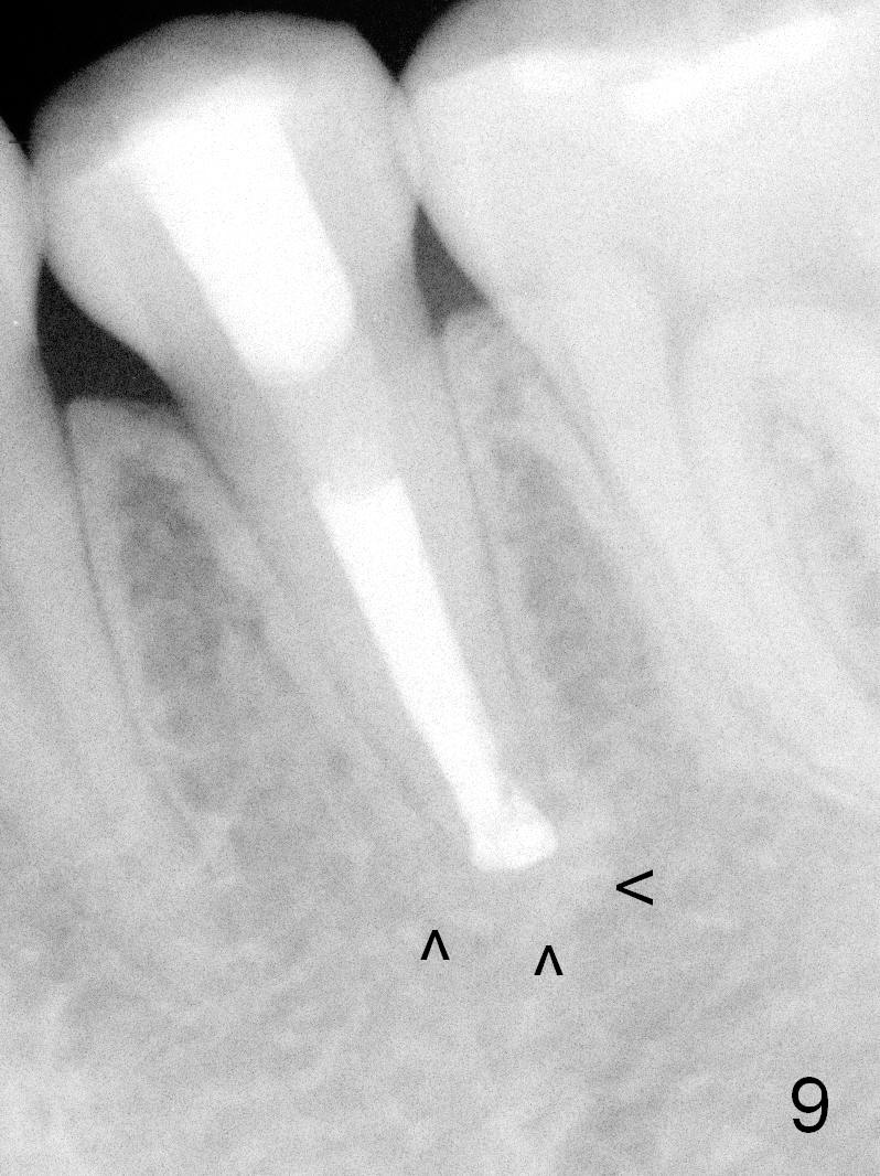 A 13-year-old girl has a buccal apical fistula at the tooth #20 with large periradicular radiolucency (Fig.1 *). After canal debridement, calcium hydroxide paste is placed in the canal (Fig.2 *). One month later, the fistula does not disappear with light percussion. New paste is placed (Fig.3). Two months later, the fistula disappears without percussion. The existing paste (Fig.4) is changed (Fig.5 (yellow: radiolucency; red: Inferior Alveolar Canal)). Another 2 months later, the fistula does not recur; as before, the paste density decreases, so does periradicular radiolucency (Fig.6). Root canal is packed (Fig.7). Six months postop, periradicular radiolucency continues to decrease, while the lamina dura at the apex is discontinuous (Fig.8 between arrowheads). Seven years postop, the lamina dura at the apex is seemingly intact (Fig.9). The patient remains asymptomatic at #20. In fact there is an acute infection at #29.