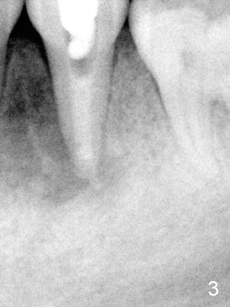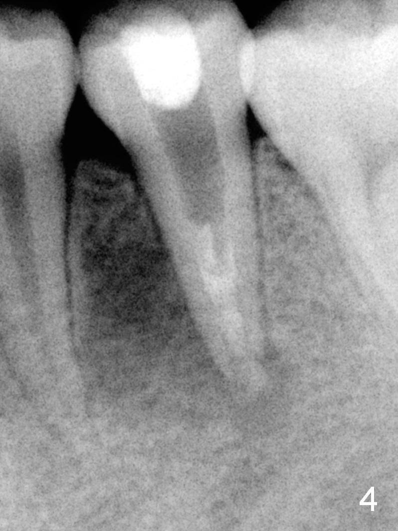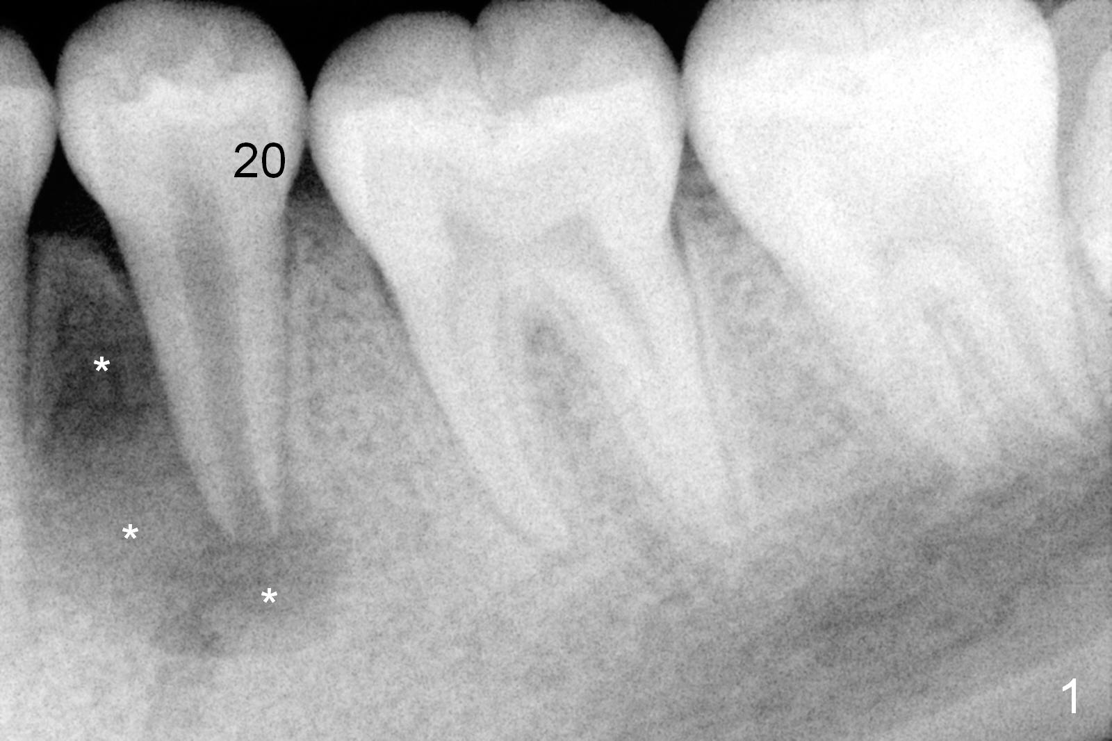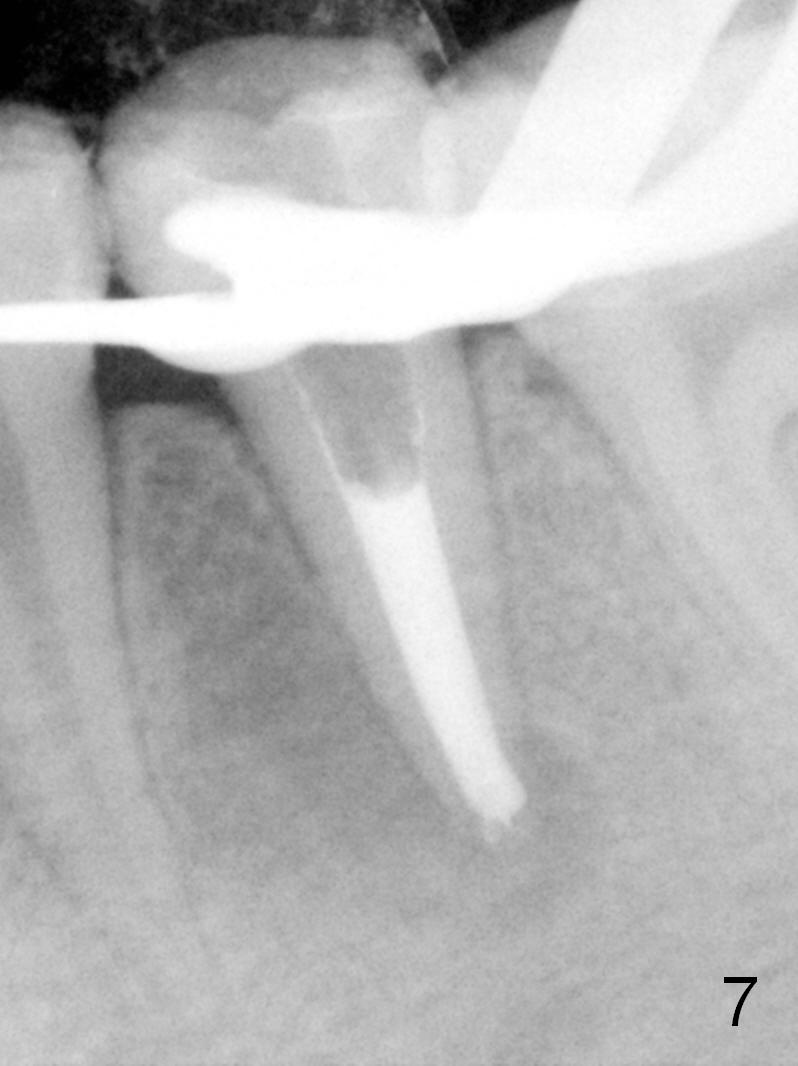 A 13-year-old girl has a buccal apical fistula at the tooth #20 with large periradicular radiolucency (Fig.1 *). After canal debridement, calcium hydroxide paste is placed in the canal (Fig.2 *). One month later, the fistula does not disappear with light percussion. New paste is placed (Fig.3). Two months later, the fistula disappears without percussion. The existing paste (Fig.4) is changed (Fig.5 (yellow: radiolucency; red: Inferior Alveolar Canal)). Another 2 months later, the fistula does not recur; as before, the paste density decreases, so does periradicular radiolucency (Fig.6). Root canal is packed (Fig.7). Six months postop, periradicular radiolucency continues to decrease, while the lamina dura at the apex is discontinuous (Fig.8 between arrowheads). Seven years postop, the lamina dura at the apex is seemingly intact (Fig.9). The patient remains asymptomatic at #20. In fact there is an acute infection at #29.