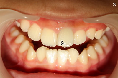 Two months later (September 03, 2011), the tooth #9 is found to be slightly discolored (Fig.3,4).