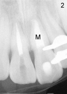 One month later (July 12, 2011), RCT was finished with gutta percha for #8, and white MTA (Dentsply, Tulsa) for #9 (M in Fig.2).  Approximately 8 mm of MTA was left in the canal.  Due to insurance coverage, composite build up was finished for #8, but not for #9.