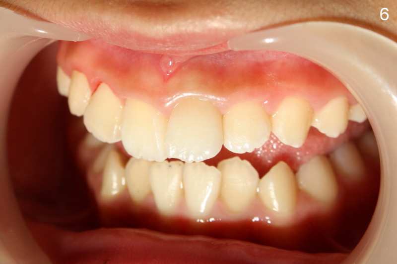Discoloration of the tooth #9 is improved approximately 1 month of take home internal and external bleaching (Fig.5).  Fig.6 is a lateral view after brief in office bleaching (due to in-cooperation) and composite build up.