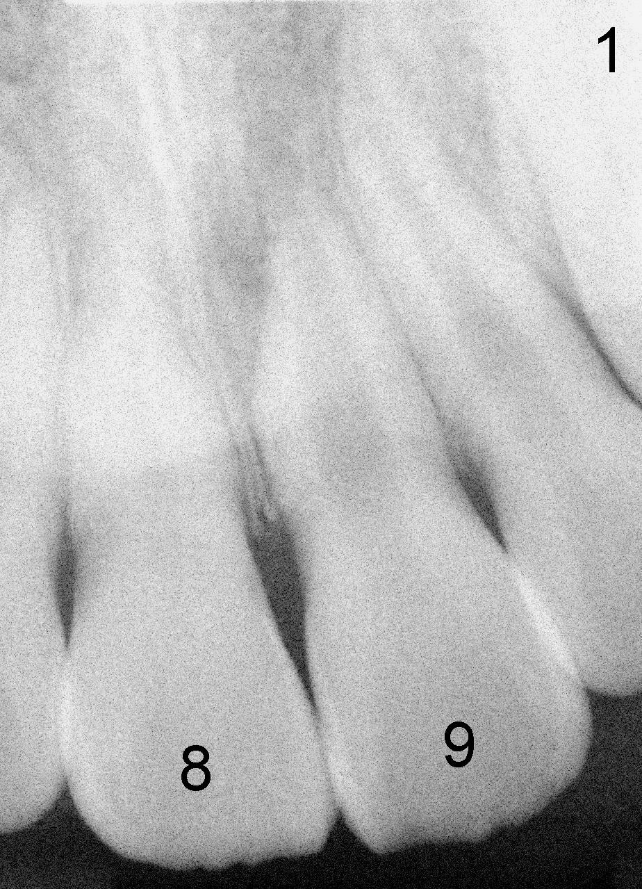 Initial exam shows that the crown of the tooth #8 is slightly discolored (not photographed) and #9 slightly labially shifted with mesioincisal edge chip.  There is no percussion, palpation pain or fistula associated with #8 or 9.  Pulpal vitality test (Endoice) shows that the teeth are reduced in response as compared to #7 and 10.  Pre-op PA shows that #8 canal is obliterated, whereas that of #9 is wide with open apex and + periapical radiolucency (Fig.1).