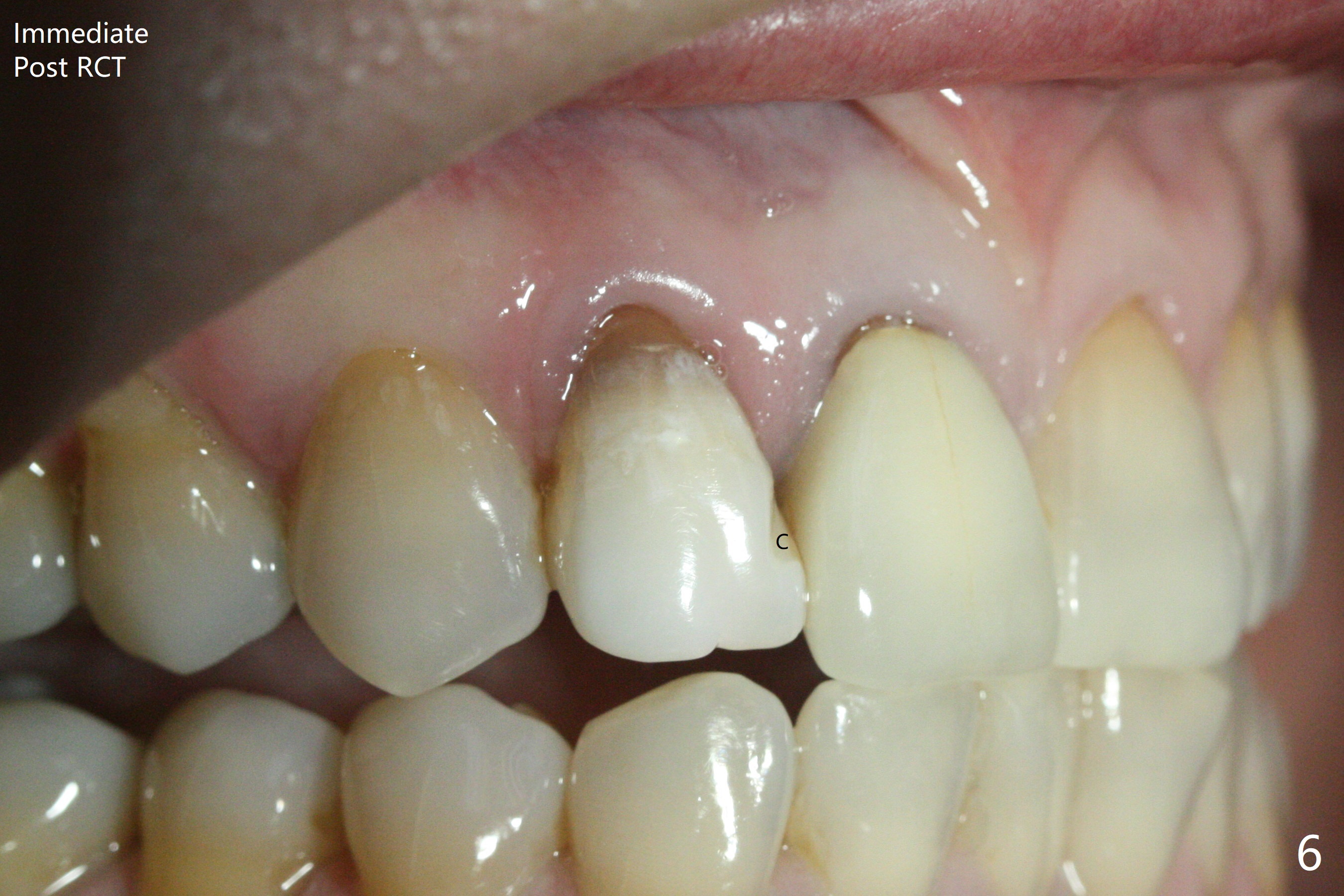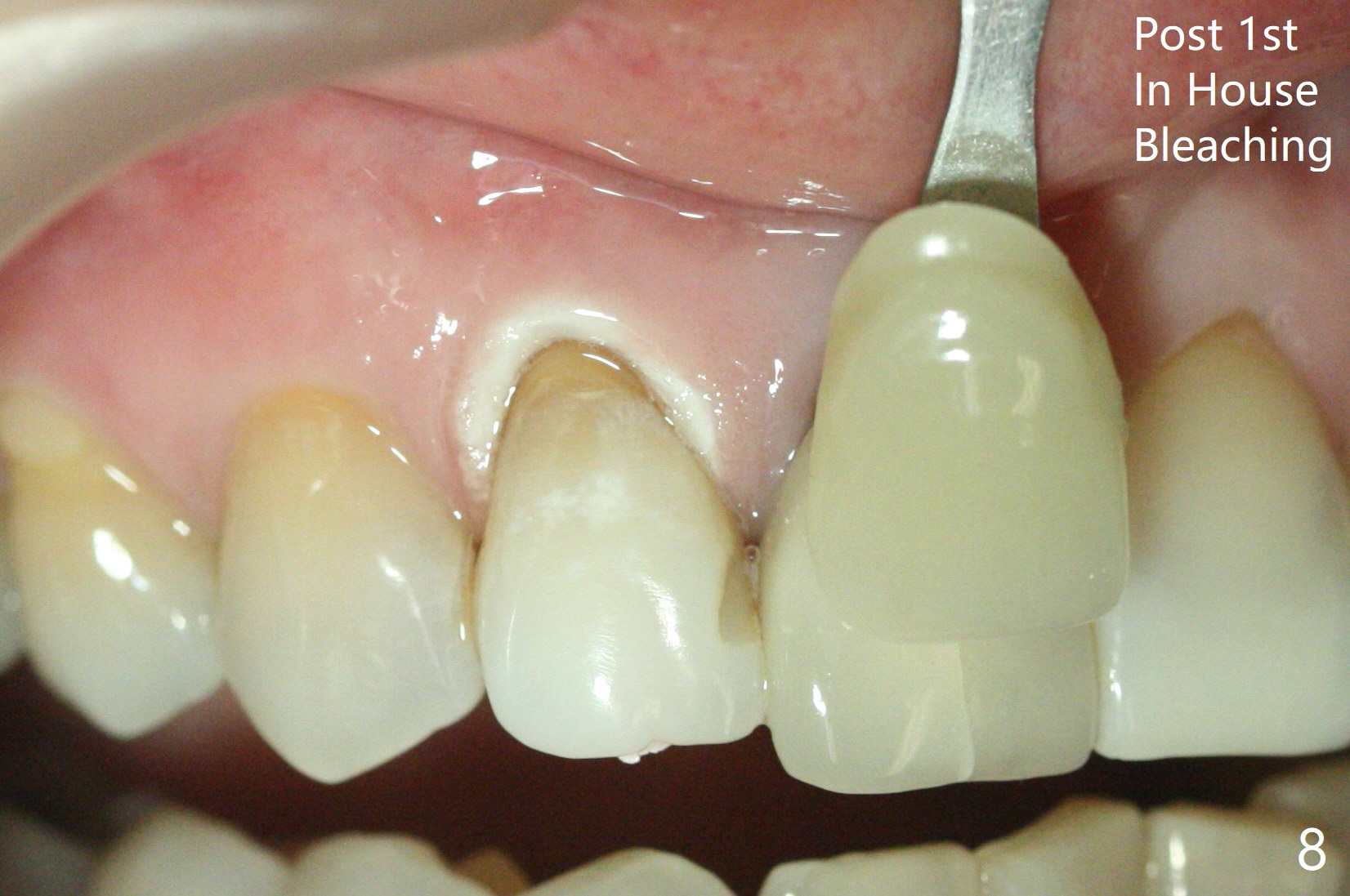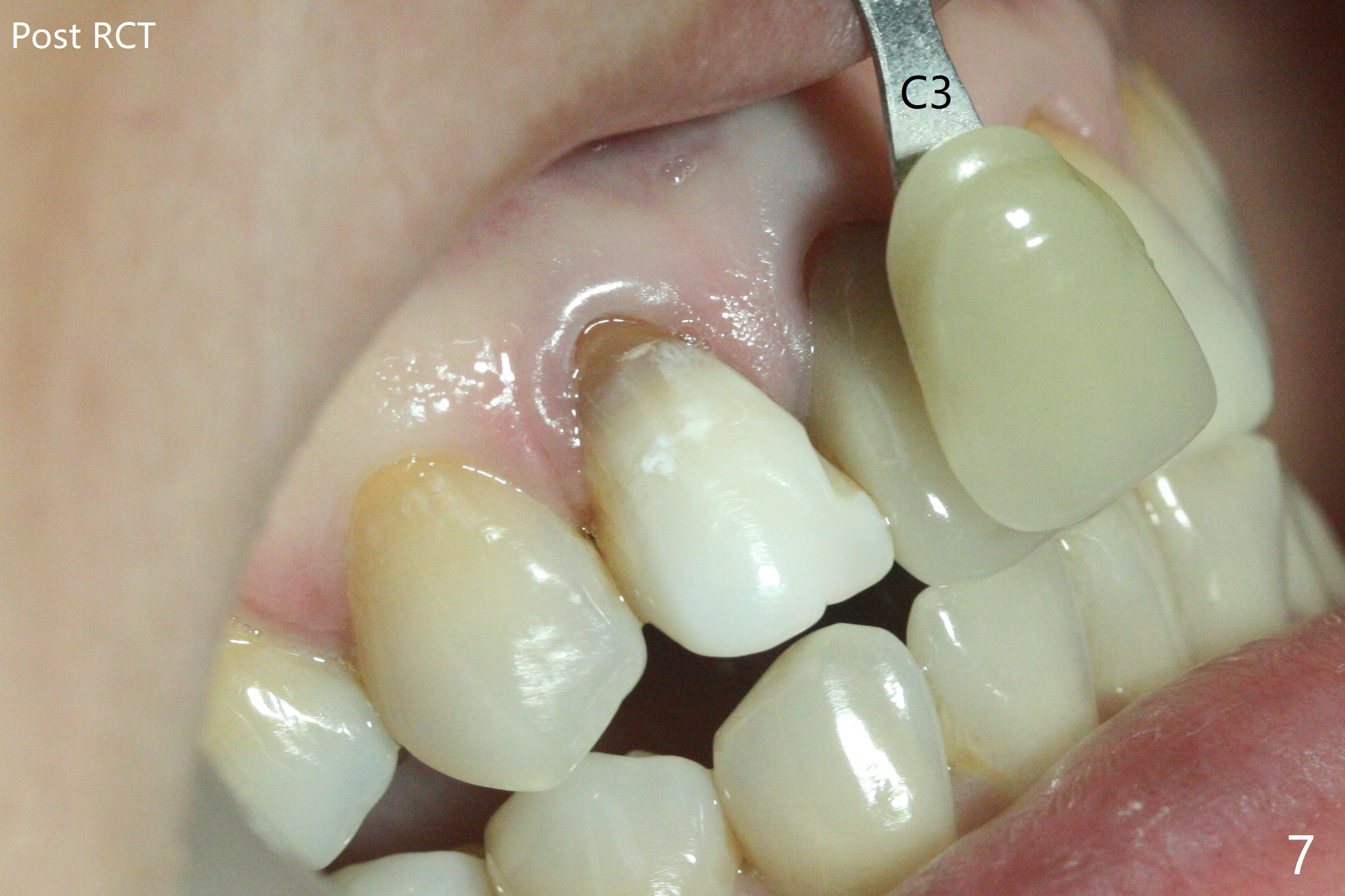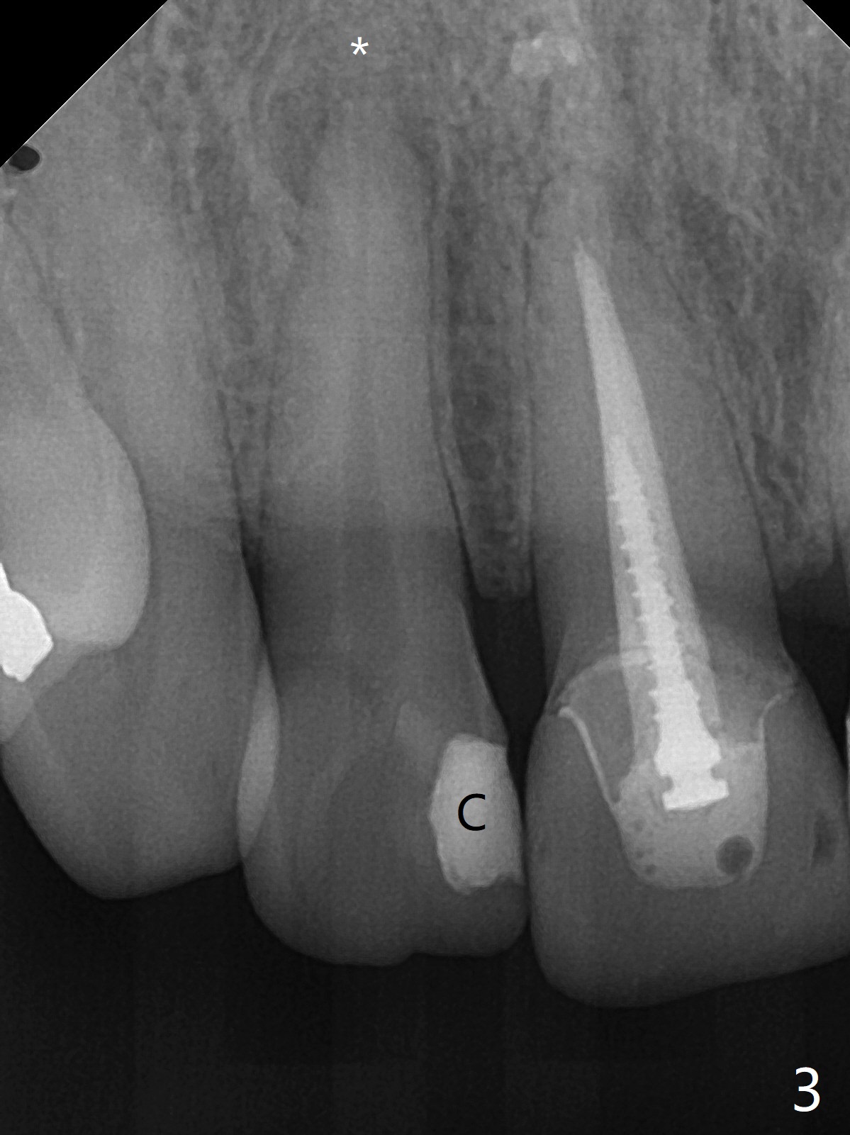 A 46-year-old woman requests a crown for the discolored tooth #7 (Fig.1,2) with mesiolingual composite (Fig.3 C) and periapical radiolucency (*). After RCT (Fig.4,5) with sodium hypochlorite, the tooth #7 is whiter than the ML composite (Fig.6,7). The patient returns 1 day post RCT for in house internal and external bleaching (Fig.8) with 35% hydrogen peroxide gel closed in the canal when she leaves. Three weeks later, the lateral incisor has the shade as the neighboring natural teeth (Fig.9,10). After the lightest shade composite placed in the canal and the access hole (Fig.11), the lateral looks better than the central with a crown and cervical discoloration (Fig.12).