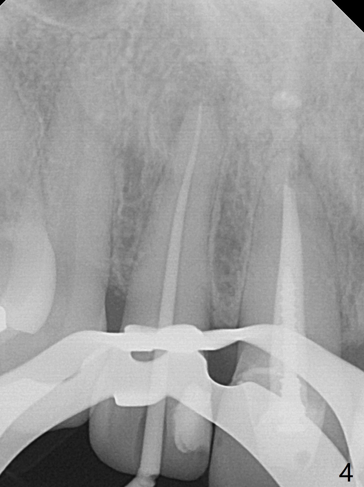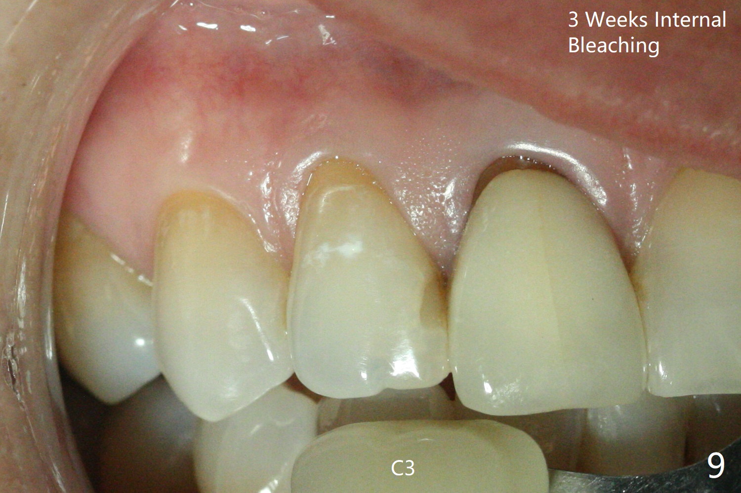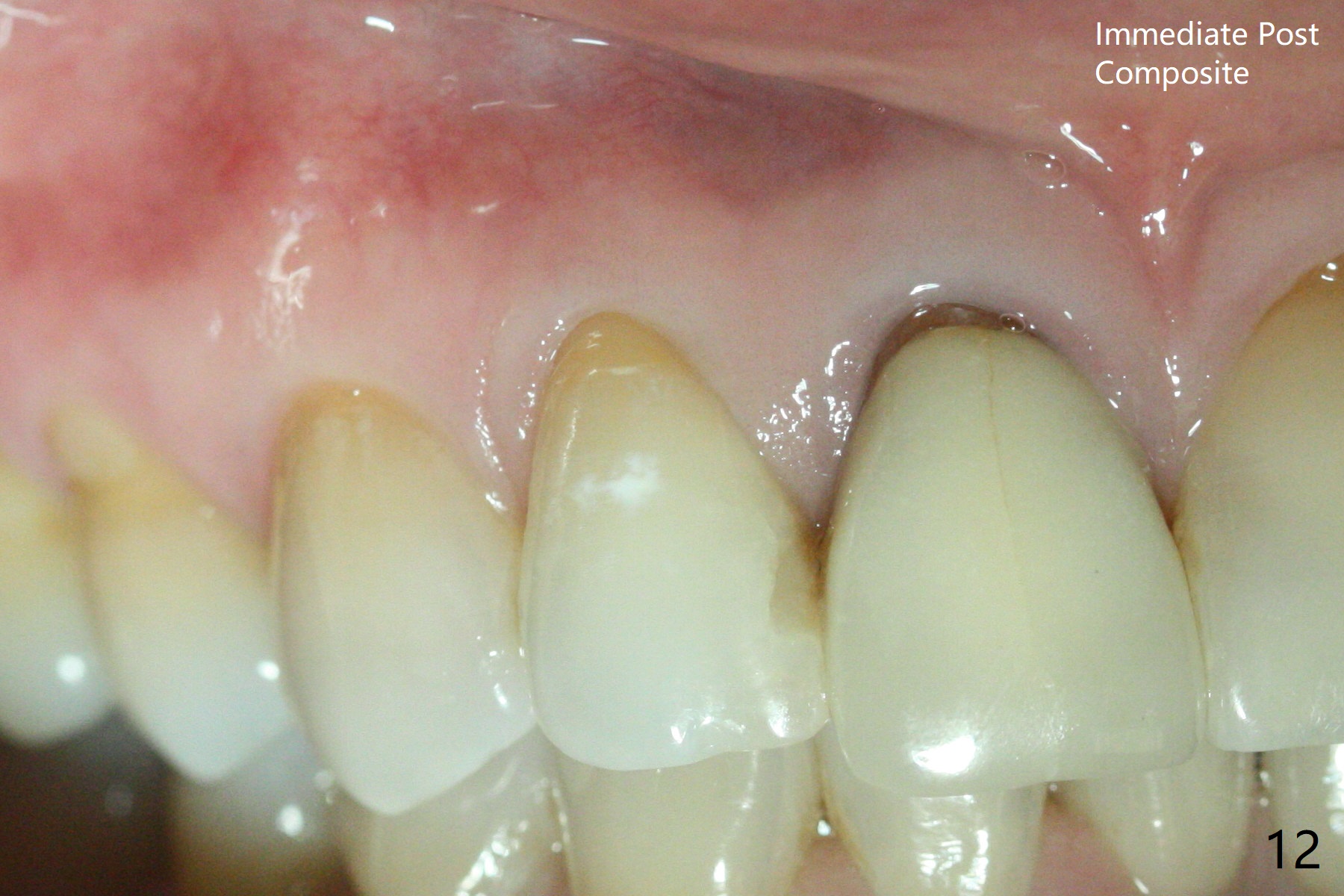 A 46-year-old woman requests a crown for the discolored tooth #7 (Fig.1,2) with mesiolingual composite (Fig.3 C) and periapical radiolucency (*). After RCT (Fig.4,5) with sodium hypochlorite, the tooth #7 is whiter than the ML composite (Fig.6,7). The patient returns 1 day post RCT for in house internal and external bleaching (Fig.8) with 35% hydrogen peroxide gel closed in the canal when she leaves. Three weeks later, the lateral incisor has the shade as the neighboring natural teeth (Fig.9,10). After the lightest shade composite placed in the canal and the access hole (Fig.11), the lateral looks better than the central with a crown and cervical discoloration (Fig.12).