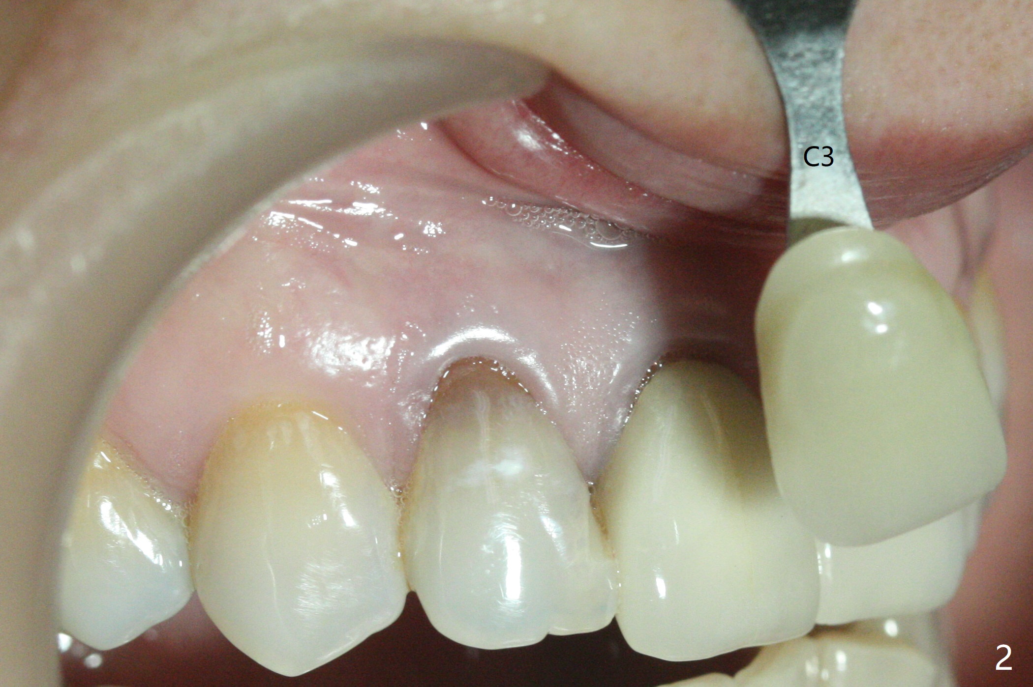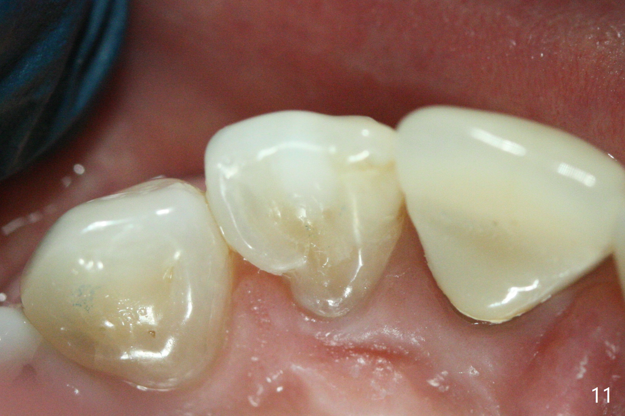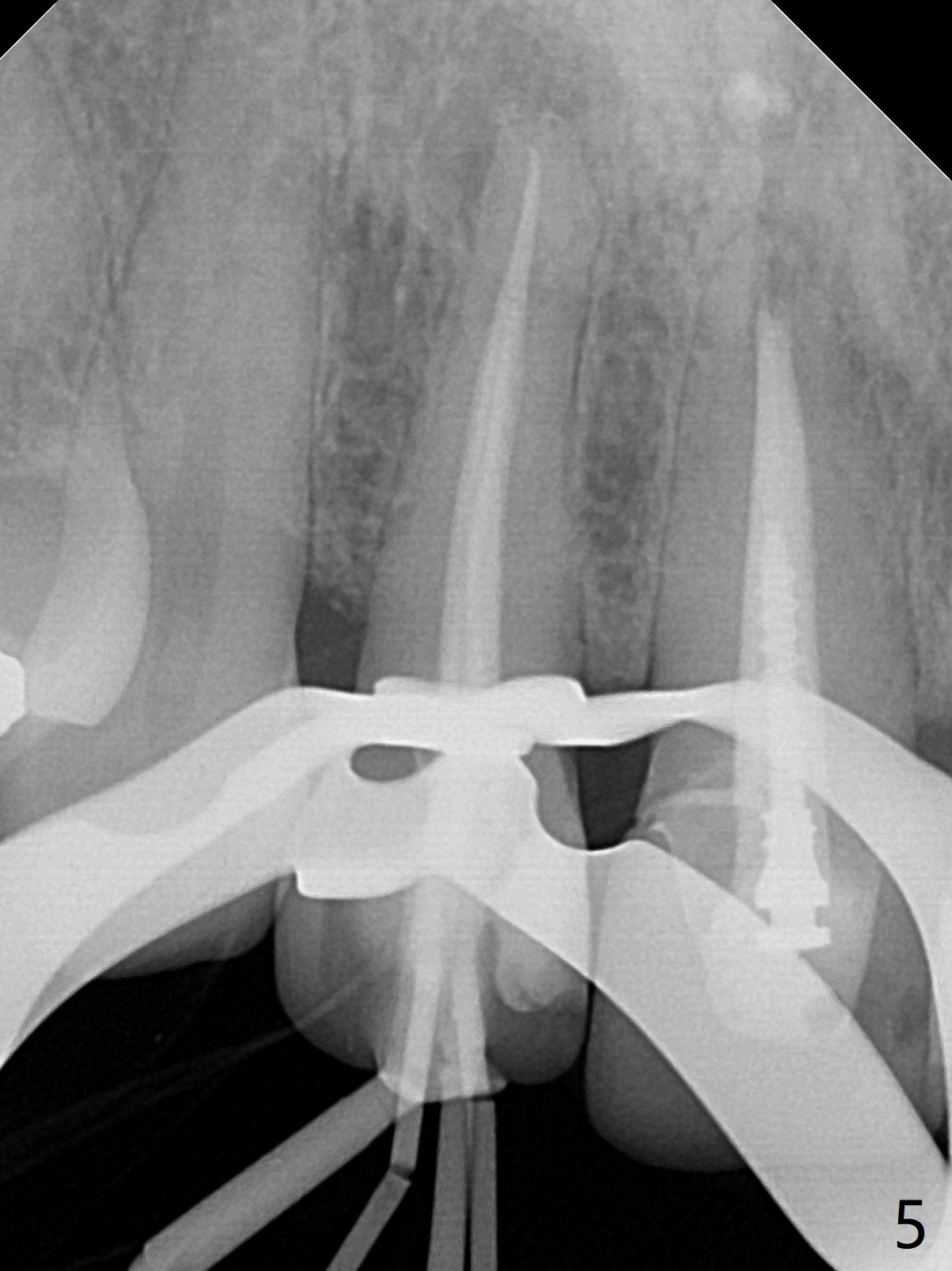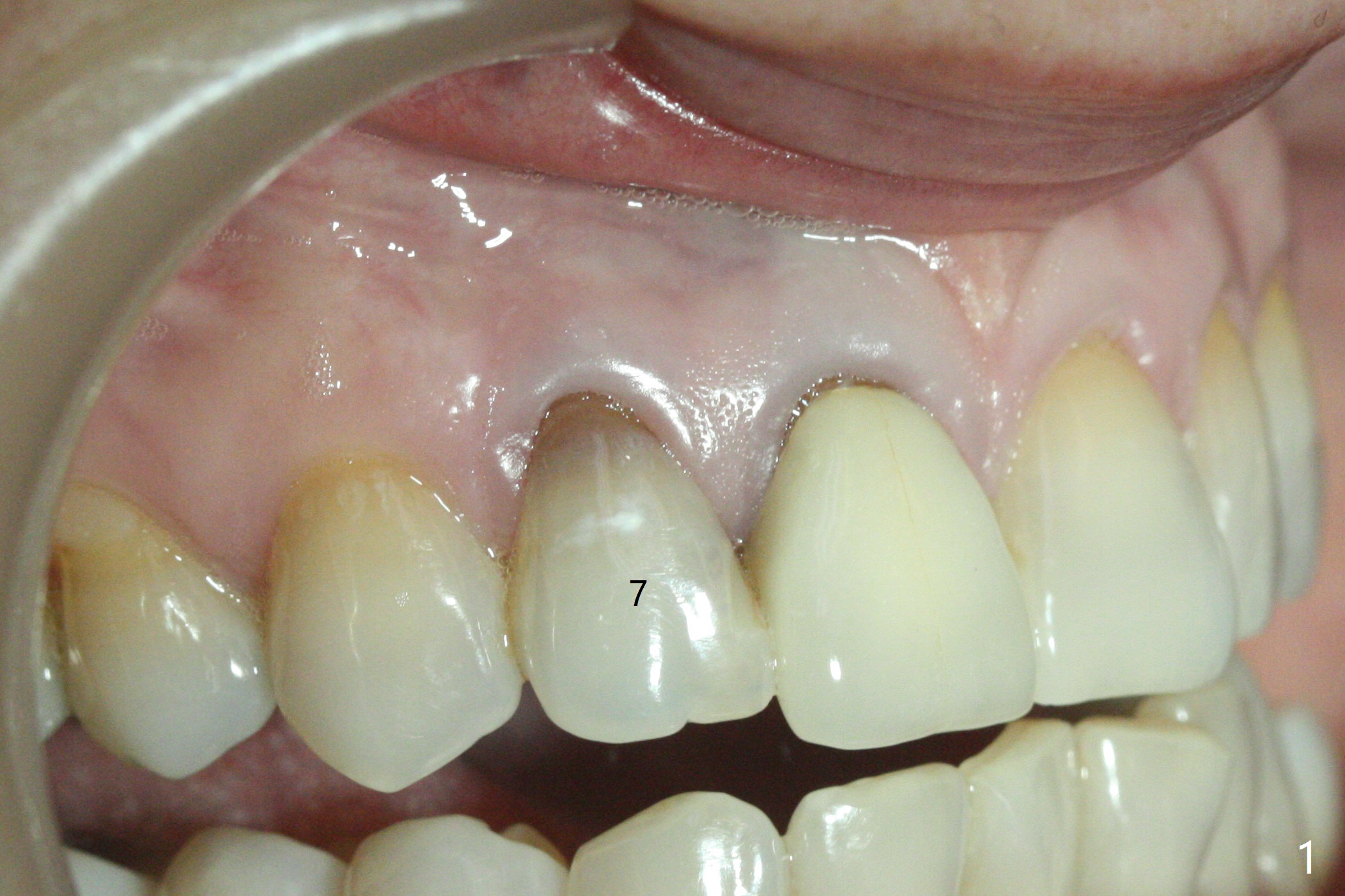 A 46-year-old woman requests a crown for the discolored tooth #7 (Fig.1,2) with mesiolingual composite (Fig.3 C) and periapical radiolucency (*). After RCT (Fig.4,5) with sodium hypochlorite, the tooth #7 is whiter than the ML composite (Fig.6,7). The patient returns 1 day post RCT for in house internal and external bleaching (Fig.8) with 35% hydrogen peroxide gel closed in the canal when she leaves. Three weeks later, the lateral incisor has the shade as the neighboring natural teeth (Fig.9,10). After the lightest shade composite placed in the canal and the access hole (Fig.11), the lateral looks better than the central with a crown and cervical discoloration (Fig.12).