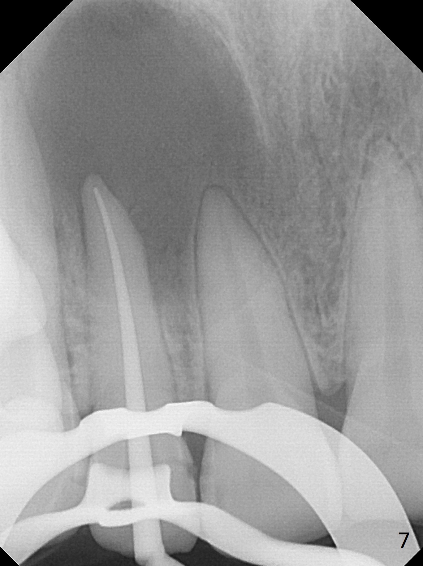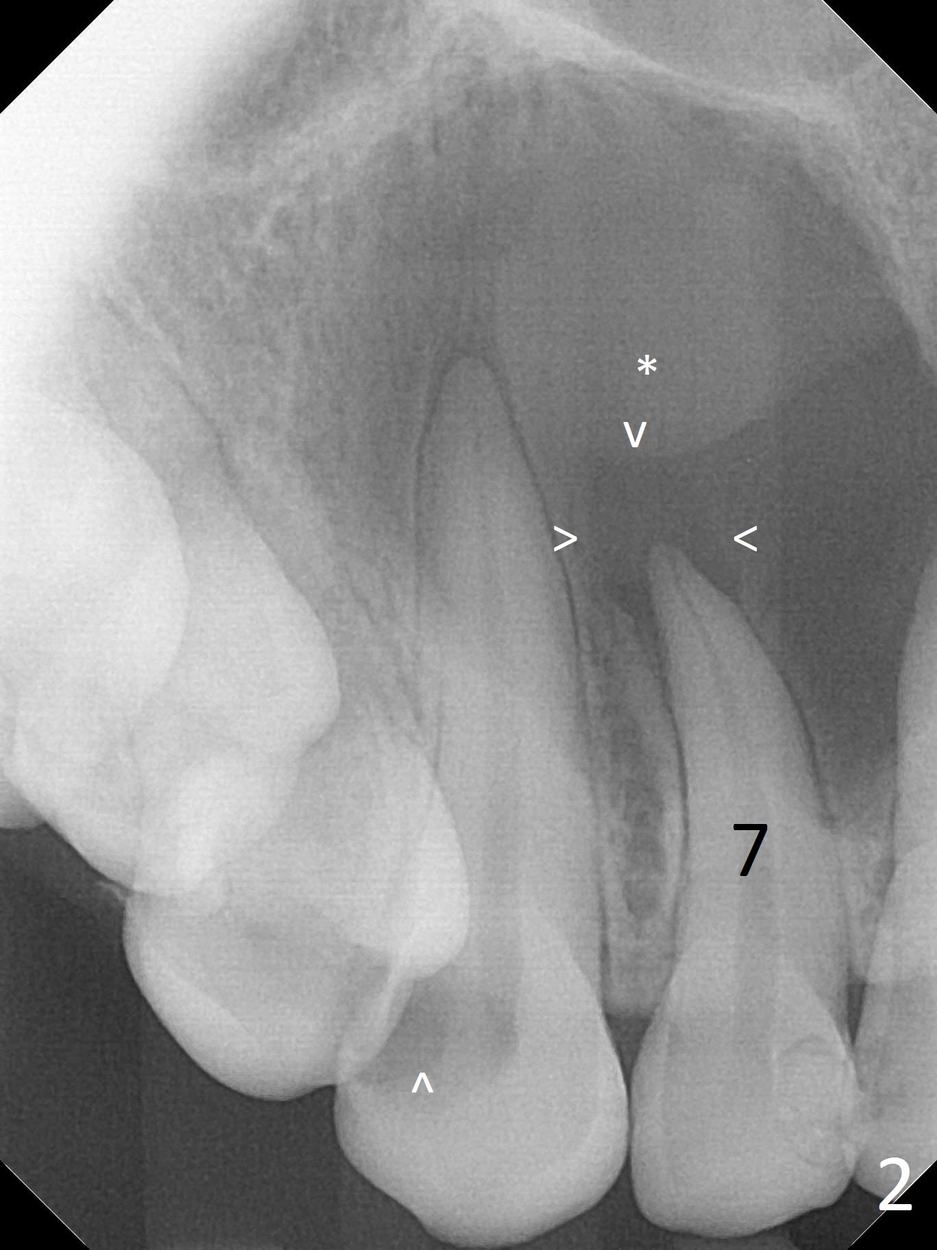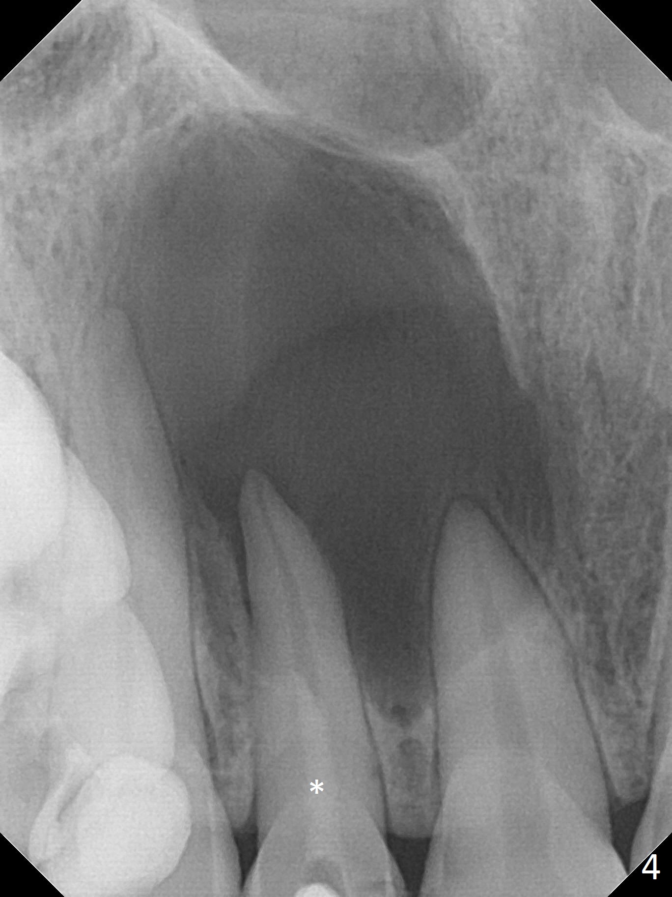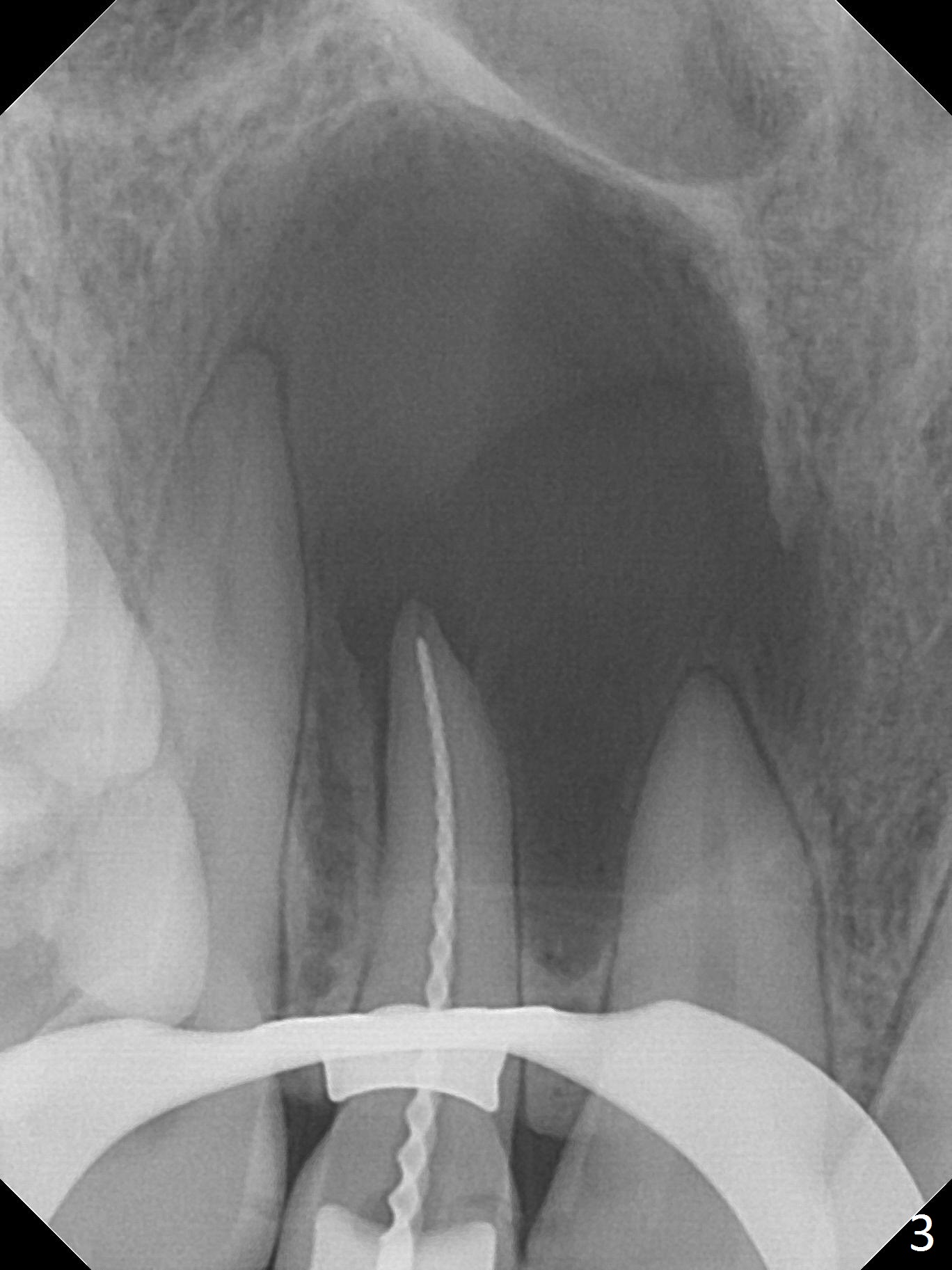 A 30-year-old woman presents to clinic with a large palatal swelling (Fig.1,2). In fact the tooth #7 is necrotic with a periapical radiolucency (Fig.2 arrowheads). RCT is initiated; note the curved canal and file (Fig.3). To reduce the large lesion, Calcium Hydroxide paste is placed in the enlarged canal (Fig.4 *). In a month, the palatal lesion decreases (Fig.5). After re-debridement of the canal, Calcium Hydroxide paste is re-applied.