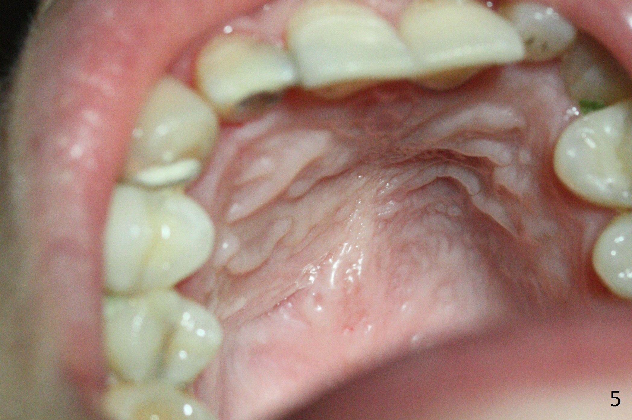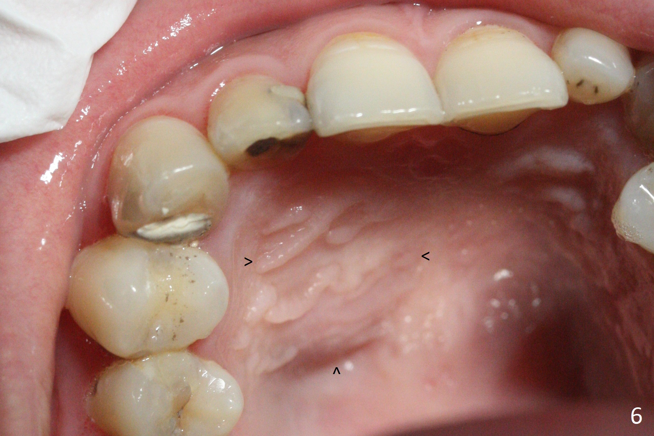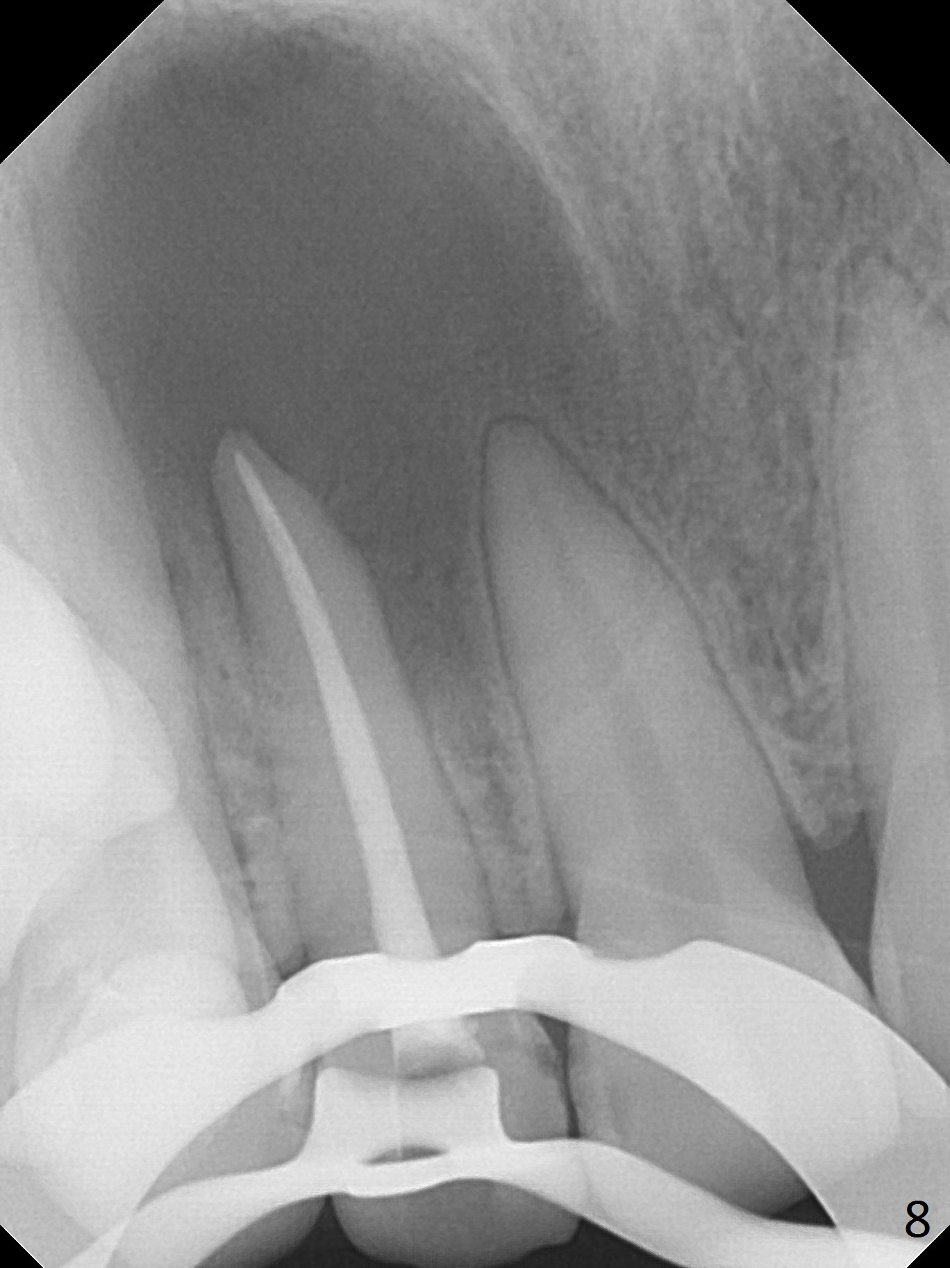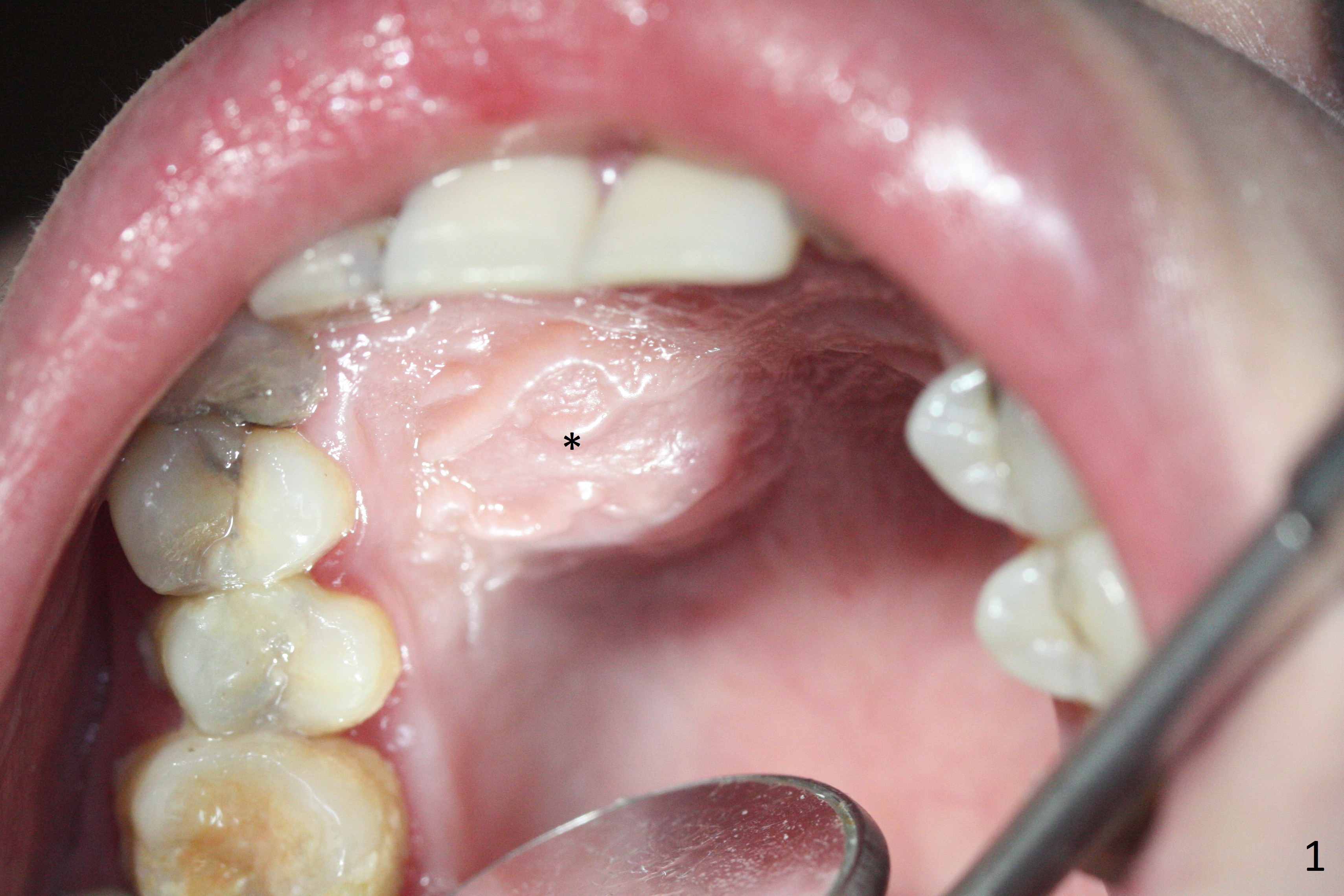 A 30-year-old woman presents to clinic with a large palatal swelling (Fig.1,2). In fact the tooth #7 is necrotic with a periapical radiolucency (Fig.2 arrowheads). RCT is initiated; note the curved canal and file (Fig.3). To reduce the large lesion, Calcium Hydroxide paste is placed in the enlarged canal (Fig.4 *). In a month, the palatal lesion decreases (Fig.5). After re-debridement of the canal, Calcium Hydroxide paste is re-applied.