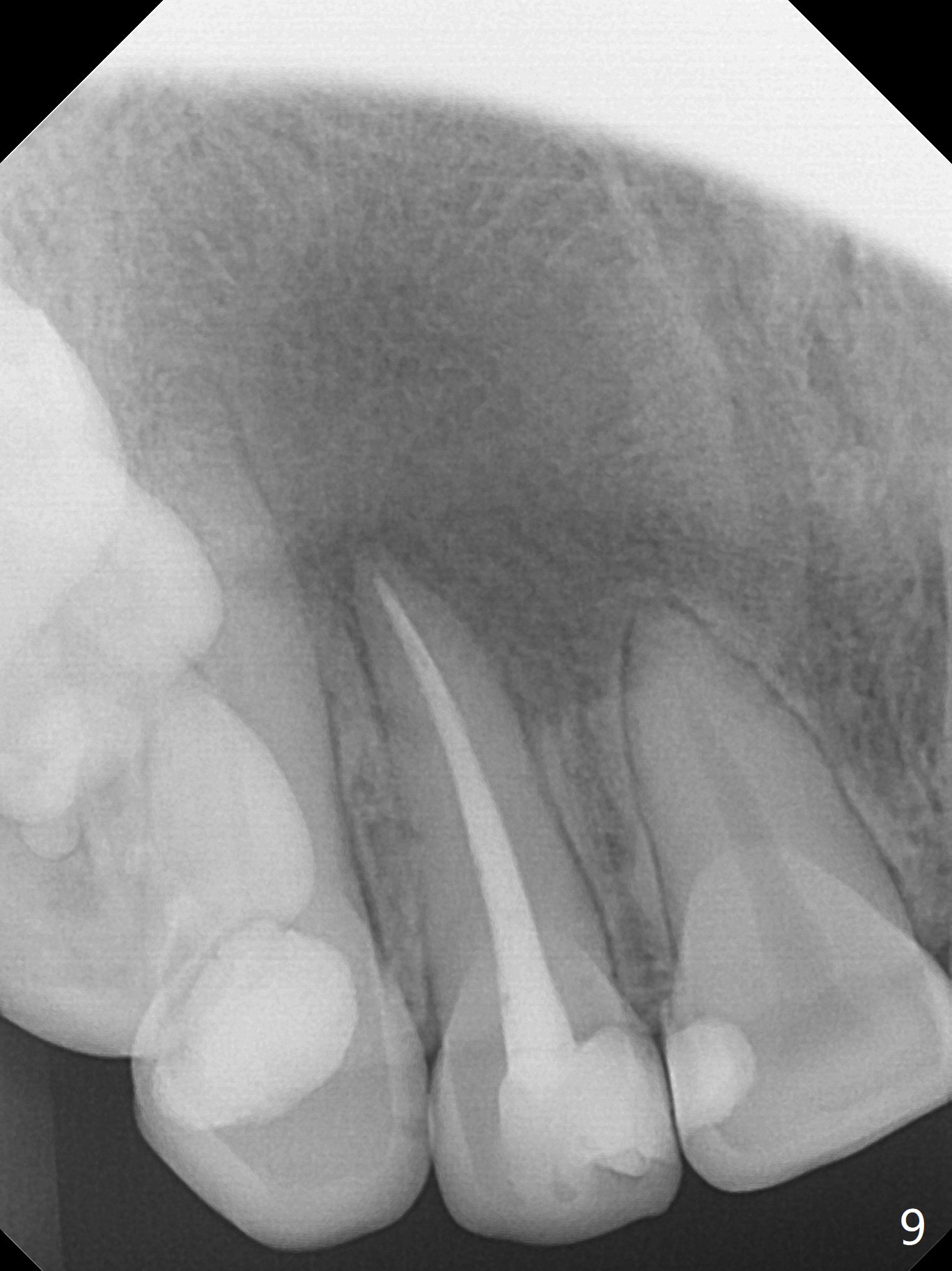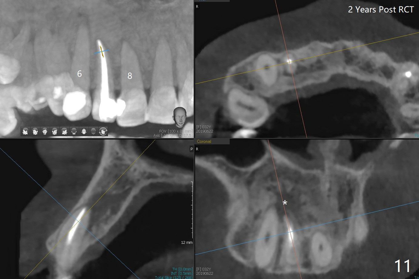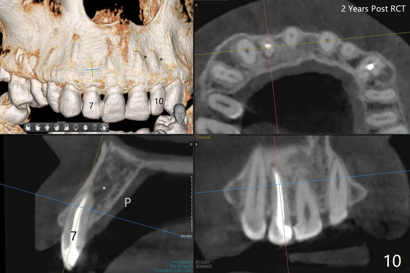 When this patient returns with improvement of symptoms, RCT will be finished. In fact the swelling relapses a month later (Fig.6). After discussion of possible cyst enucleation and increase in debridement from 30/.04 to 40/.06, a master cone of 40/.06 is inserted (Fig.7) and RCT is finished (Fig.8). Although the patient reports relapse of swelling, the palate looks normal and bone density increases 7 months postop (Fig.9). For 14 implant placement, CT is taken 2 years 1 month post RCT (Fig.10,11). Radiolucency is confined to the apex of the tooth #7 (white *). The labial concavities mesial and distal to the left lateral incisor makes radiolucencies (bone loss) look more radiolucent, creating globumaxillary cyst image. The globumaxillary cyst is a terminology for its shape. It does not mean congenital in nature. The treatment is dependent upon vitality test of the involved teeth.