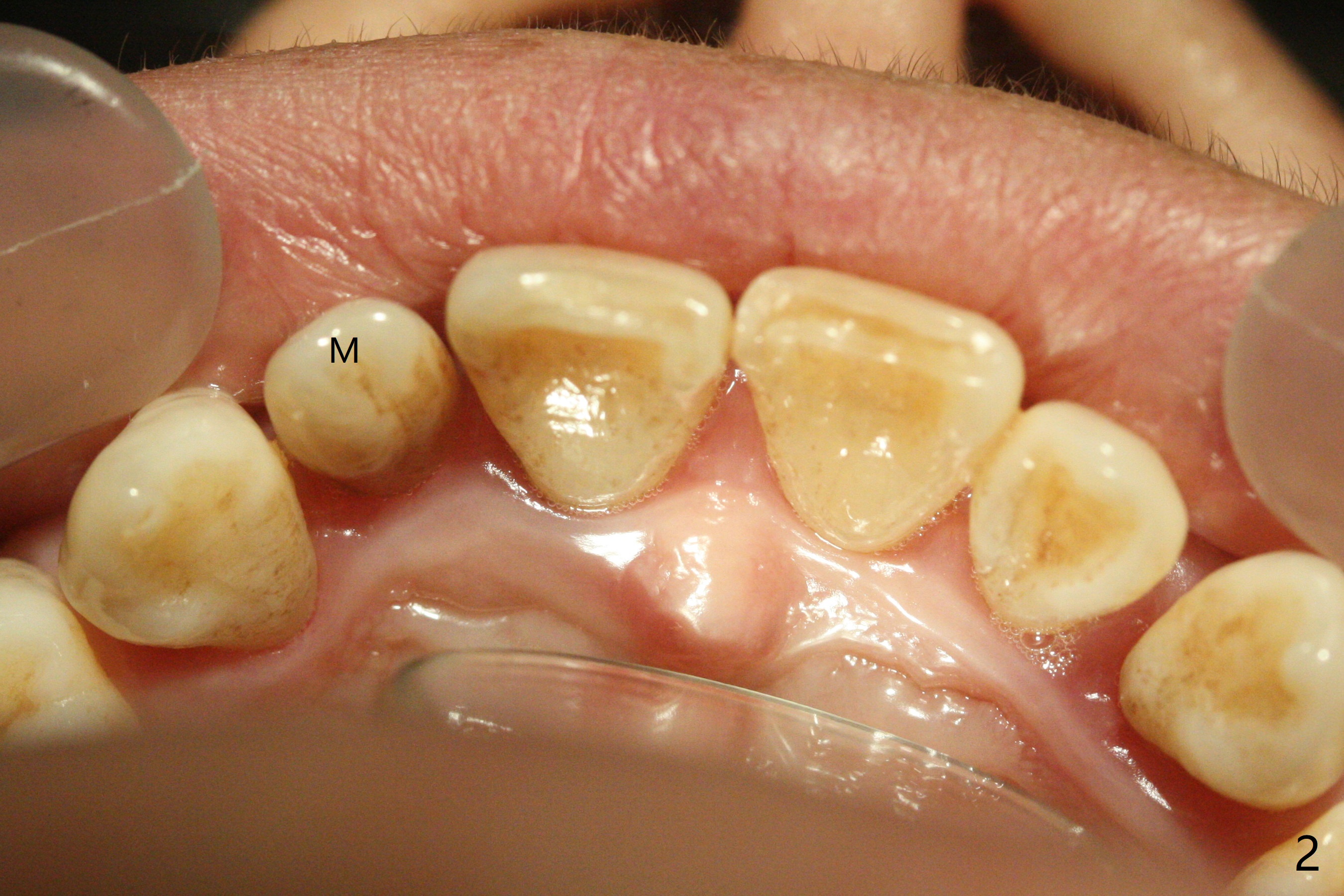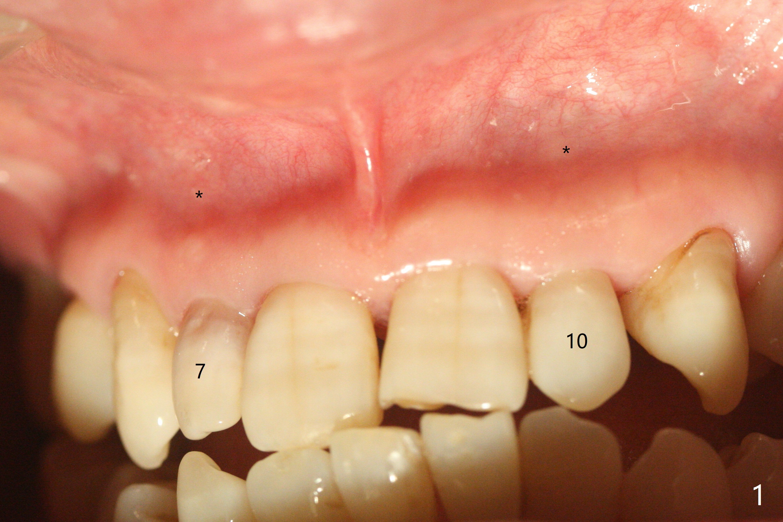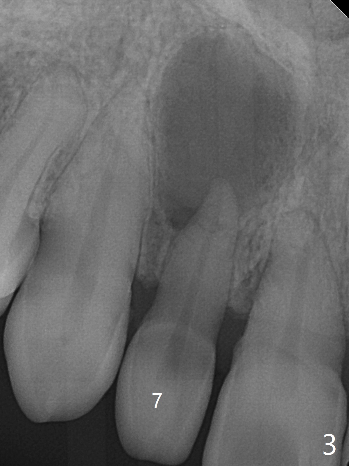 A 45-year-old woman presented to office for new patient examination. The latter reveals discoloration (Fig.1 necrosis on pulpal test; * labial concavity), microdontia with possible root canal malformation (Fig.2: M) and large inverted pear-shaped cyst (Fig.3) of the tooth #7. Guarded prognosis will be emphasized prior to treatment.