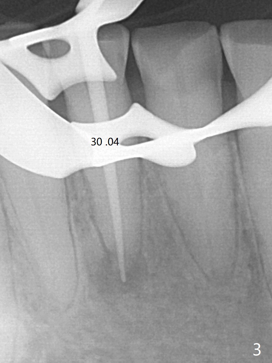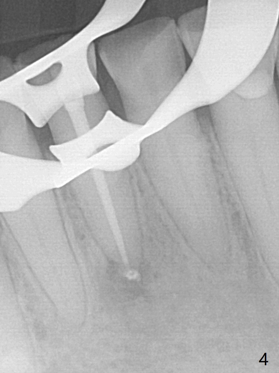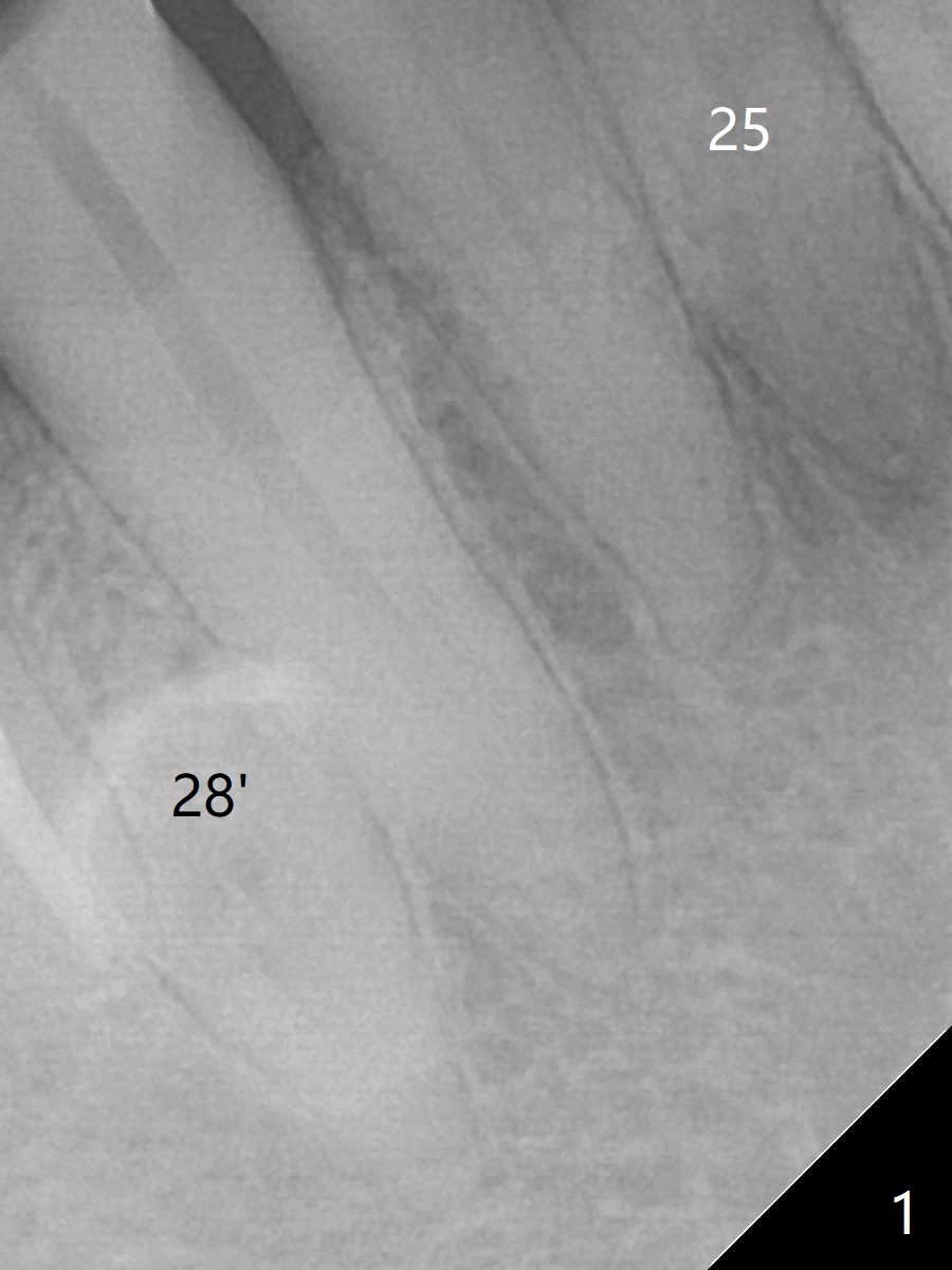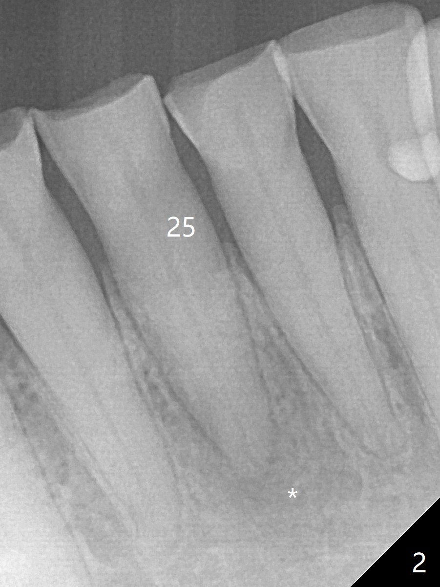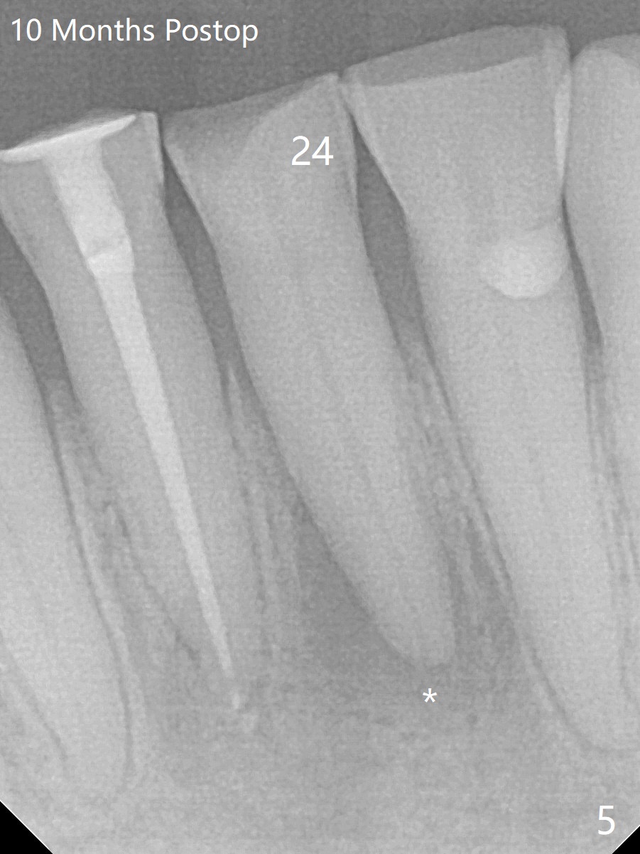 A 64-year-old man has multiple restoration and loves to eat crab. The lower incisors have severe wear. The tooth #25 is discolored with pulpal exposure and periapical radiolucency (Fig.1, 2 *). After insertion of 30/.04 master cone (Fig.3 (1 year 3 months post diagnosis)), RCT is finished with BioRoot RCS (bioceramic) and single GP (Fig.4). Nearly 10 months later, the patient returns with sinus track associated with the tooth #24 with PARL (Fig.5 *).