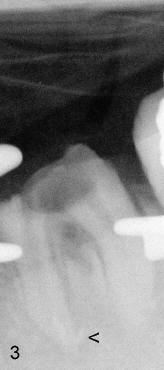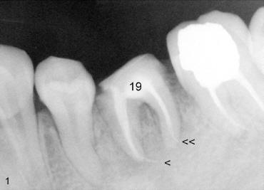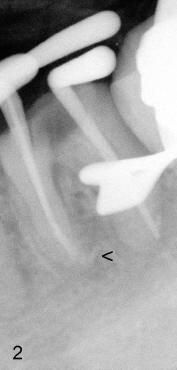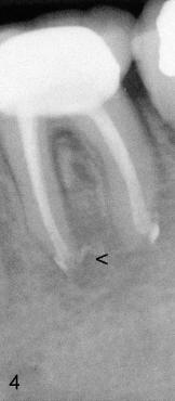 A 31-year-old otherwise healthy Chinese lady has had discomfort since RCT was done for the tooth #19 in home country ~2 years ago (Fig.1). Gutta percha (GP) appears to extrude both in mesial (<) and distal (<<) canals, surrounded by periapical radiolucency (PARL). Two carpules of 2% Lidocaine with 1:100,000 Epinephrine are used for RCT retreat. The patient does not experience any sharp pain during the first injection. Two rubber dams are used due to the short clinical crown of #19 (Fig.2,3). Fig.2 shows master cones (30/.06 M, 40/.06 D) after removal of existing gutta percha using Chloroform. It appears that extruded mesial GP remains outside the apex (< in Fig.2). It is confirmed after removing master cones (< in Fig.3). Working length is controlled by Apex locator during canal re-shaping using GT rotary files. In attempt to remove apparent GP in mesial canal(s) and extruded one outside the apex, #15 hand file is reused at WL+1mm with Chloroform for one or twice for each canal. After adjusting distal GP length, cold lateral condensation is finished with AH26 plus paste and pre-existing PFM crown is recemented (Fig.4). It is apparent that the previously extruded GP is not removed (< in Fig.4).
