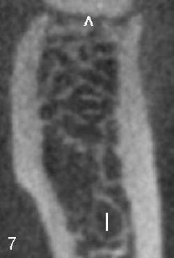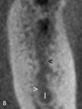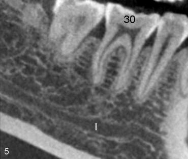 Cross sections through the furcae of #30 and 19 re-confirm that trabecular patterns are normal under the furca of #30 (< in Fig.7), whereas there is abnormal communication between PARL (above black < in Fig.8) and the inferior alveolar nerve (I).