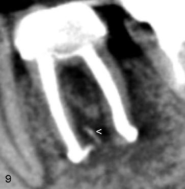 The nature of the abnormal communication is intriguing. It may be an abnormal branch of the inferior alveolar nerve. The reasoning is that the border of this communication (between black and white < in Fig.6,8) is as smooth as that of the inferior alveolar nerve. In contrast, the border of PARL is irregular and rough. The second possibility is that this abnormal communication is a pathological change similar to PARL. We may get an answer if we can follow up the case closely. If this RCT retreat proves to be successful, PA will be taken every 6 months. Once periapical lesion heals unambiguously in traditional X-ray, CBCT is retaken. If PARL disappears whereas the abnormal communication does not, the hypothesis of abnormal branch of the inferior alveolar nerve is established. This proves to be bad news for implantologist. He has less bone height (~ 6 mm in this case) to place an implant in the first molar area (Fig.6). The second possibility is that both PARL and the abnormal communication disappear together. To retreat overfilled cases, control of WL is paramount.