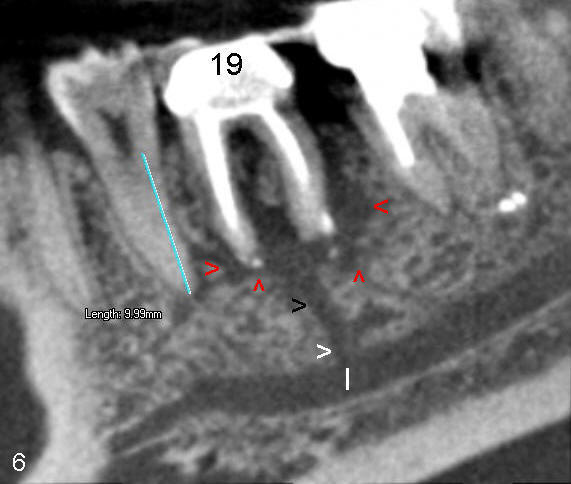 Fig.6  If PARL disappears whereas the abnormal communication does not, the hypothesis of abnormal branch of the inferior alveolar nerve is established.  This proves to be bad news for implantologist.  He has less bone height (~ 6 mm in this case) to place an implant in the first molar area, back to original article