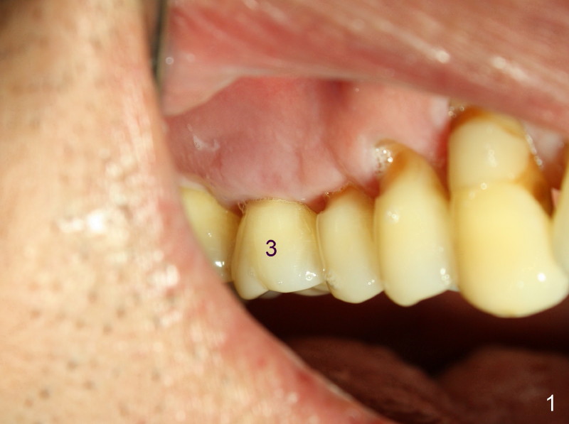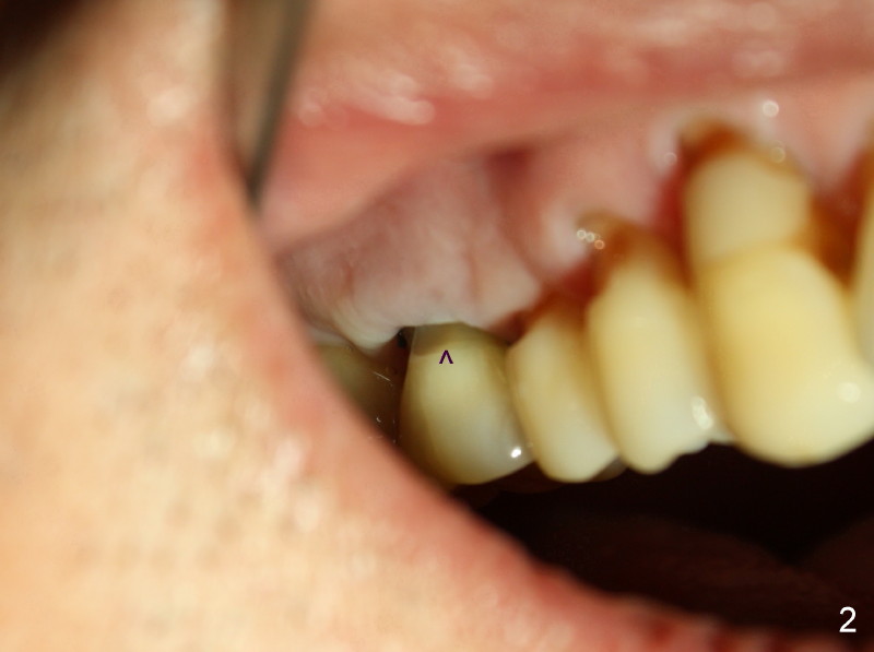 Most surprising is that the buccal aspect of the 1st molar looks normal after dissolution of apical infection (Fig.1). The cervical defect is revealed after insertion of gingival retraction cord (Fig.2 >). Composite restoration for the cervical defect is done prior to RCT.