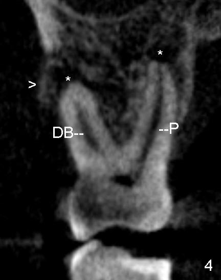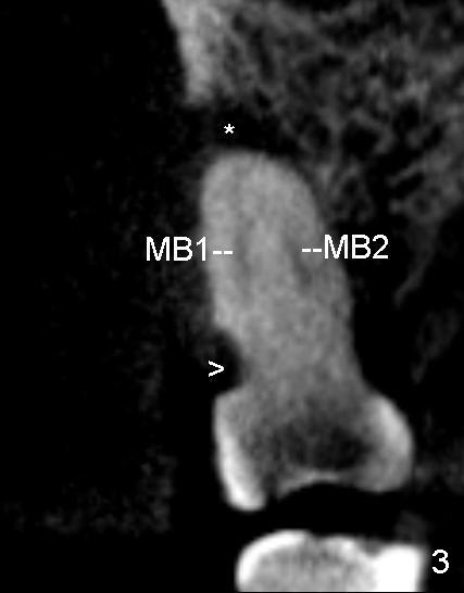 Due to complexity of the case, CBCT is done. The buccal plate is found to be lost completely over the mesiobuccal root (Fig.3), but partially over the distobuccal one (Fig.4 >). There is a deep cervical defect associated with MB root (Fig.3 >), whereas the defect is minimal over the DB root. More surprising is that periapical radiolucency is larger associated with MB1 (Fig.*) than any of the other canals (Fig.4 *) (including MB2, Fig.3). The Class V defect is close to MB1 (Fig.3). It appears that apical periodontitis is induced by Class V defect over the MB1 canal.