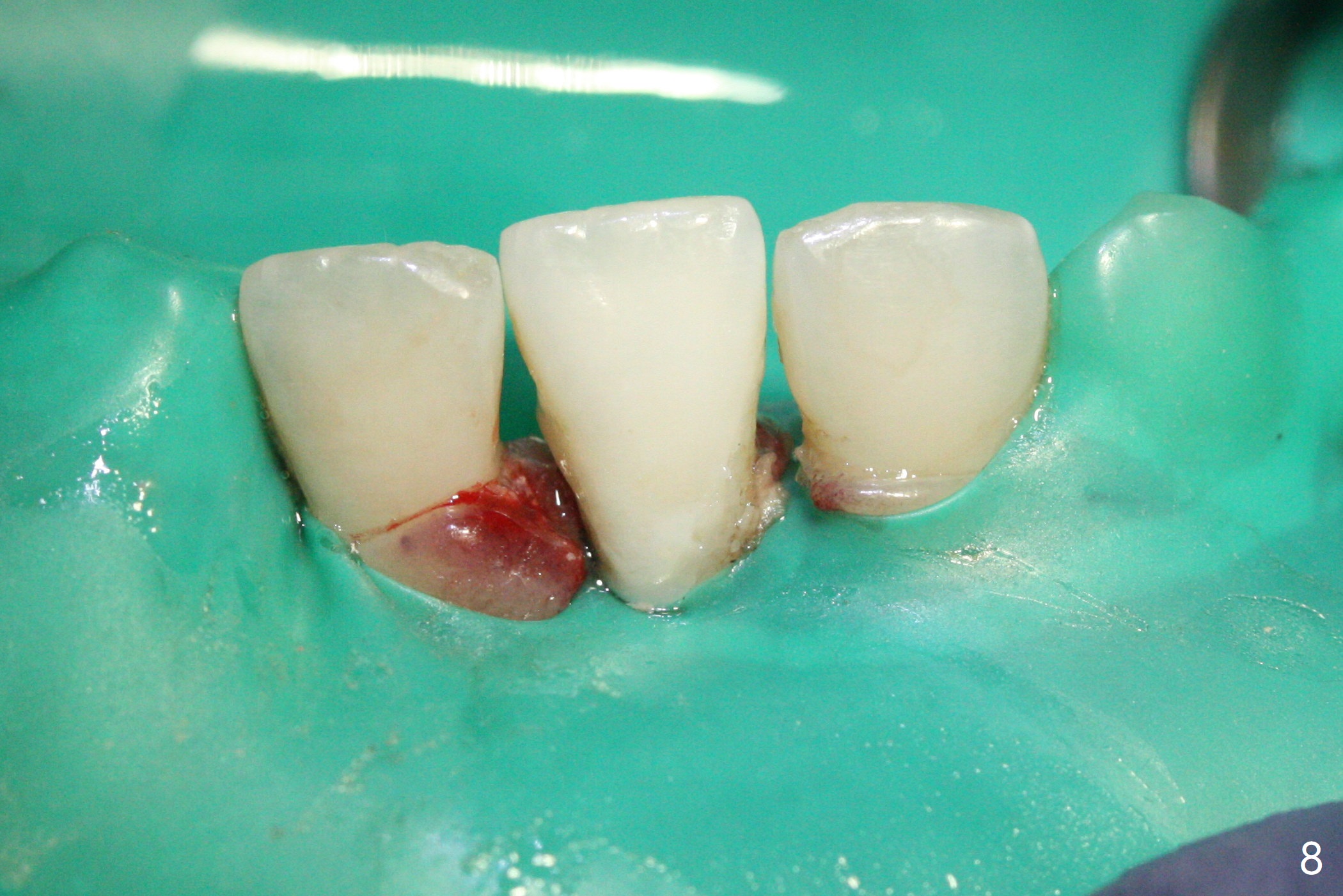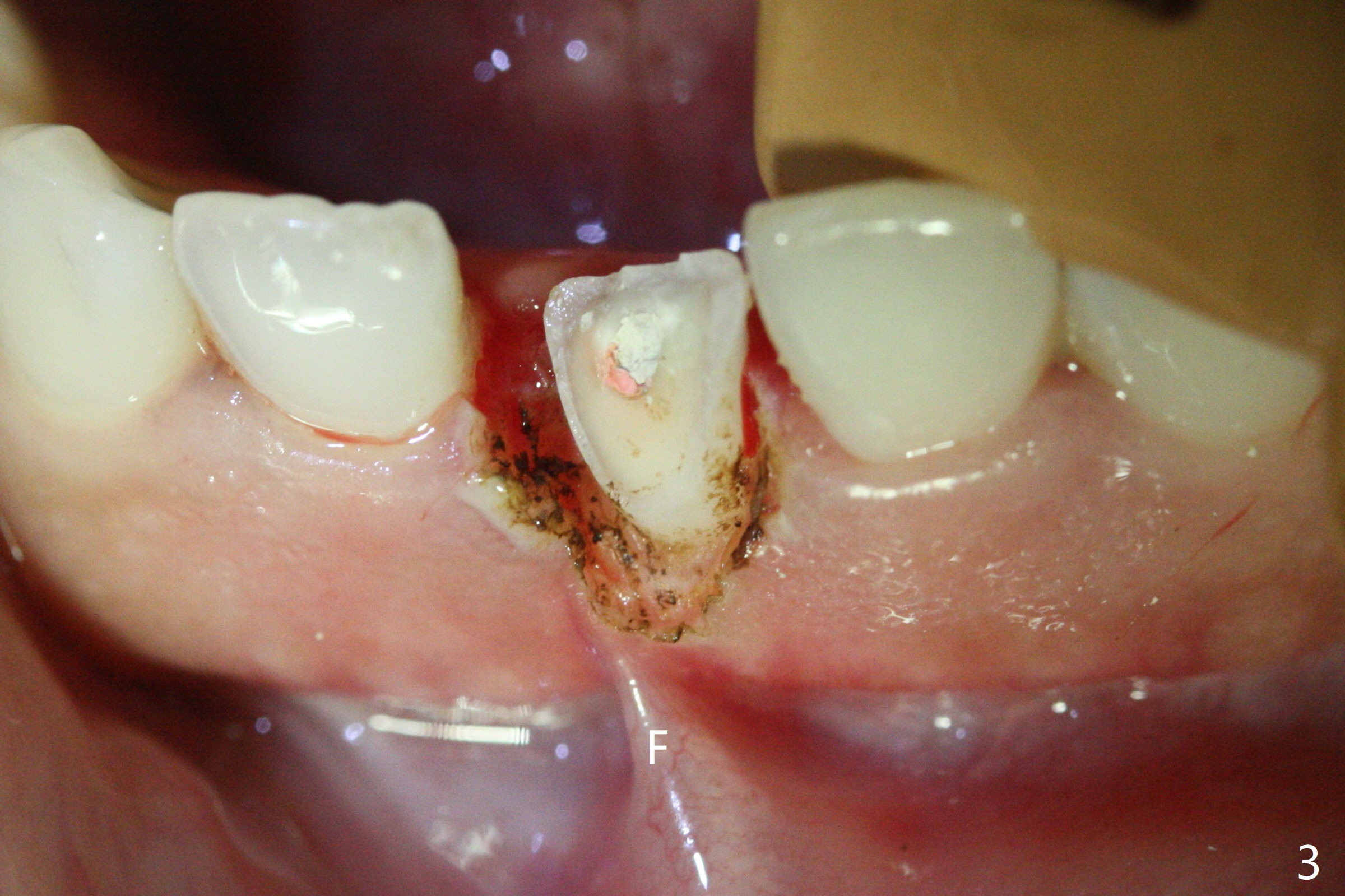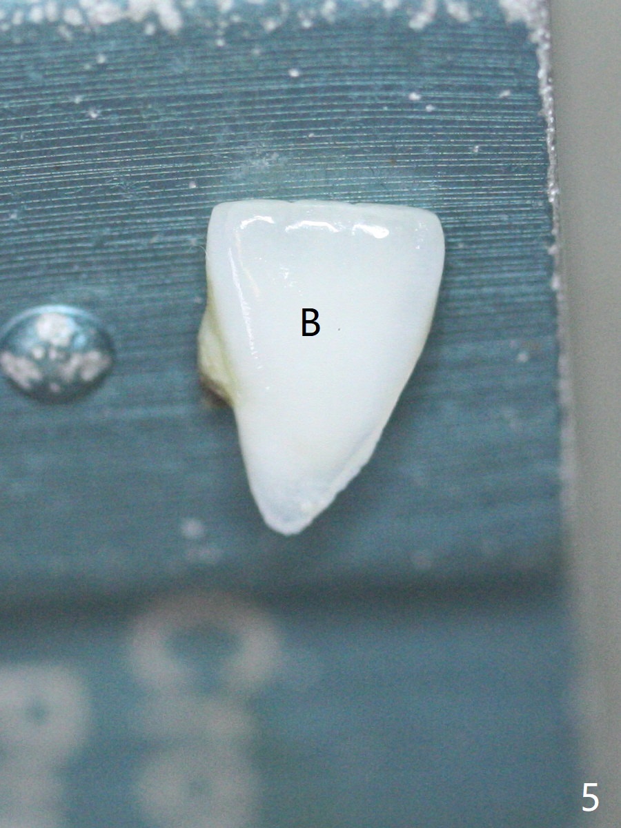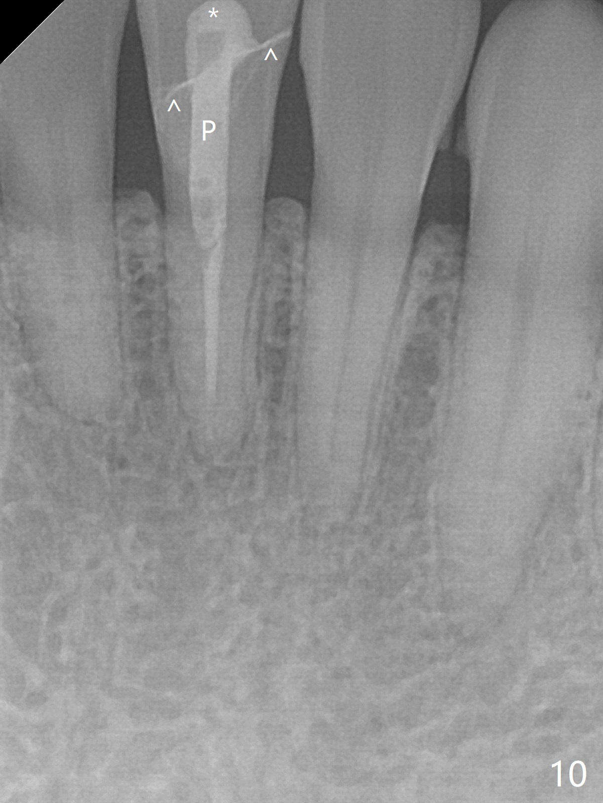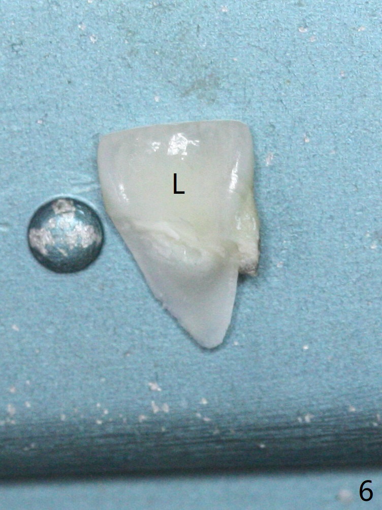 A 31-year-old woman fractured the lower left central incisor when it was hit by her 2-year-old son's head with mesiobuccal subgingival margin (Fig.1). After RCT (Fig.2), gingivectomy is conducted with eletrosurg to expose the fractured margin (Fig.3). In 2 days, a prefabricated fiber post will be bonded with the tooth and the fractured fragment together. To extend the use of the incisor, two implants are required (Fig.4). As scheduled, the patient returns with the fractured portion (Fig.5,6 (buccal (B) and lingual (L) views)). The periodontal dressing is in place (Fig.7 P). After preparation of the post space, the fiber post (Fig.10 (P)) is bonded with resin cement (Fig. 10 ^ and *) to the tooth and fragment with rubber dam (Fig.8). The patient is pleased post occlusal adjustment (Fig.9).