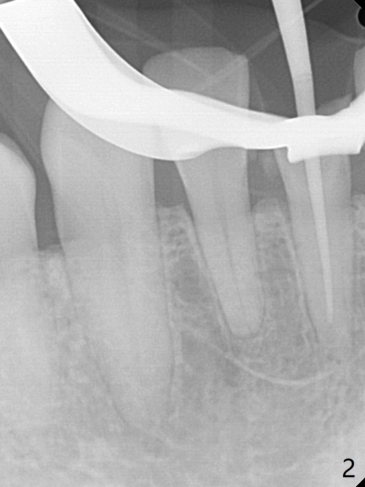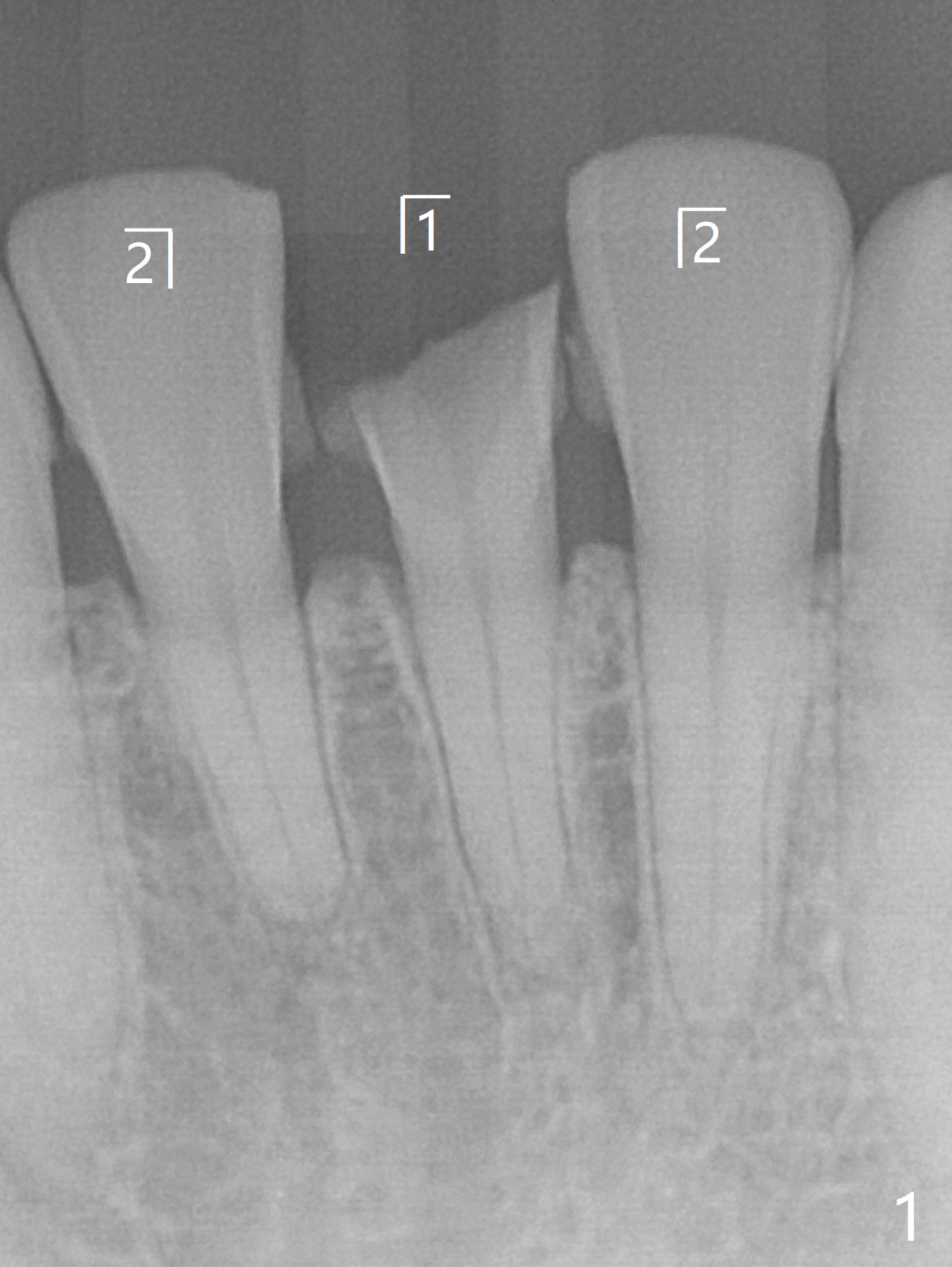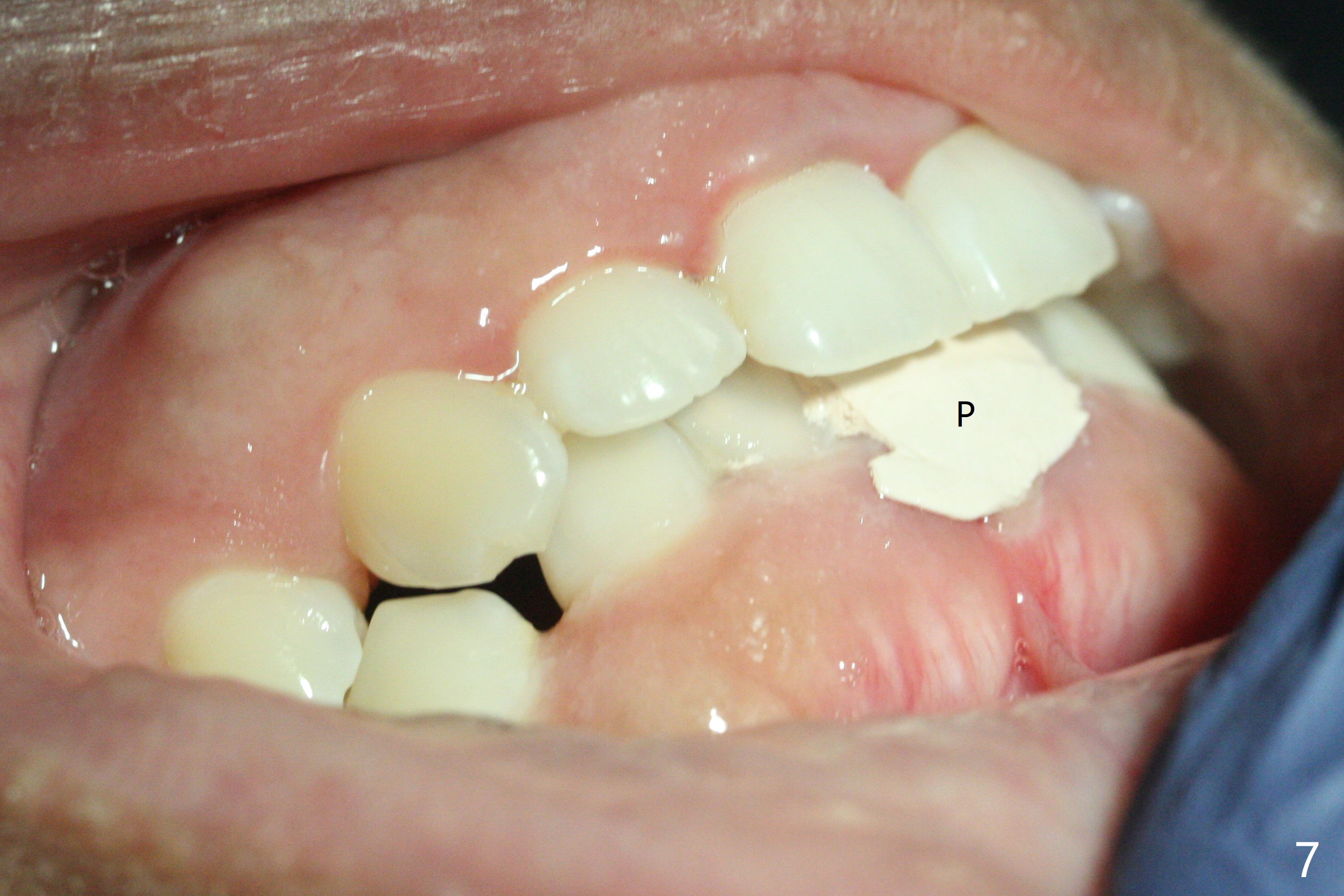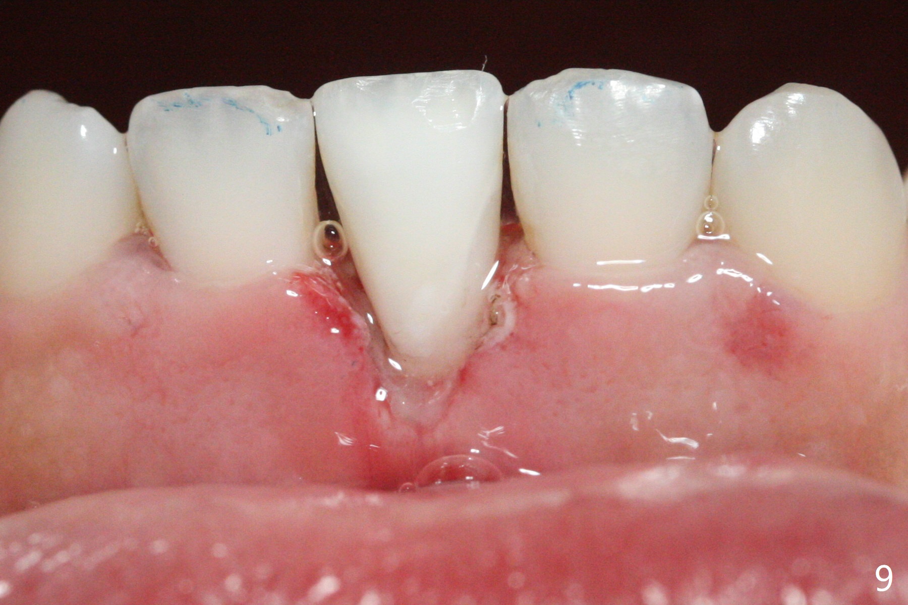 A 31-year-old woman fractured the lower left central incisor when it was hit by her 2-year-old son's head with mesiobuccal subgingival margin (Fig.1). After RCT (Fig.2), gingivectomy is conducted with eletrosurg to expose the fractured margin (Fig.3). In 2 days, a prefabricated fiber post will be bonded with the tooth and the fractured fragment together. To extend the use of the incisor, two implants are required (Fig.4). As scheduled, the patient returns with the fractured portion (Fig.5,6 (buccal (B) and lingual (L) views)). The periodontal dressing is in place (Fig.7 P). After preparation of the post space, the fiber post (Fig.10 (P)) is bonded with resin cement (Fig. 10 ^ and *) to the tooth and fragment with rubber dam (Fig.8). The patient is pleased post occlusal adjustment (Fig.9).