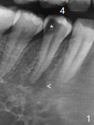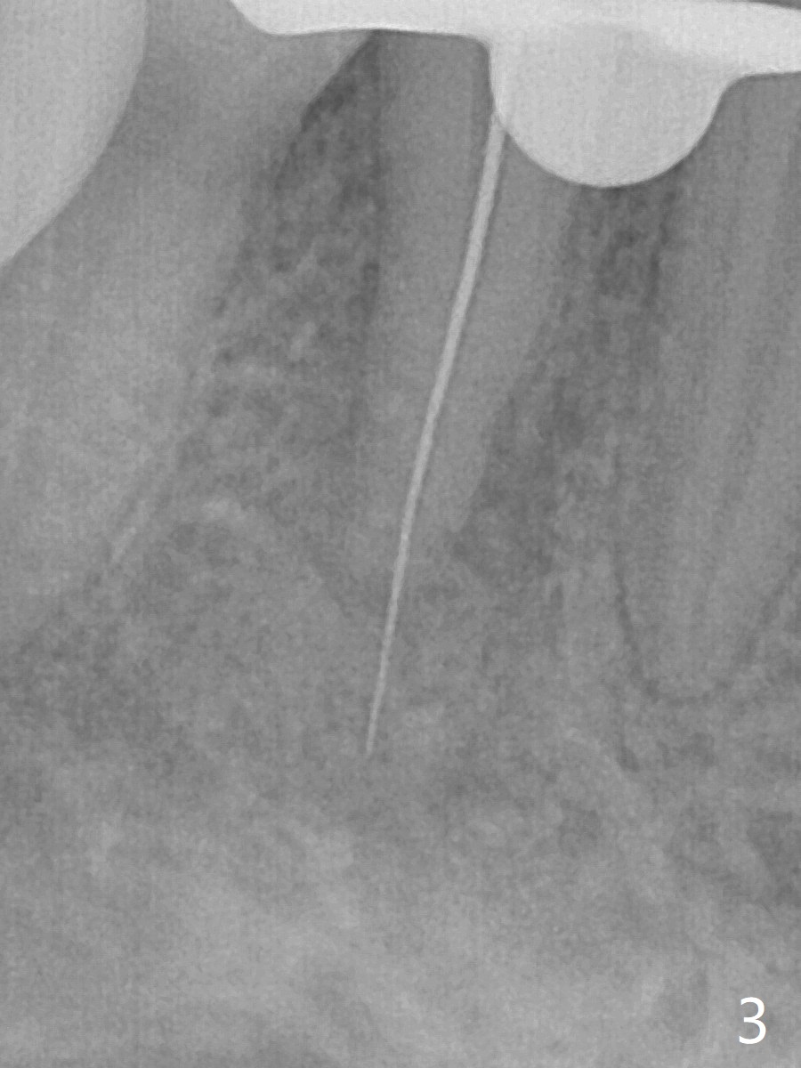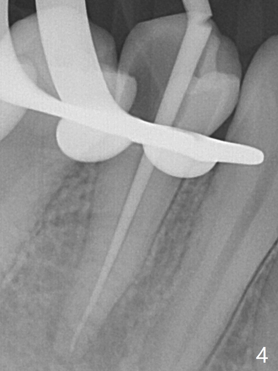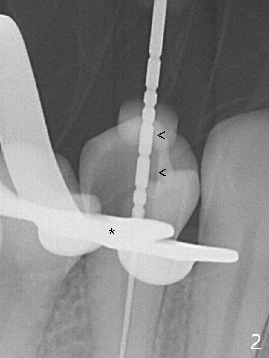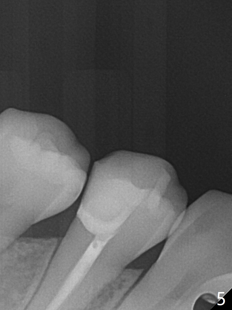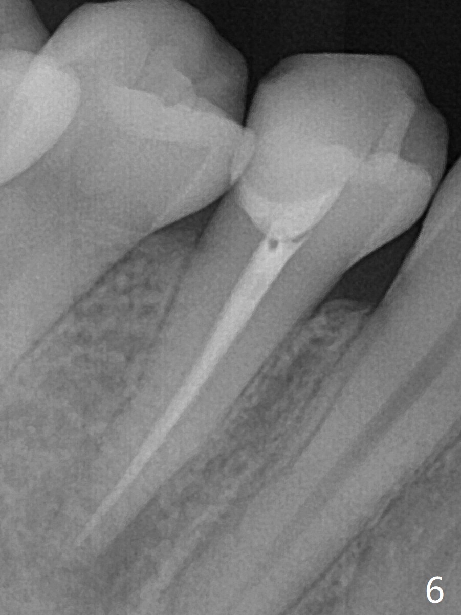 25岁硕士生,女,要求右下4补牙(图一:第一前磨牙),经过解释,欣然接受根管治疗。后者要领基本四条:无菌,根管笔直通畅,使用根尖定位仪和旋转式锥形扩大针和锥形牙胶尖。为了无菌,局麻后常规使用橡皮障(图二 *)。防止断针,尤其是旋转式锥形扩大针,根管治疗开口尽量大(图二箭头),保持扩大针笔直。开始根尖定位仪有点毛病,使用15号锉测定根管长度,不小心超越根尖大约3毫米(图三)。后来倒退4毫米,并得到根尖定位仪证实,主牙胶尖(30/.06)好像长度合适(图四),反复冲洗,最后再插入一个细牙胶尖一次性完成根管治疗和补牙(图五,六)。