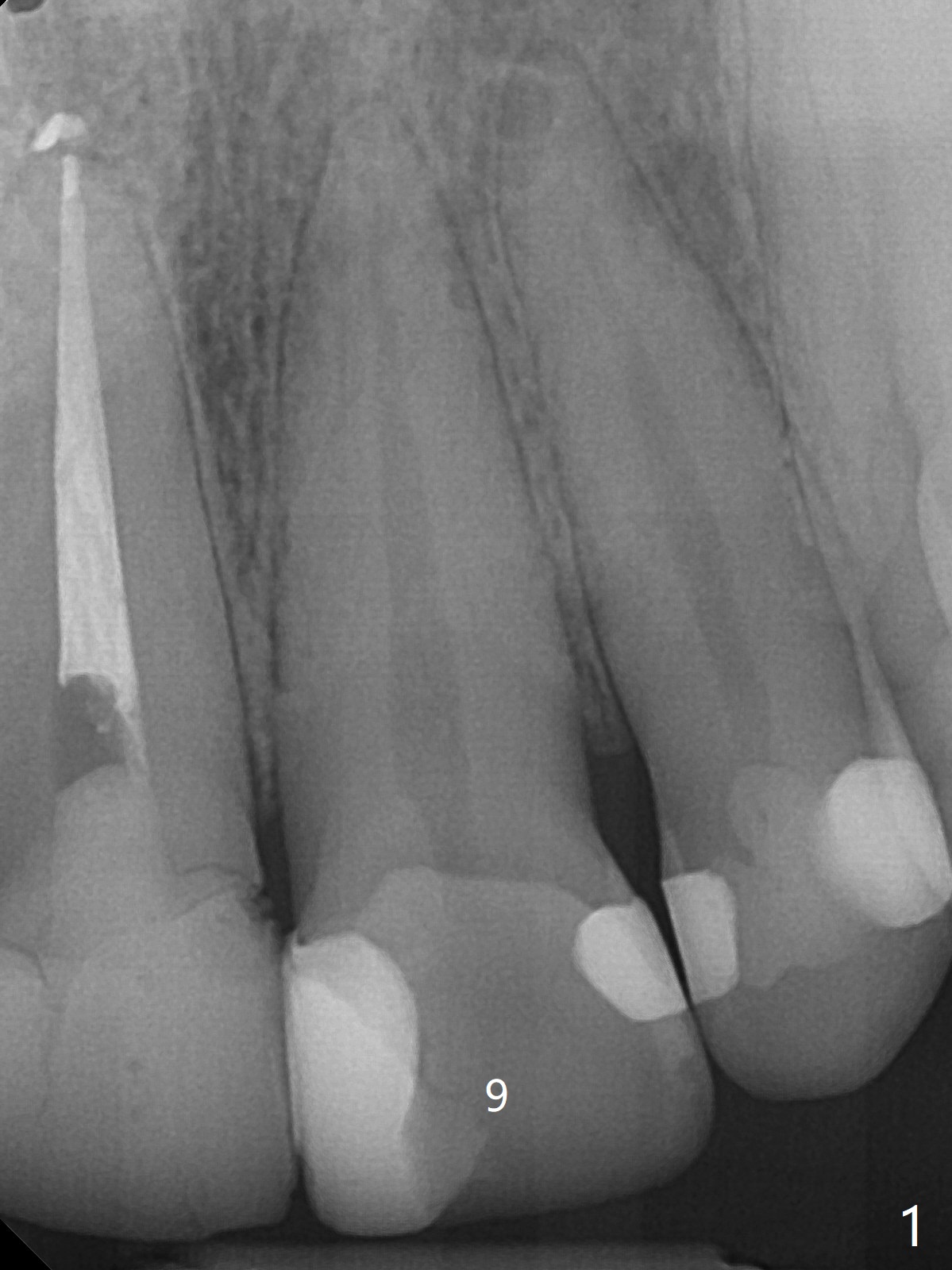 36岁女,9号牙树脂修补多次(图一),最近对冷热敏感,计划牙冠制备(如果不再敏感,再约一次与8号牙一起制备取模;如果敏感,9号牙根管治疗),使用Polycarbonate
