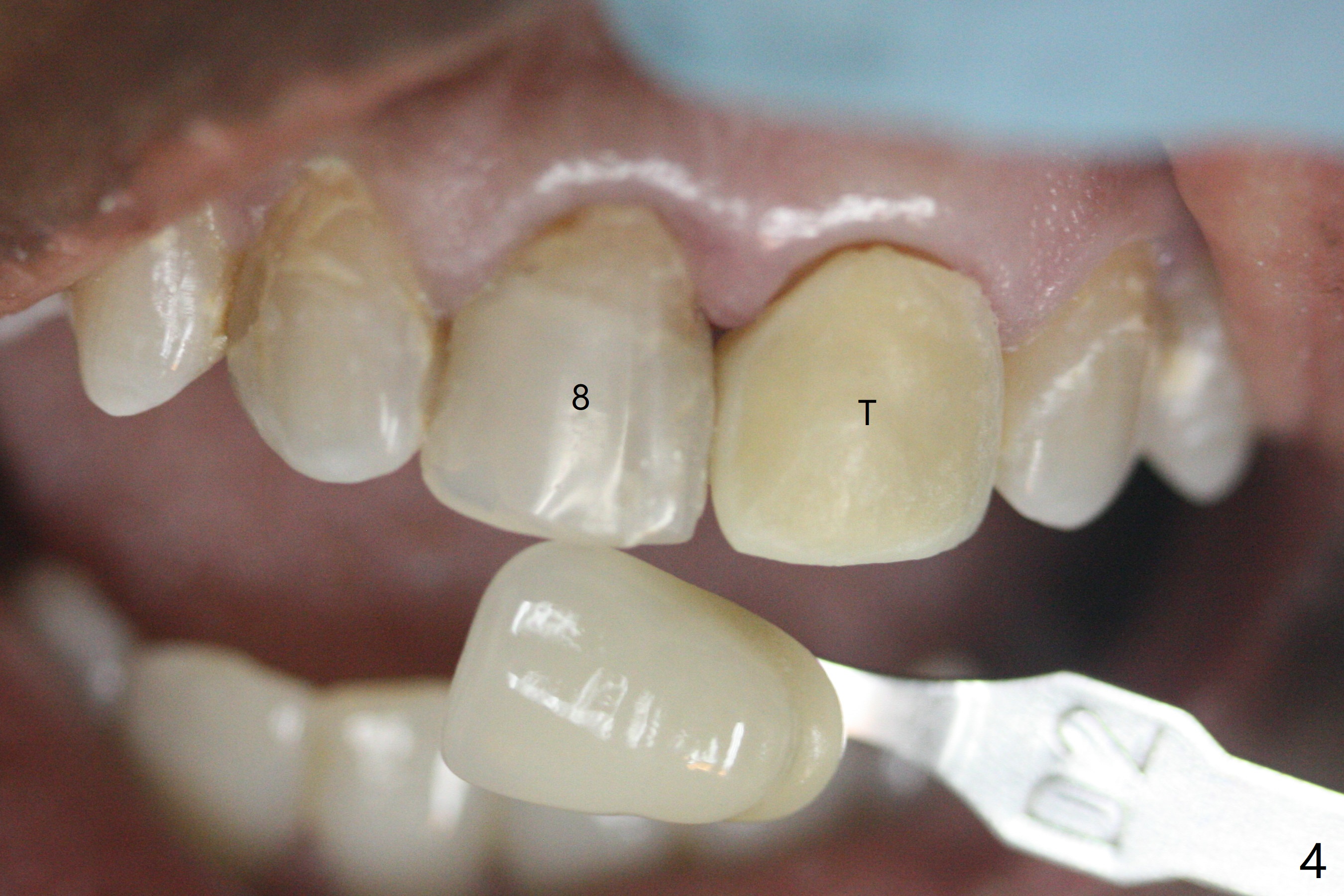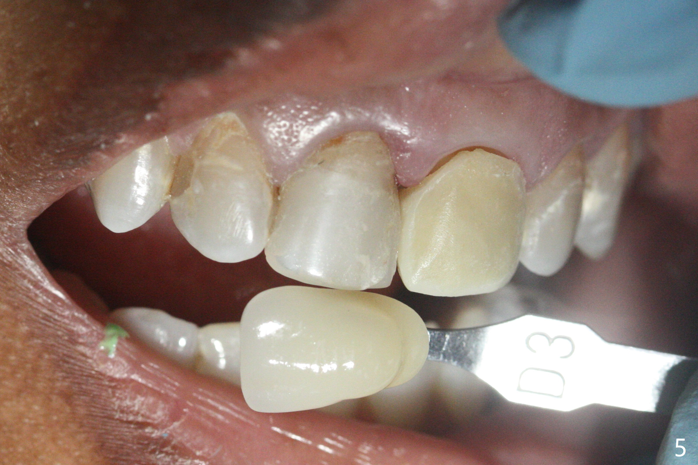 (D3)做内衬里)做临时牙冠。由于前者显得黄,而病人牙齿灰,她突然不满意,后来我们把临时牙冠表面磨掉,用Temporary